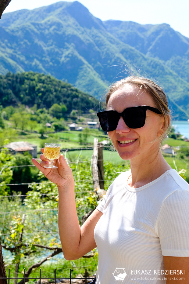 Łódka płynie dosyć wolno dzięki czemu, możemy podziwiać okolice i niesamowite widoki. Zieleń otaczających nas gór kontrastuje z błękitem wody jeziora. To nie są turystyczne łódki. Mieszkańcy wykorzystują je codziennie do transportu, a turyści oglądają widoczki. Co jakiś czas dobijamy do brzegu, bo ktoś z miejscowych wysiada z zakupami. Czasami wydawać by się mogło, że pośrodku niczego. Wysiedliśmy niedaleko Peace Island. Pomimo że było jeszcze wcześnie, to gospodarze przywitali nas pyszna swojską rakiją. No j jak tu nie spróbować?