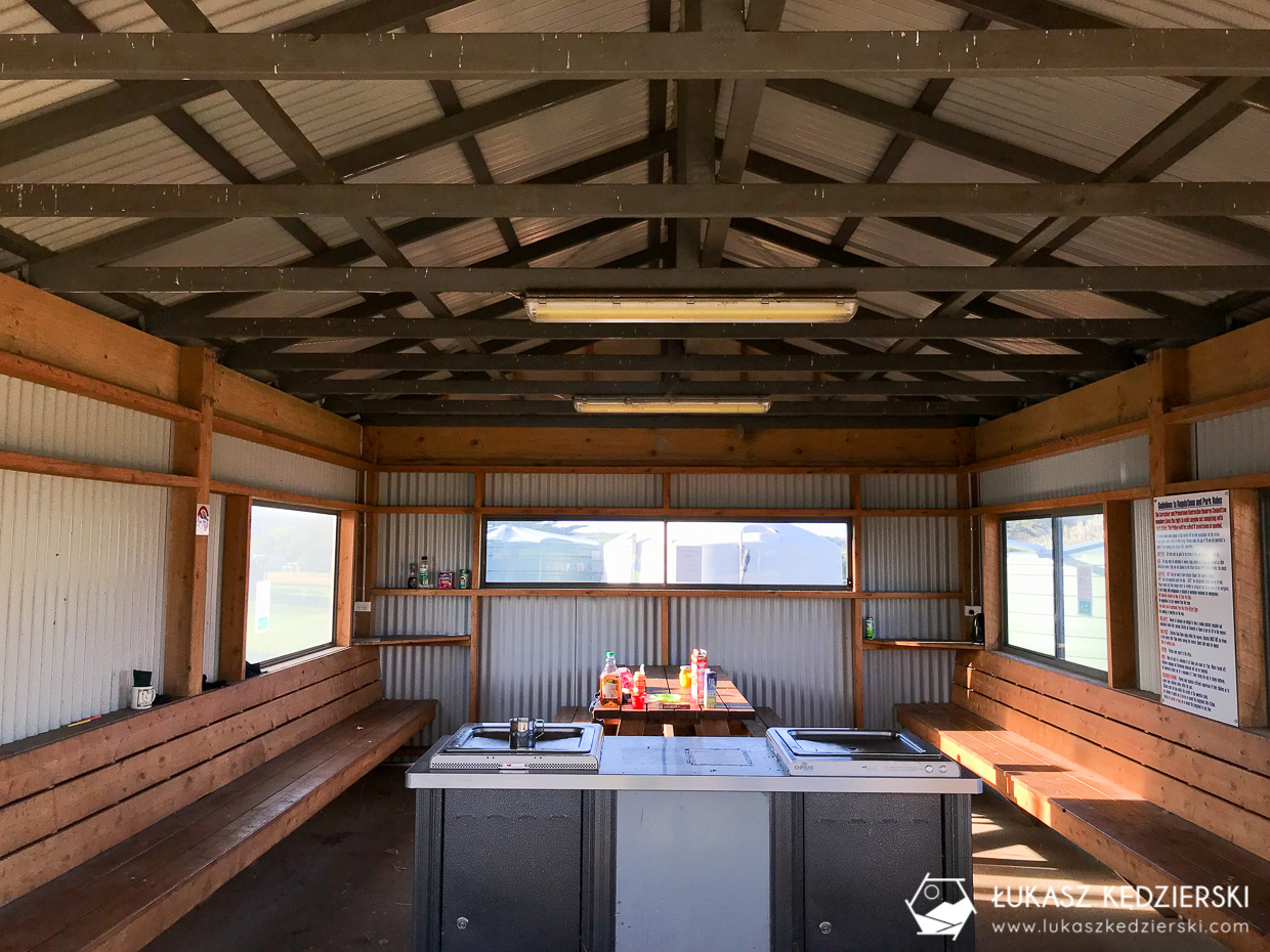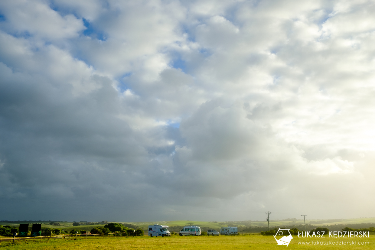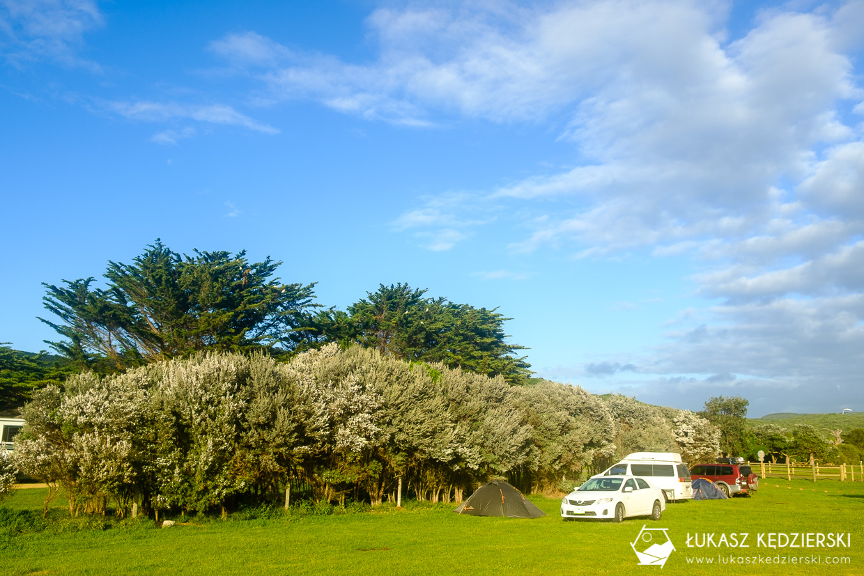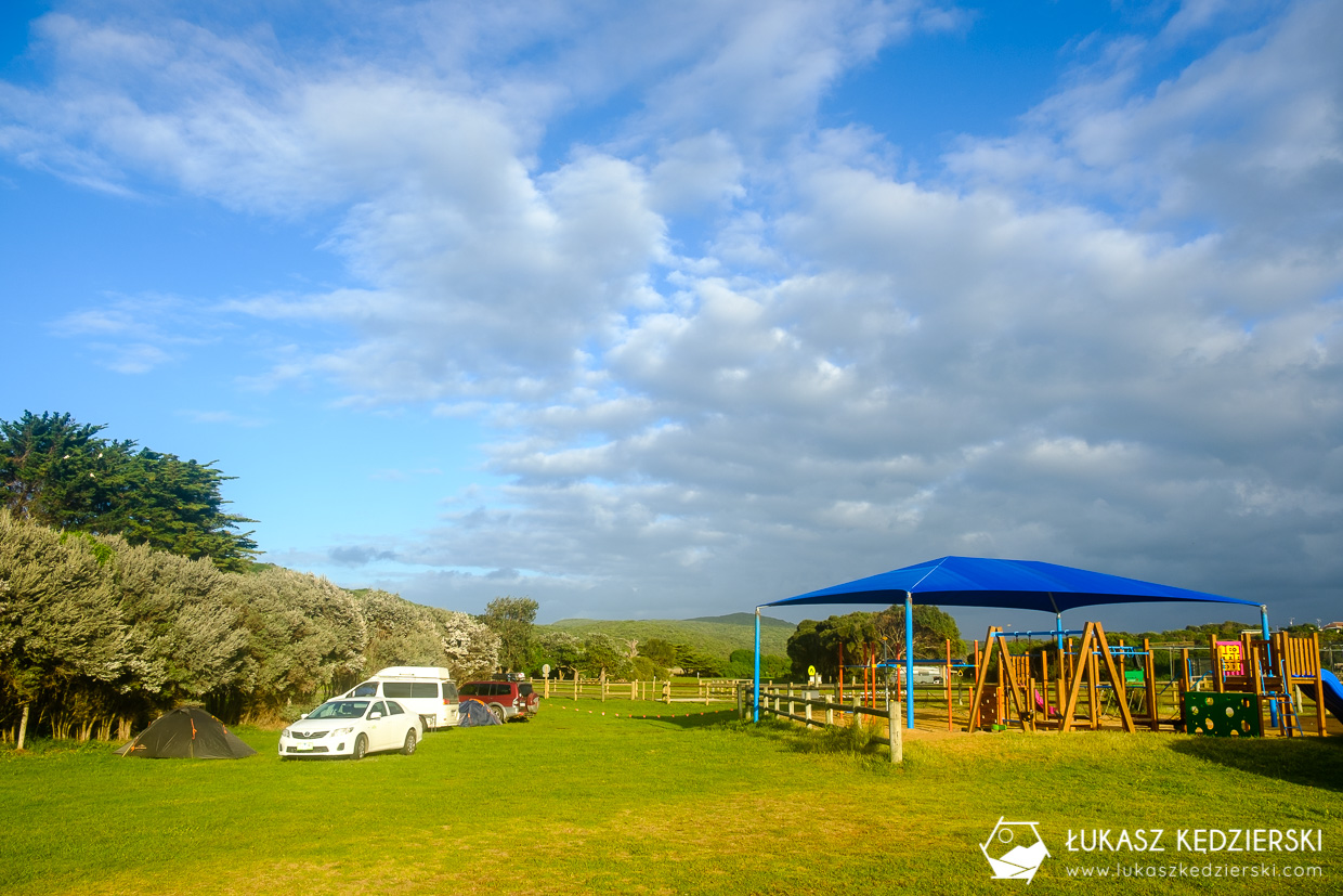 Podczas podróży drogą chcieliśmy spać możliwie najbliżej 12 Apostołów, aby móc pojechać na wschód i zachód słońca. Dlatego wybraliśmy kemping Princetown Recreation Reserve położony ok. 7 km na uboczu głównej drogi z pięknym widokiem. Kemping jest obszerny z dużą ilością miejsca pod rozbicie własnego namiotu lub postawienia kampera. Do dyspozycji są łazienki z prysznicami z ciepłą wodą, zadaszona jadalnia z grillami. Dookoła mnóstwo ptactwa i kangurów, na które trzeba bardzo uważać, jeżdżąc po zmroku. Koszt to 15 AUD za osobę + 5 AUD za każdą kolejną osobę w samochodzie dla miejsca pod rozbicie namiotu bez dostępu do prądu lub 20 AUD za osobę + 5 AUD za każdą kolejną za miejsce z podłączeniem do prądu. Płatność tylko gotówką. Na kempingu nie ma WiFi.