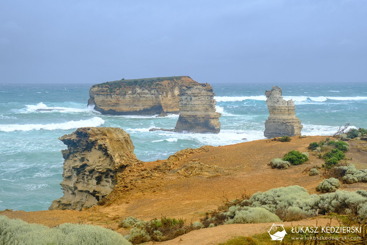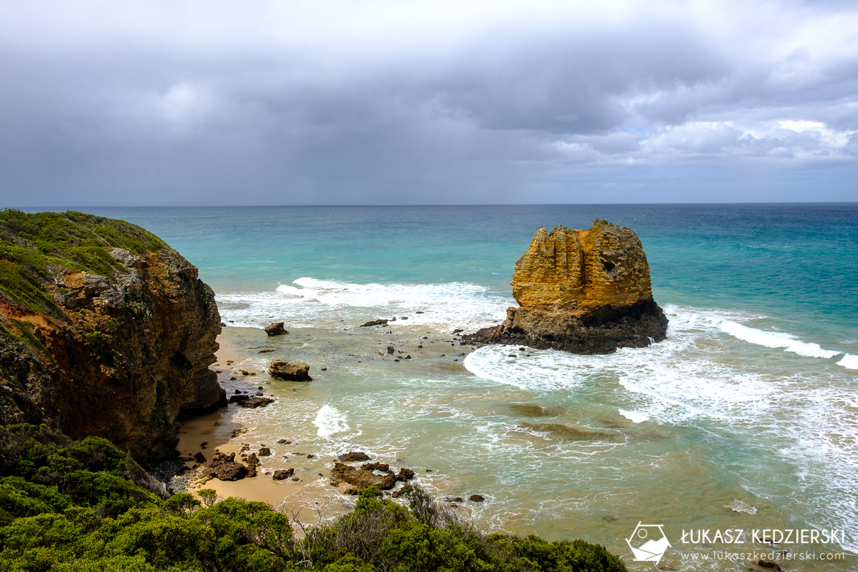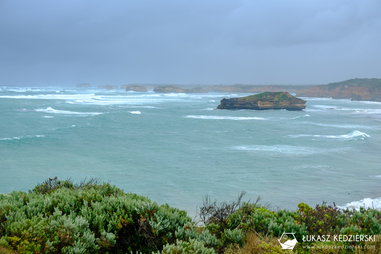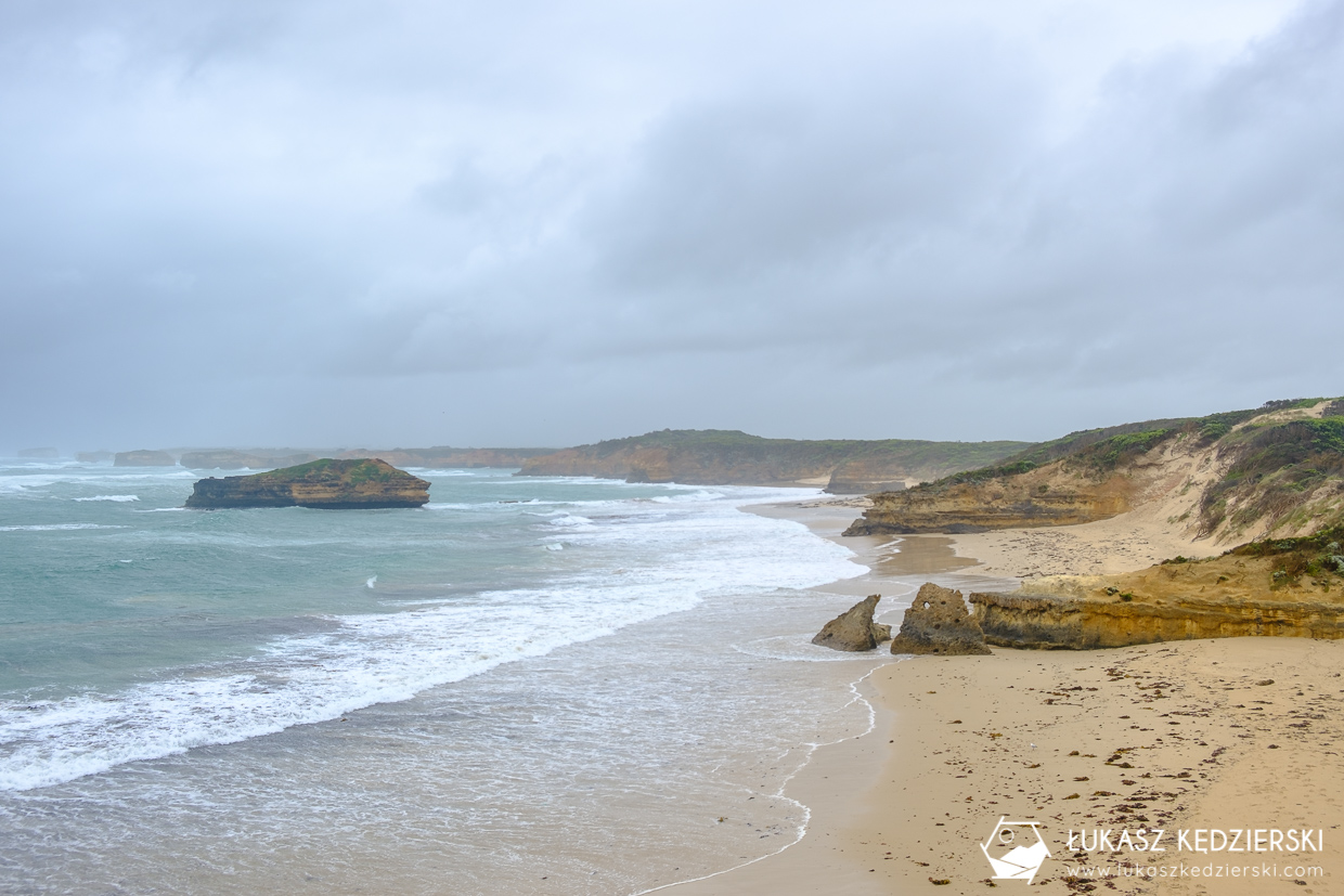 To ostatnie miejsce, jakie zobaczyliśmy na słynnej Great Ocean Road. Ubolewamy nad tym, że widzieliśmy je w bardzo deszczowej scenerii, a widoczność również była mocno ograniczona. Wyobrażamy sobie, że w pełnej krasie jest niesamowita. W tle majaczą wapienne mini wysepki, do tego poszarpana linia brzegowa, fale i kolor wody. Brzmi jak miejsce z niezliczoną ilością kadrów do zarejestrowania.