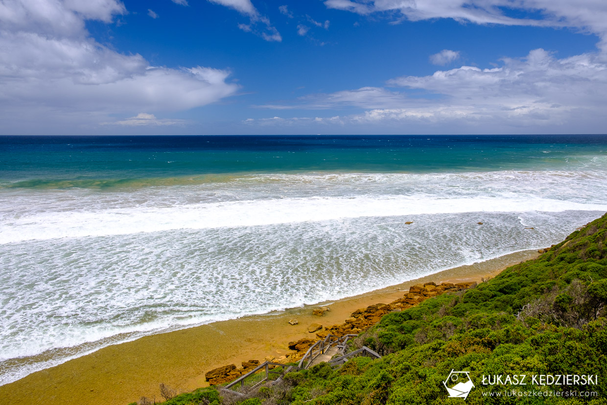 Zaraz za miasteczkiem Torquay znajduje się piękna plaża. Możemy ją podziwiać z przygotowanego punktu widokowego, a także możemy zejść na plażę po schodach. To podobno niesamowite miejsce dla surferów. Do tego stopnia, że w święta wielkanocne na tej plaży odbywają się renomowane zawody surferskie Rip Curl Pro.