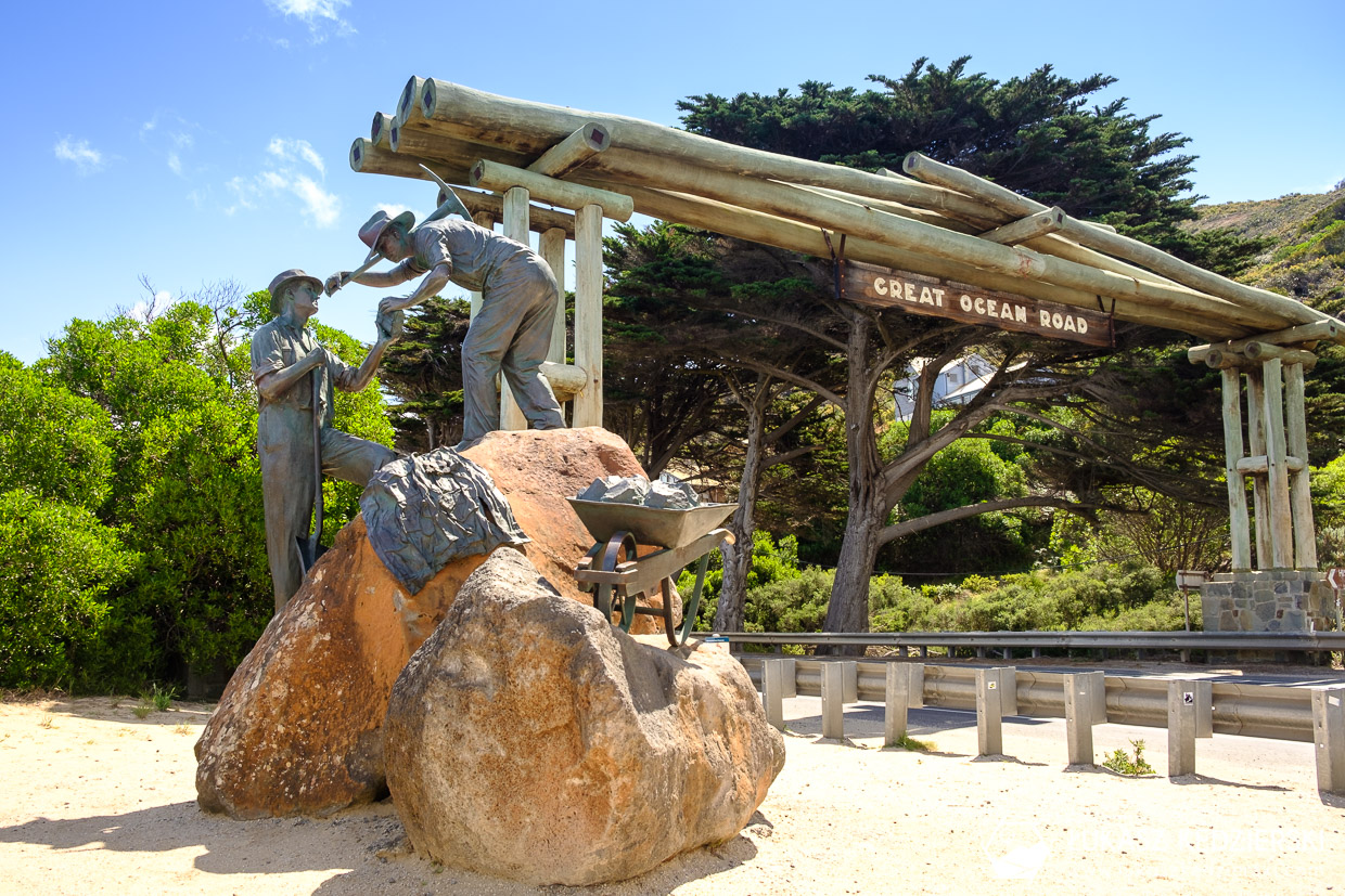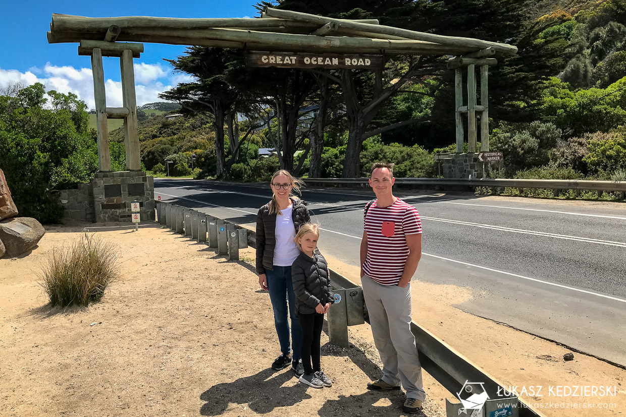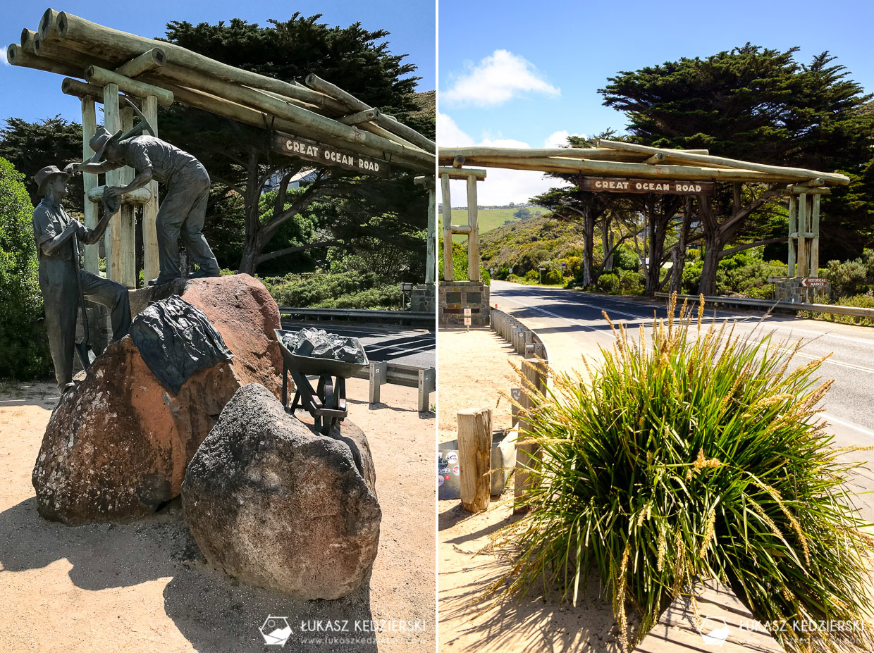 Dopiero teraz, po przejechaniu ponad 30 km od miasteczka Torquay, gdzie faktycznie rozpoczyna się Great Ocean Road, napotykamy słynną bramę z napisem. Już myśleliśmy, że ją gdzieś przegapiliśmy. Tutaj zatrzymuje się absolutnie każdy – niezależnie czy to autokarowa wycieczka, czy prywatny tour. Każdy chce mieć tu zdjęcie. Brama stanowi upamiętnienie tych, co walczyli i zginęli podczas I-wszej Wojny Światowej oraz budowniczych drogi.