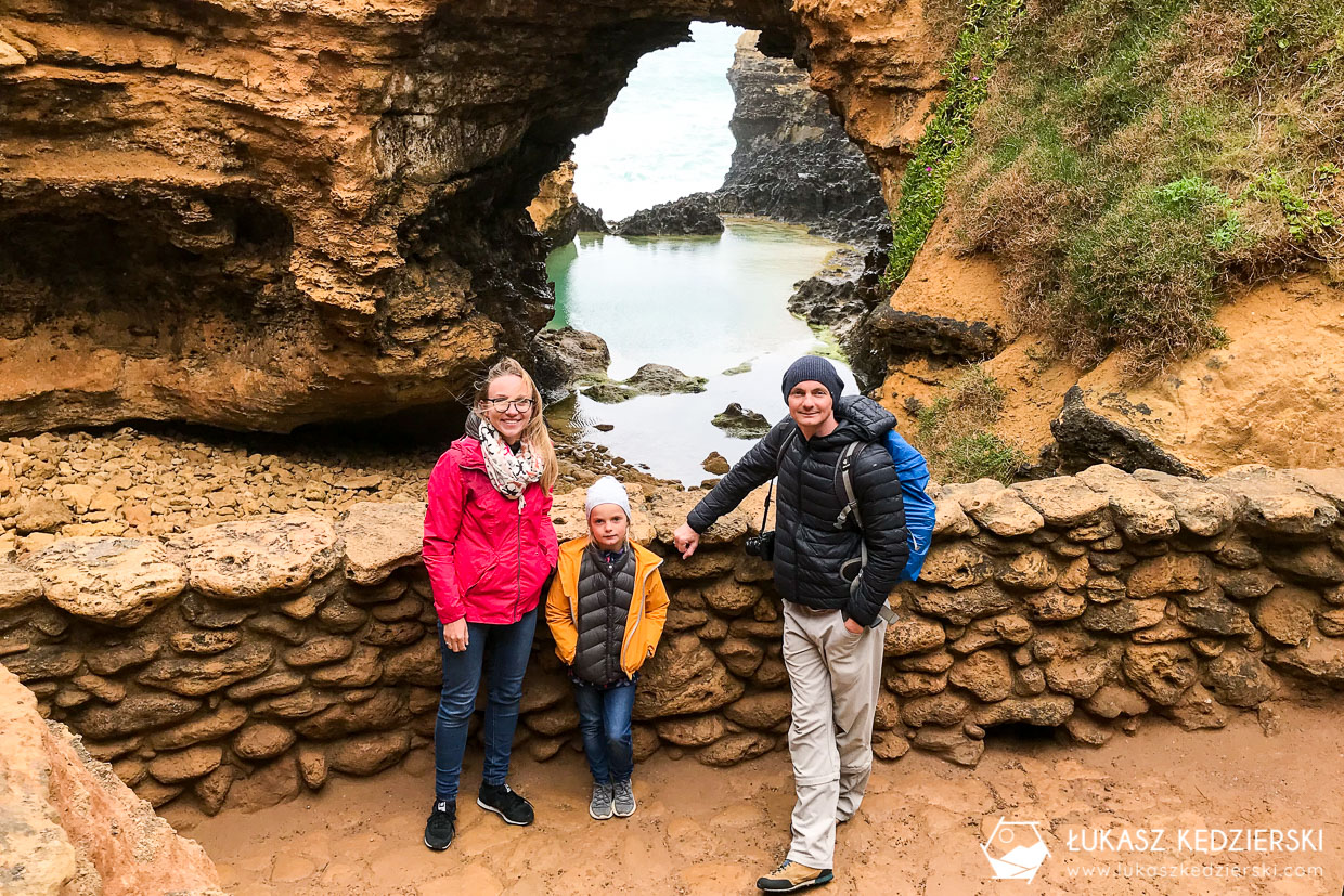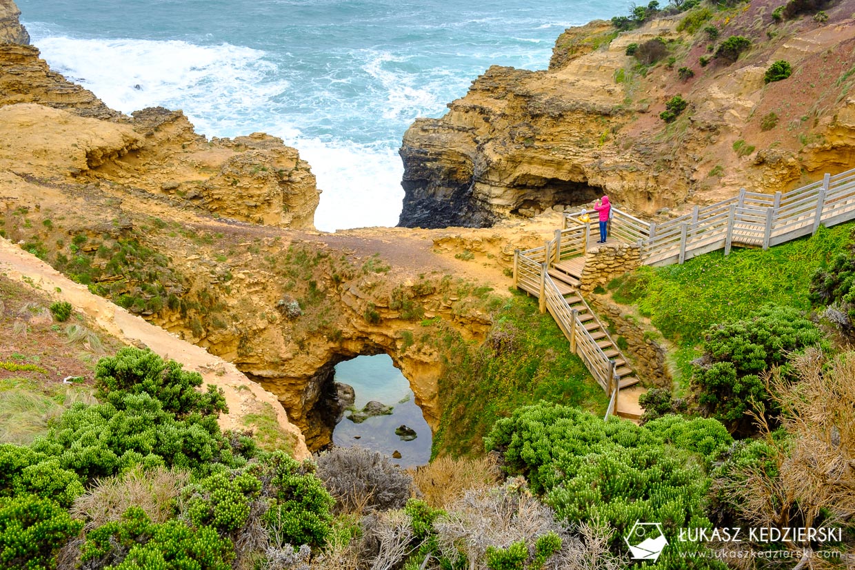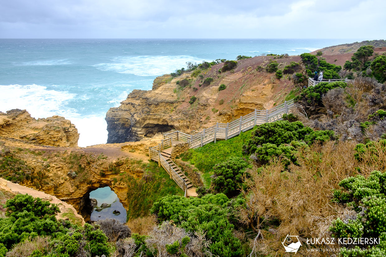 Bardzo nam się spodobało The Grotto. Po drewnianych schodach idzie się do podnóży grubego łuku skalnego, który pewnie dawno temu był kiedyś jaskinią. Jego środkiem wpływają wzburzone wody oceanu. Całość ma kolor pomarańczowo-czerwony. Jak napiszę, że to kolejne przepiękne miejsce na Great Ocean Road to mi pewnie nie uwierzycie, ale tak tu właśnie jest.