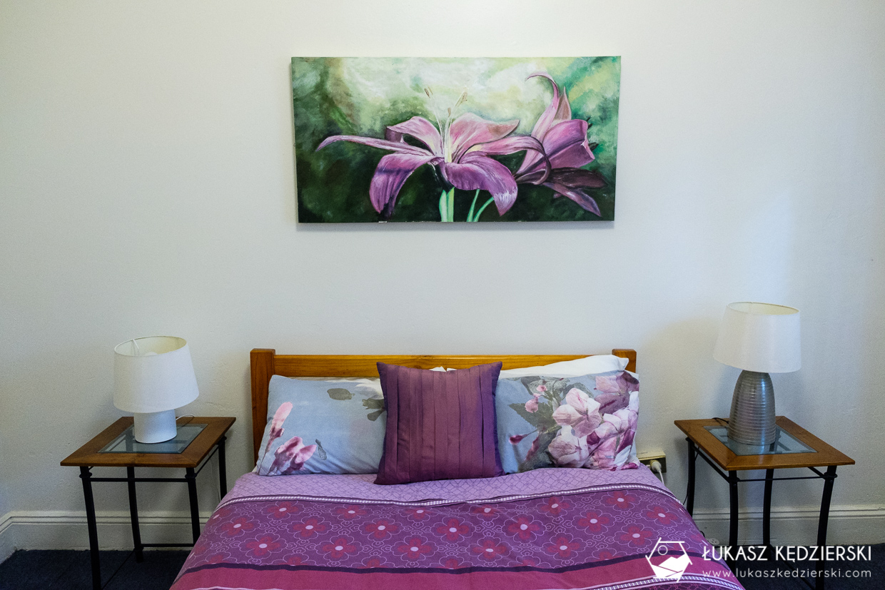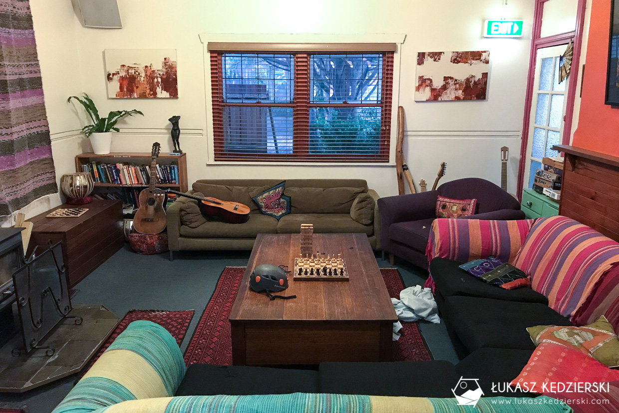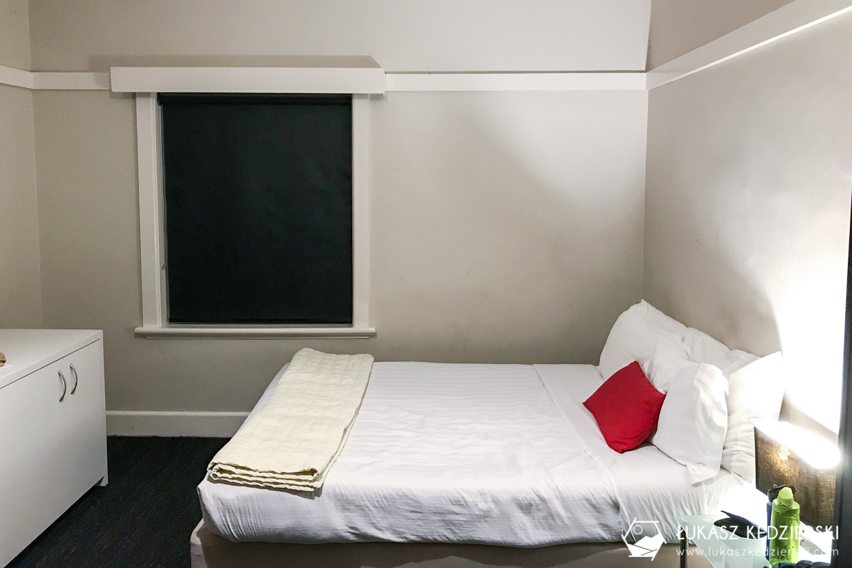 Do dyspozycji mieliśmy skromny pokój z wielkim łóżkiem i stolikiem oraz dużym oknem. Dosyć mała łazienka (2 prysznice oraz 2 toalety) była na korytarzu – osobna męska i damska. Wszędzie bardzo czysto. Na I piętrze goście mieli do dyspozycji w pełni wyposażoną kuchnię oraz salon do wypoczynku. Rano w kuchni były wystawione podstawowe produkty na śniadanie: chleb tostowy, dżem, masło orzechowe, vegemite, płatki śniadaniowe, mleko. W niedzielę serwowane były naleśniki. Do dyspozycji kawa, herbata oraz filtrowana woda. Niestety WiFi działało bardzo słabo. Momentami graniczyło z cudem, aby wejść na jakąkolwiek stronę.