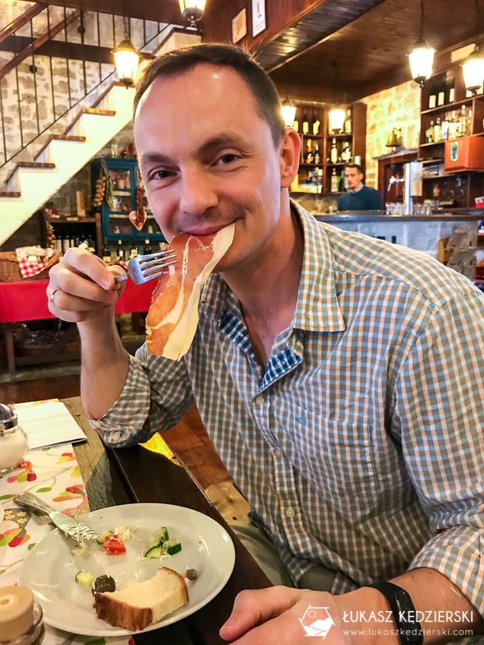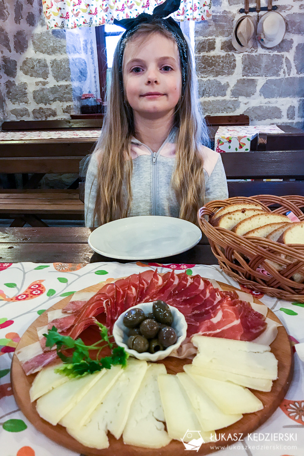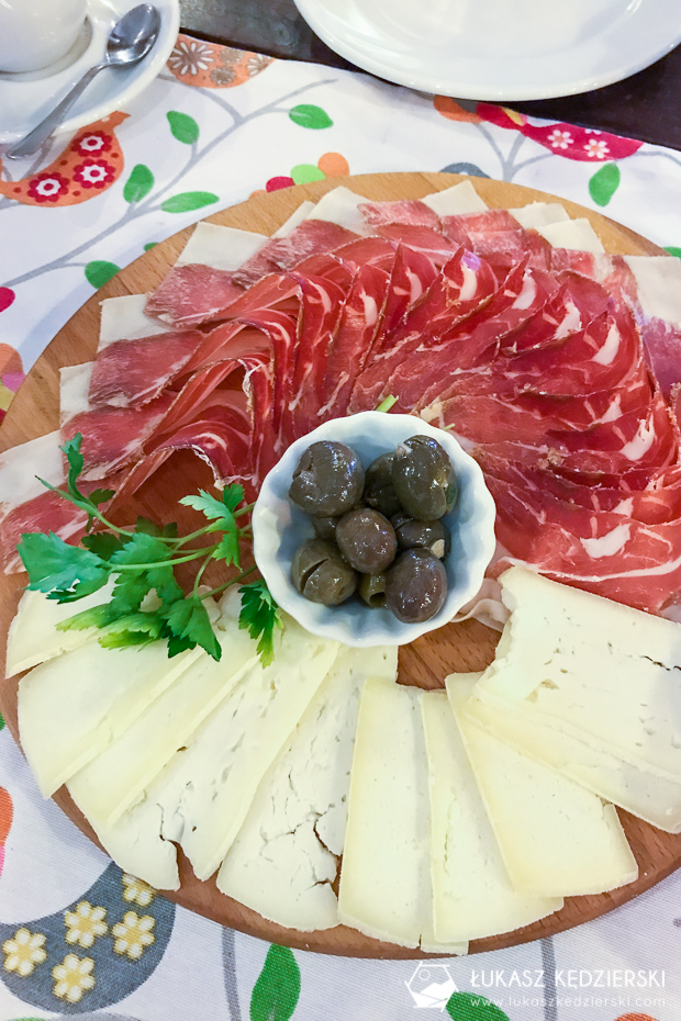 • Njeguški pršut i Njeguški sir: będąc w okolicach parku Lovcen, a dokładniej wioski Njeguši koniecznie musicie spróbować suszonej i bardzo cienko pokrojonej lokalnej szynki, która najczęściej podawana jest razem z lokalnym serem oraz oliwkami i świeżo pieczonym chlebem. Oczywiście talerz takiej szynki będziecie mogli zamówić praktycznie w całej Czarnogórze, jednak najlepiej będzie smakowała w miejscu, gdzie powstaje. Pychota. Koszt za cały talerz to ok. 10 EUR.