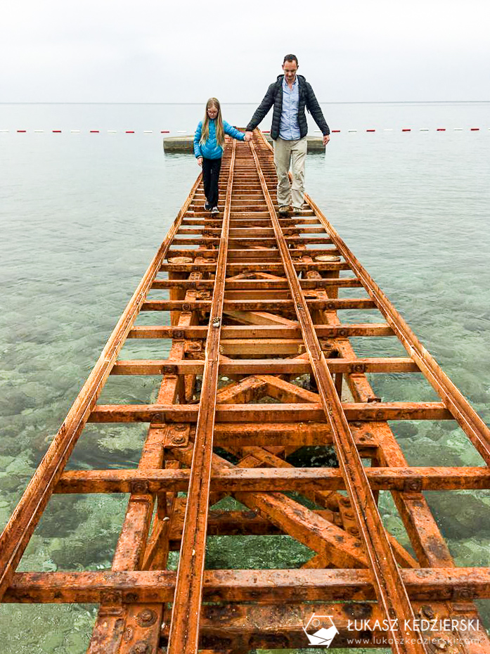 Na koniec przygody z Budvą w planach mieliśmy pójść na stare miasto, do którego prawie nie doszliśmy. Zaraz za murami po prawej stronie jest plaża i przy niej ścieżka przy skałach prowadząca do kolejnej plaży. Jest przejście przez skały, jakieś metalowe płaskowniki a później znów piękna plaża w zatoczce i znów skały aż do samego koca. Rewelacyjny spacer. Nadii podobała się wspinaczka po skałach i kluczenie po ściance nad wodą.