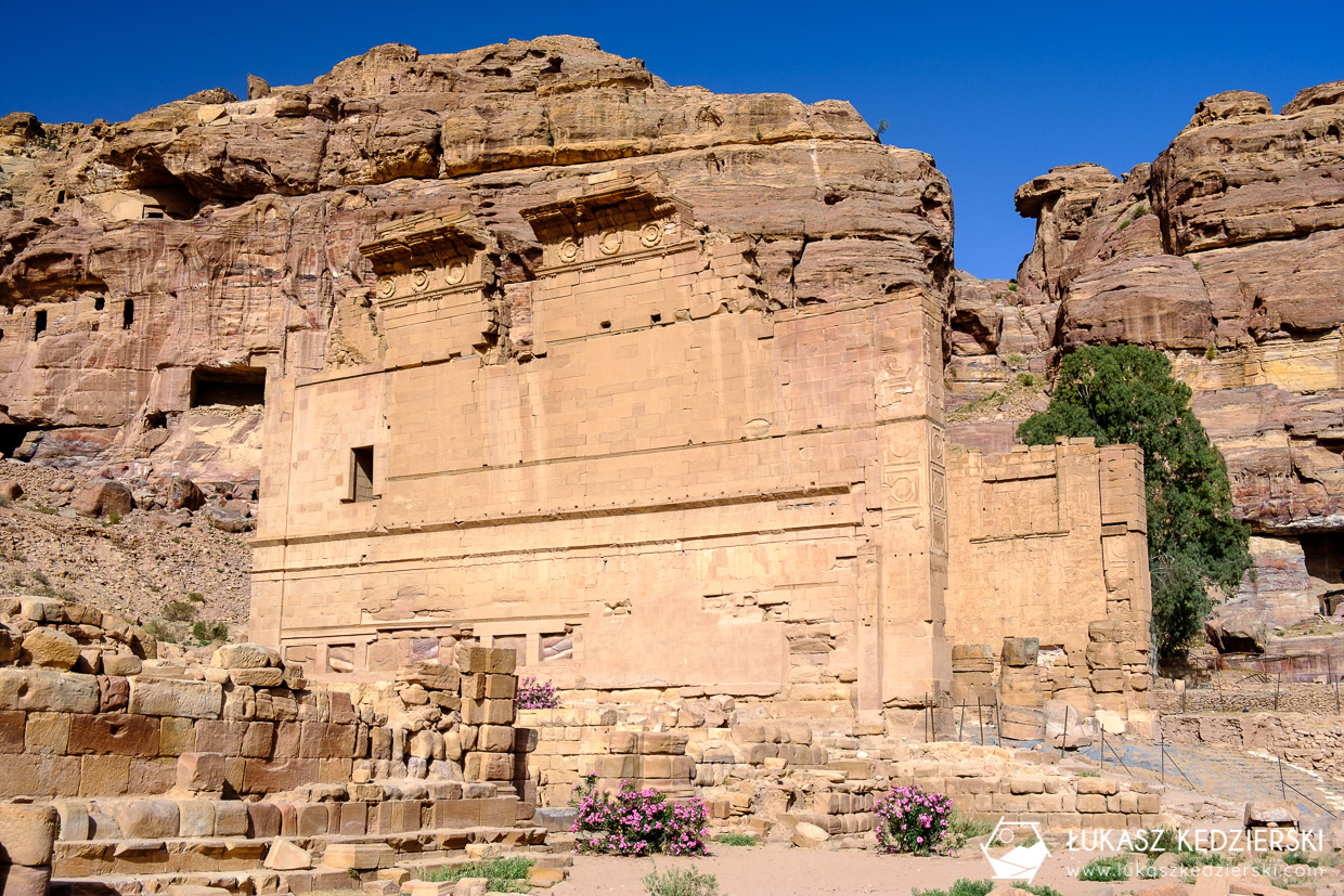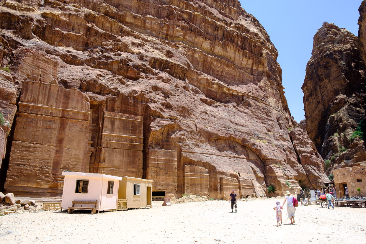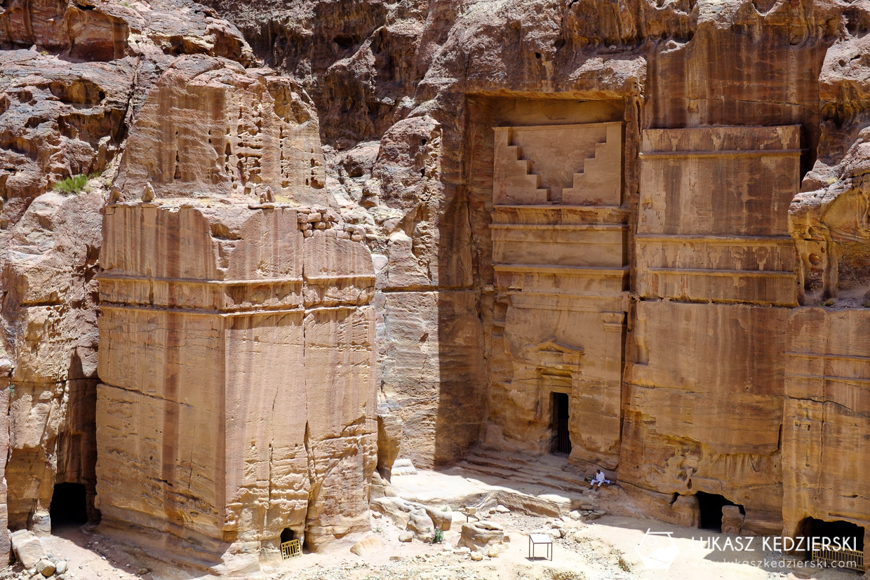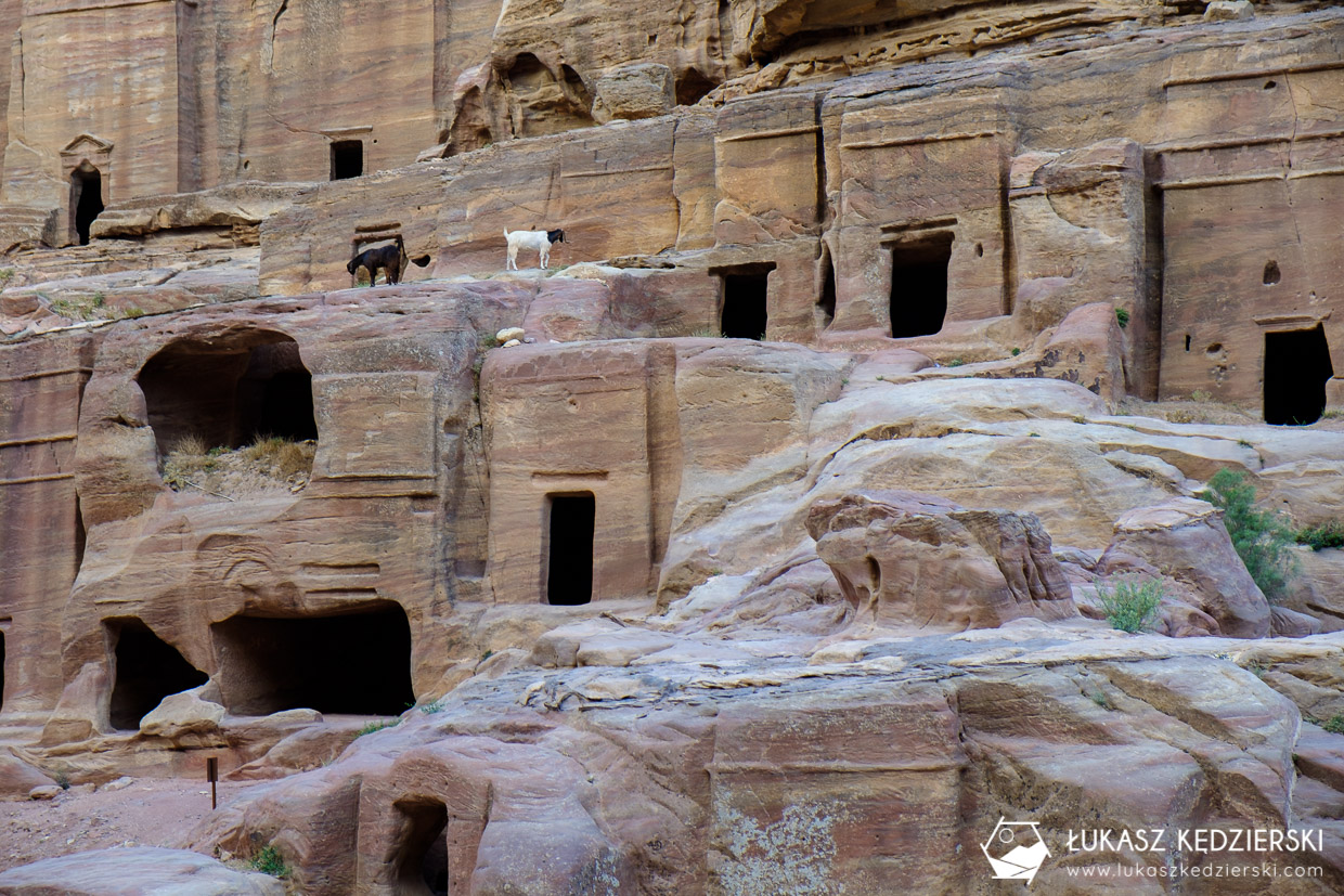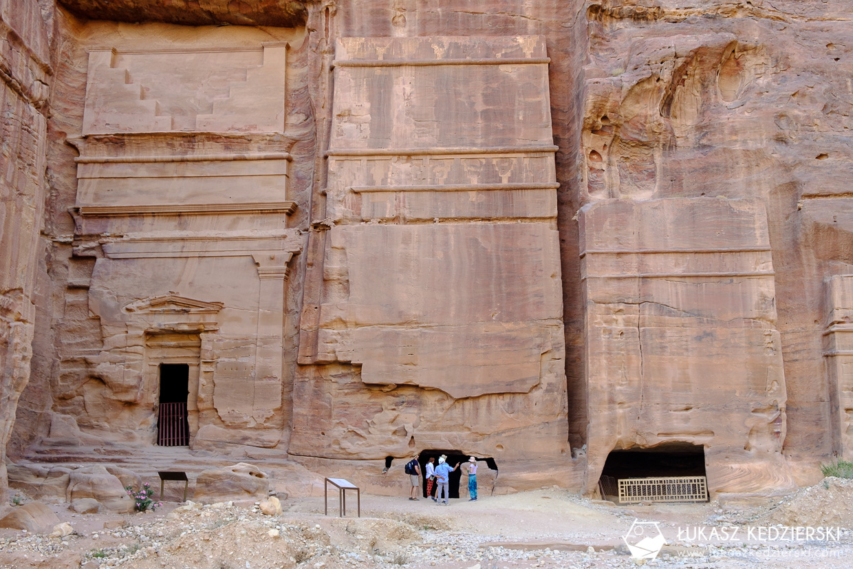 Kontynuujemy naszą wędrówkę. Kawałek dalej wchodzimy na obszerną ulicę, wzdłuż której po lewej stronie dostrzeżemy interesujące zabudowania. To fasady 44 grobowców. Podobno pochodzą z początków istnienia Petry. Mają bardzo proste formy. Płaska skała z niewielkim zdobieniem u góry (fryz blankowy) oraz wejściem do wnętrza. Warto zobaczyć ten widok z większej odległości, aby dostrzec, że zostały one zbudowane w 4 rzędach. Do niektórych można wejść do środka, a inne można podziwiać tylko z zewnątrz.