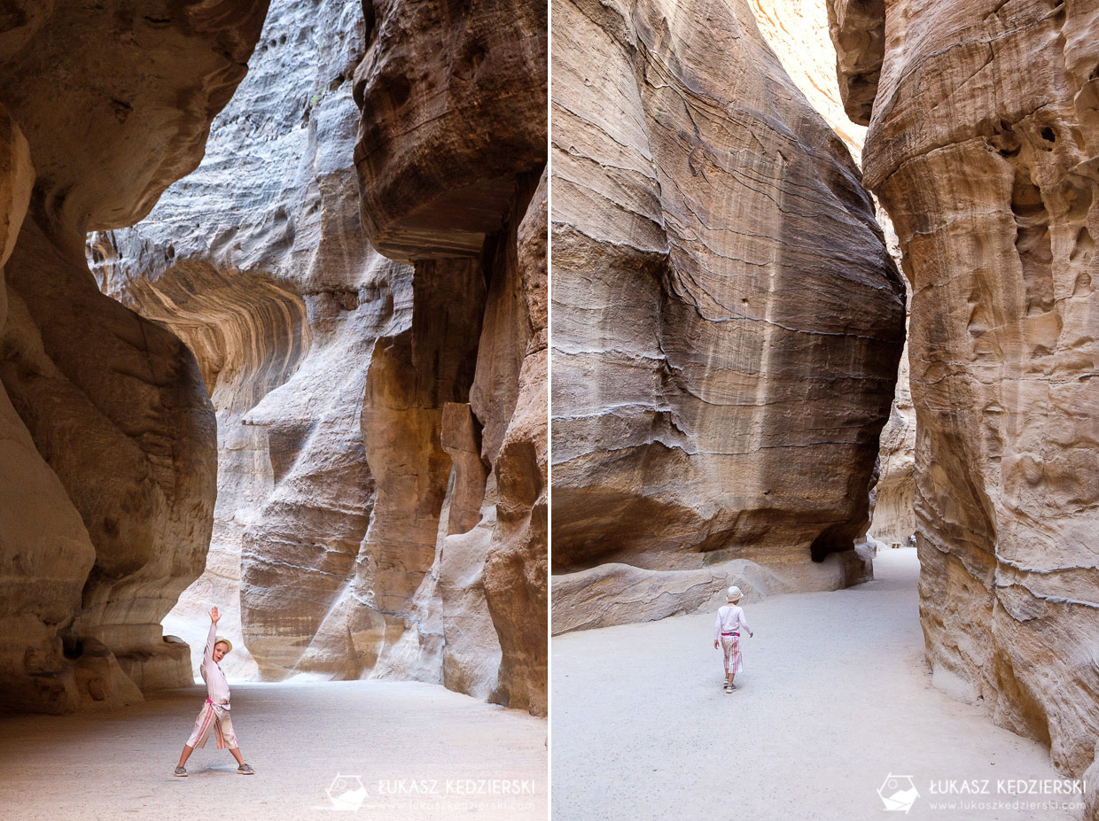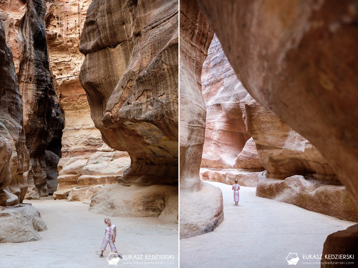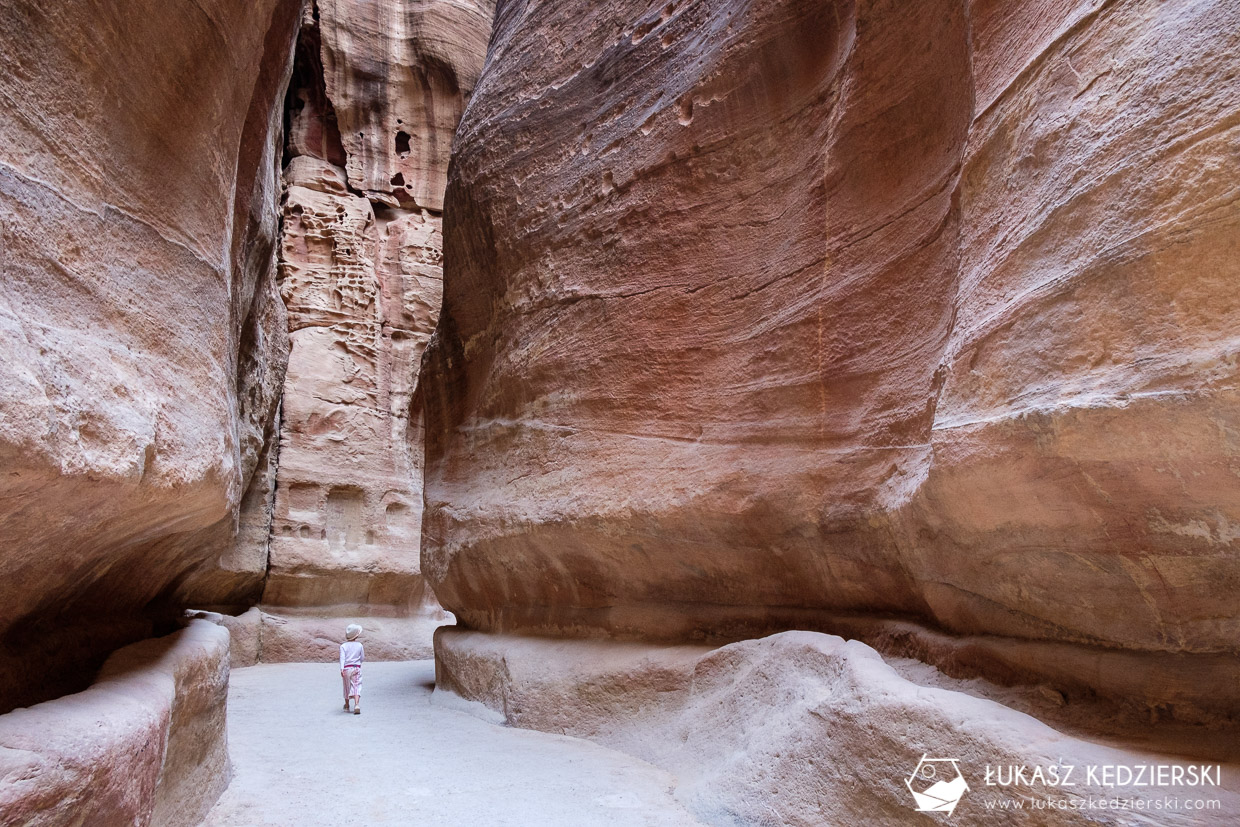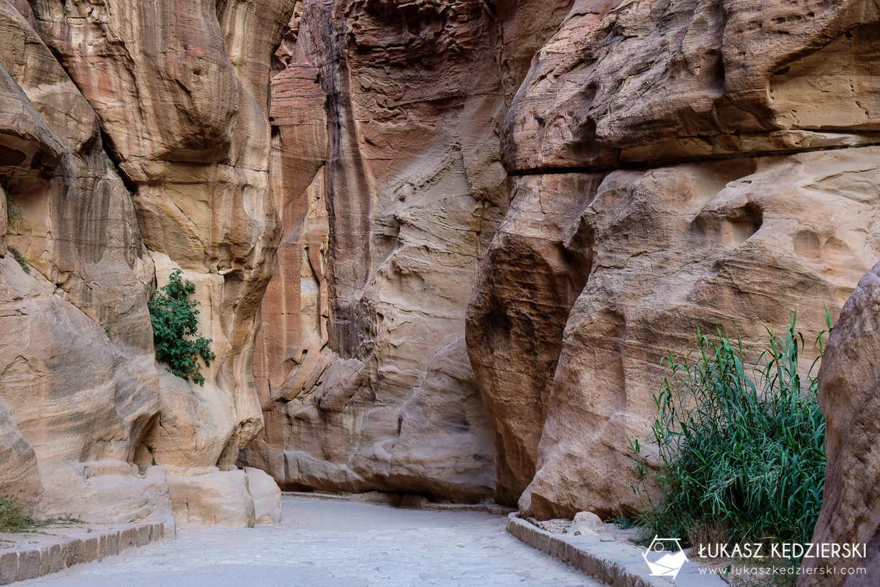 Zmienia się charakter szlaku. Wchodzimy do przepięknego wąwozu. Jesteśmy w świecie niesamowicie barwnych ścian. Otaczają nas różne kształty, formy i kolory. Miejscami ściany są dosyć wąskie (3 metry), aby po chwili rozszerzyć się do 12 metrów i dać szansę na szerszą perspektywę. Żółta barwa przeplata się z pomarańczową, szara z brązową, a całość pięknie kontrastuje z wysoko ponad skałami zawieszonym, idealnym błękitem nieba. Dla samych tych barw warto tu przyjść. Wąwóz As Siq częściowo powstał na skutek ruchów tektonicznych, a reszty dokonali nabatejscy rzeźbiarze i siły wody, która wyszlifowała ponad 80-metrowej wysokości ściany. Wąwóz As Siq robi na nas olbrzymie wrażenie. Dzięki temu, że rozpoczęliśmy naszą wędrówkę chwilę po otwarciu kas, to podziwiamy to miejsce w ciszy i spokoju. Dookoła nas nie ma prawie nikogo.