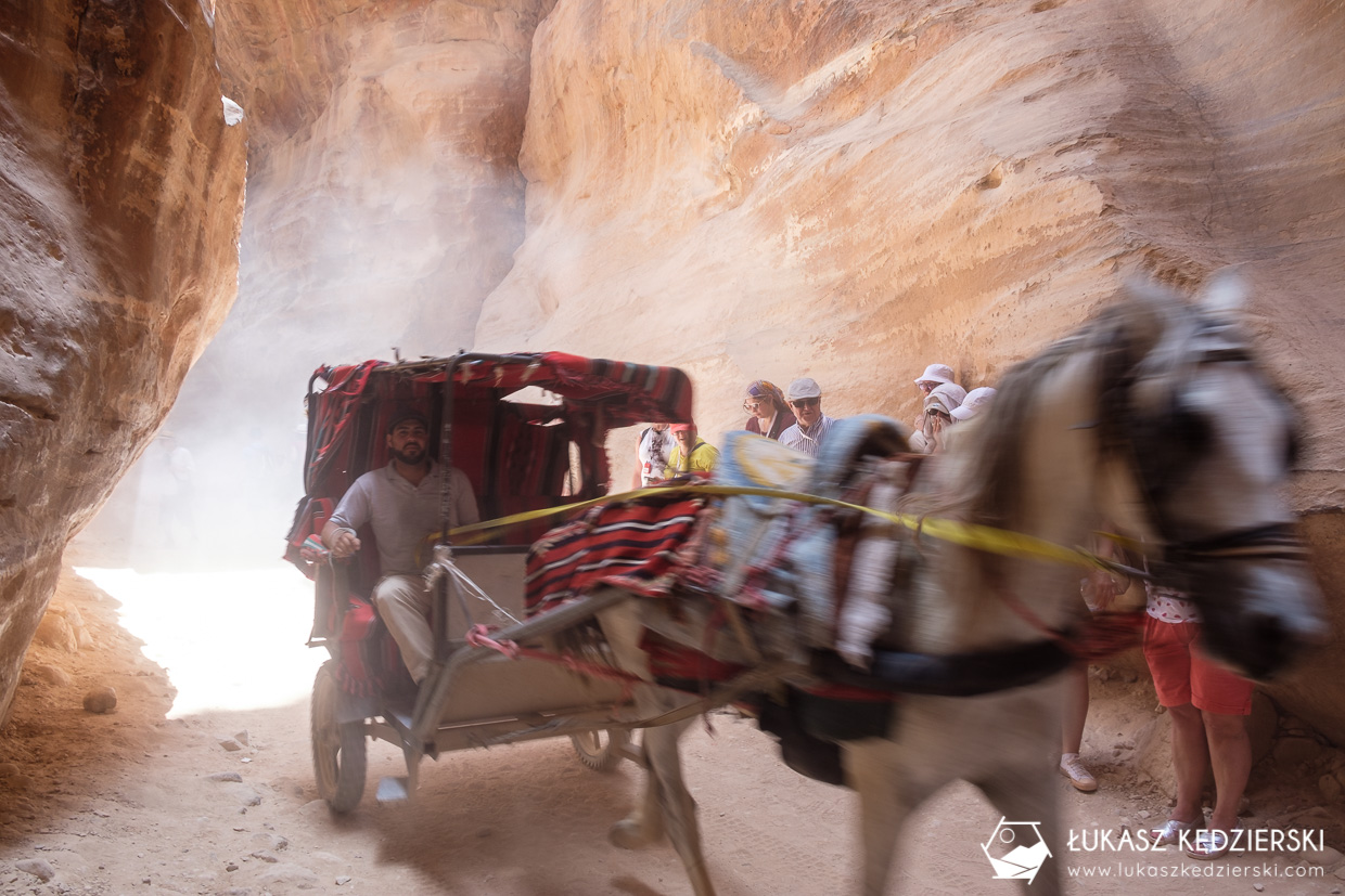 Główny Szlak w Petrze startuje szeroką, uklepaną piaszczystą drogą. Dookoła widać niewielkie skałki. Na tym odcinku liczni naganiacze będą próbowali namówić Was na skorzystanie z „darmowej” przejażdżki na koniu pod same wrota wąwozu As Siq. Na końcu tej wątpliwej atrakcji często okazuje się, że niby była „darmowa”, ale napiwek, nie mniejszy od X JOD, należy się. Nie korzystamy z takich „atrakcji” i grzecznie dziękujemy i idziemy przed siebie.