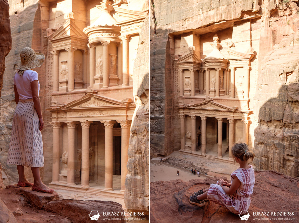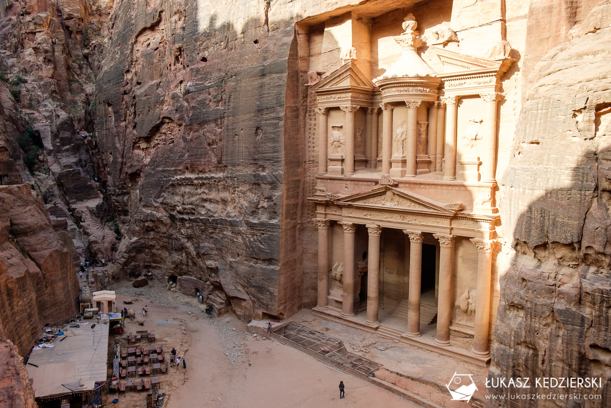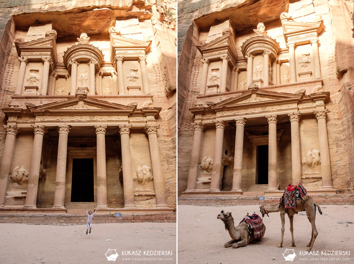Dochodzimy do głównej atrakcji Petry. Na końcu wąskiego korytarza chowa się duża przestrzeń, olbrzymi plac z niesamowitą fasadą Skarbca Faraona (Treasury Al-Khayneh). Zdjęcie tego miejsca widnieje w każdym przewodniku, na wielu pocztówkach i mapach. Wielu przychodzi tylko tutaj, aby zrobić sobie słynne „selfie” ze skarbcem w tle i wrzucić w swoje kanały social media. Zdjęcia można zrobić z poziomu szlaku lub wejść na punkty widokowe po lewej, lub prawej stronie.