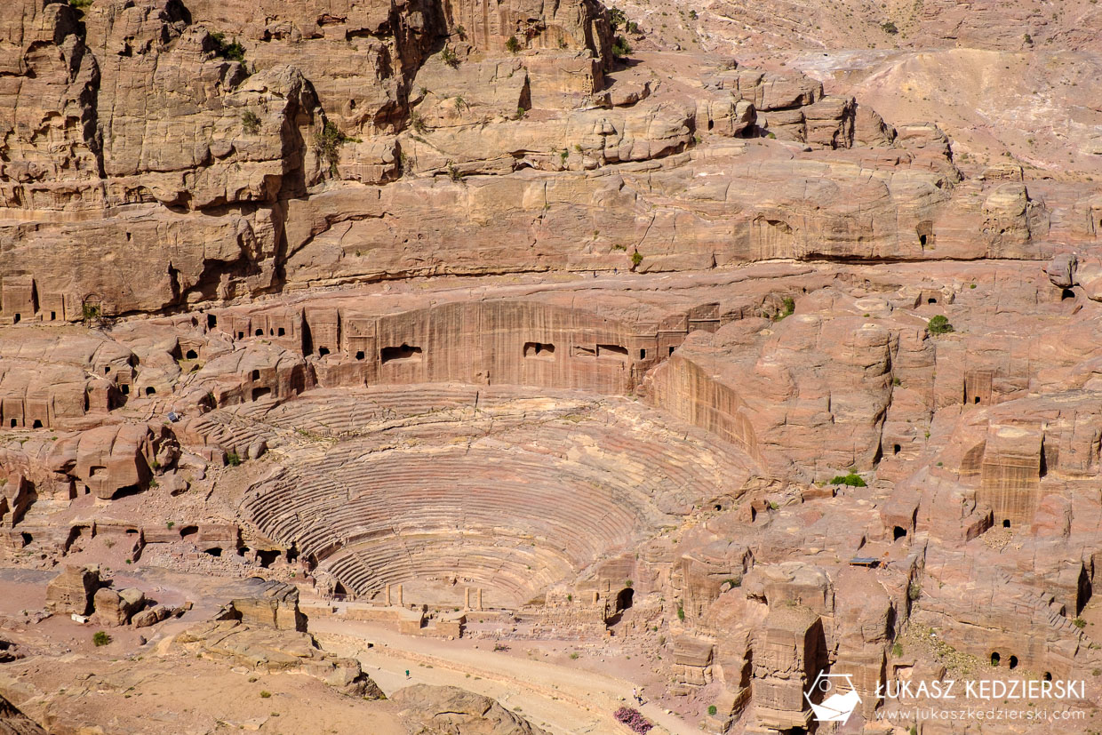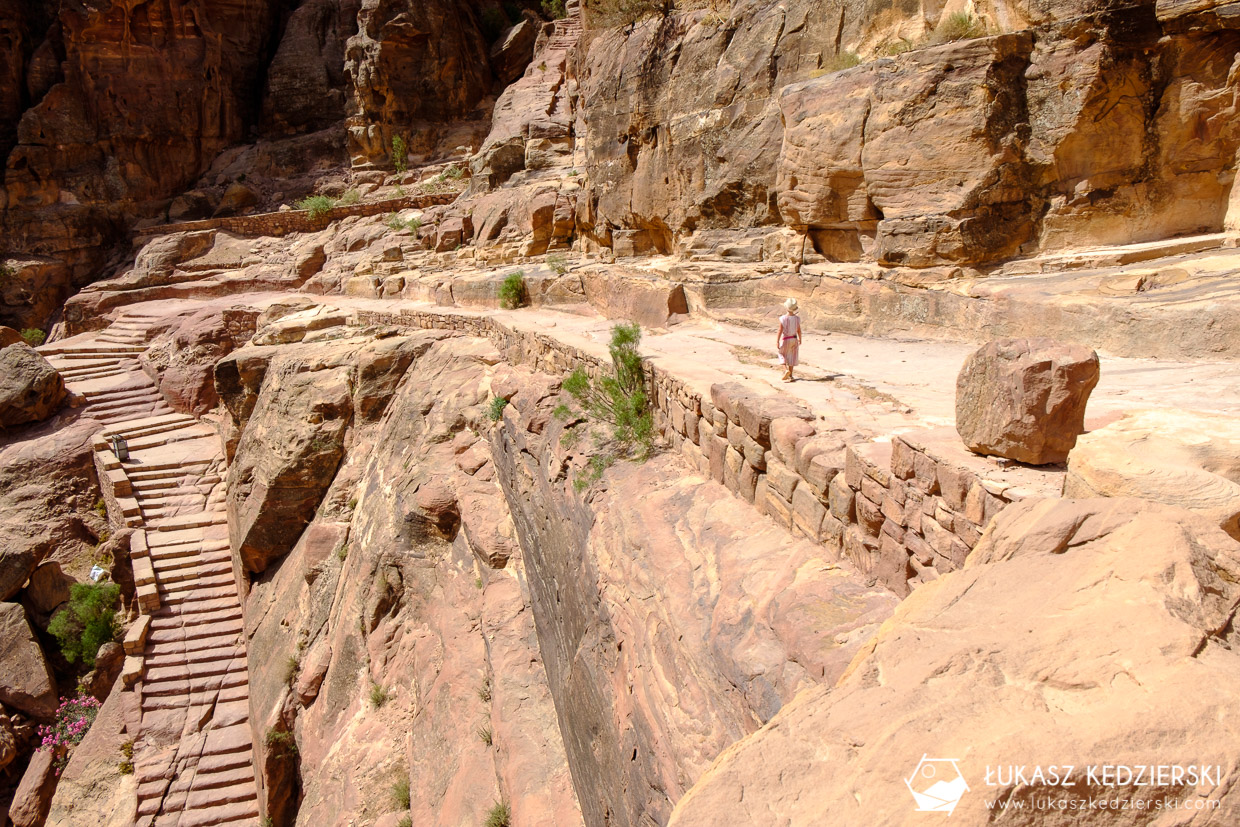 Kontynuujemy wędrówką szlakiem i przechodzimy na drugą stronę góry, aby wykutymi w skale schodami zdobywać kolejne metry wysokości. Idziemy szerokim skalnym wąwozem z pięknymi widokami. Za moment rozpościera się panorama amfiteatru, widok na całą Dolinę Petry i Główny Szlak, który pokonywaliśmy dzień wcześniej.