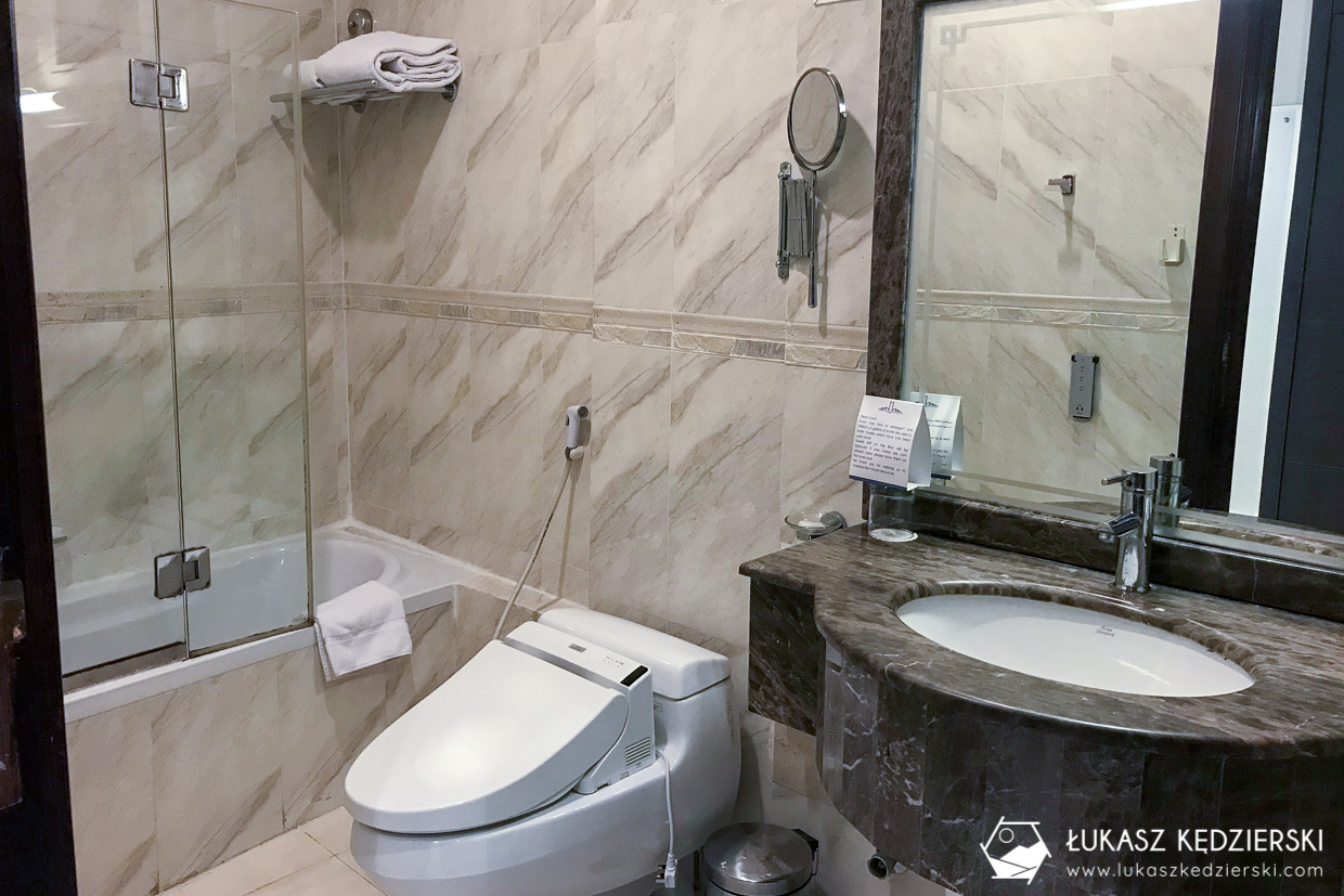 Zarezerwowaliśmy duży pokój typy Delux z wielkim dwuosobowym łożem. Pokój był naprawdę bardzo duży z pięknym widokiem na zatokę oraz muzeum – niestety okna nie były zbyt czyste, co utrudniało zrobić super zdjęcie. Na wyposażeniu pokoju był sejf, telewizor, łazienka z wanną i prysznicem, kompletem kosmetyków itd. Uwaga na klimatyzację, bo działa bardzo wydajnie i pomimo ustawienia na wartość minimalną, było bardzo chłodno.