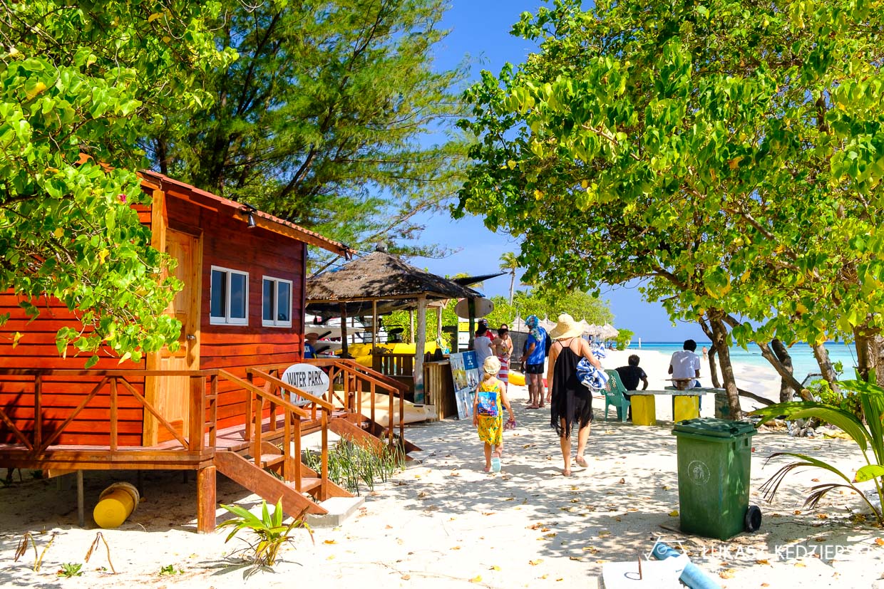 Plaża bikini znajdowała się ok. 2-3 min spaceru na drugą stronę wyspy. Miękki, biały i delikatny piasek oblewany przez iście rajski kolor wody, typowy dla malediwskich widoków. W wielu miejscach jest sporo drzew, które dają upragniony cień. Są też leżaki, parasole, z których w większości można korzystać. Jest bardzo przyjemnie i tak swojsko.