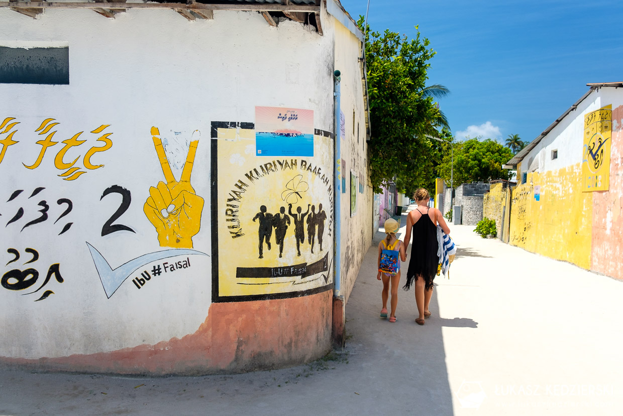 Ulice, jak to na Malediwach, są piaszczyste i raczej puste. W ciągu dnia, gdy jest gorąco, spotkamy niewielu mieszkańców. Jest czysto i spokojnie, a wyspa ma taki leniwy, bez pośpiechu rytm. Jest kilka sklepików, jest baza nurkowa, a przy samej plaży bikini „za płotem” znajduje się coś na kształt mini stoczni, gdzie naprawiane są łodzie.
