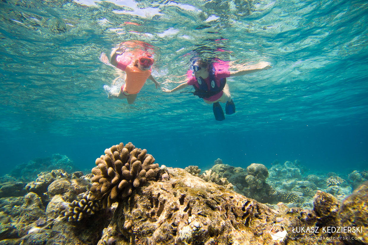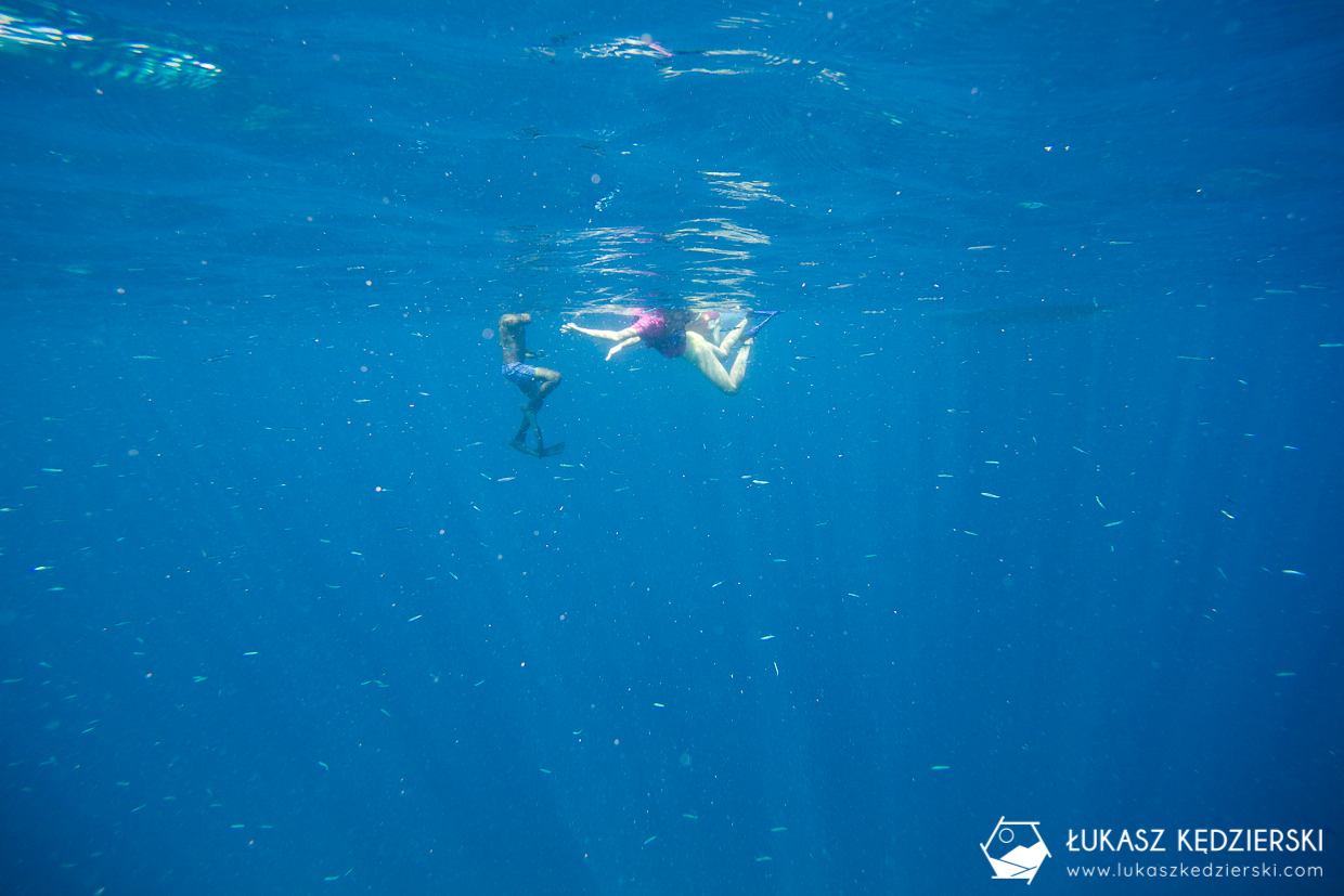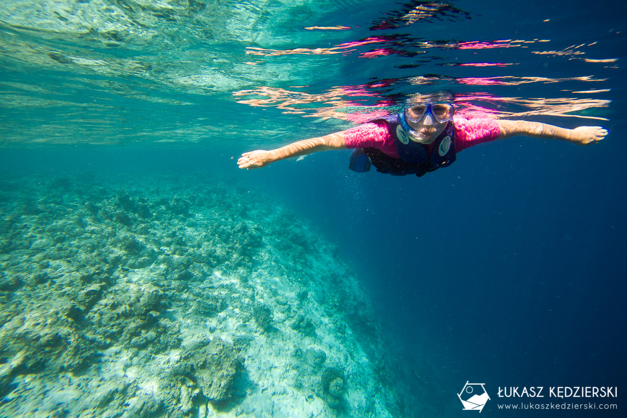 Tak jak pisałem powyżej, nie ma tu możliwości podziwiania podwodnego świata wprost z plaży. Aby wybrać się na snorkelingowy wypad, należy wynająć łódź, która dostarczy nas w kilka ciekawych miejsc. Dwóch młodych chłopaków zawiozło nas w trzy różne miejsca, gdzie jest najładniejsza rafa i warunki do snorkelingu. Niestety musimy przyznać, że rafa jest dosyć skromna, prawie obumarła, natomiast życia podwodnego jest całkiem sporo. Nadii coraz bardziej podoba się świat pod woda. Udało się też, namówiliśmy mamę, która dosyć niepewnie czuje się pływając na otwartym morzu 😉. Cały czas była pod czujnym okiem Nadii wiec czuła się bezpiecznie. Koszt 2-3 godzinnej wycieczki to 60 USD za łódkę.