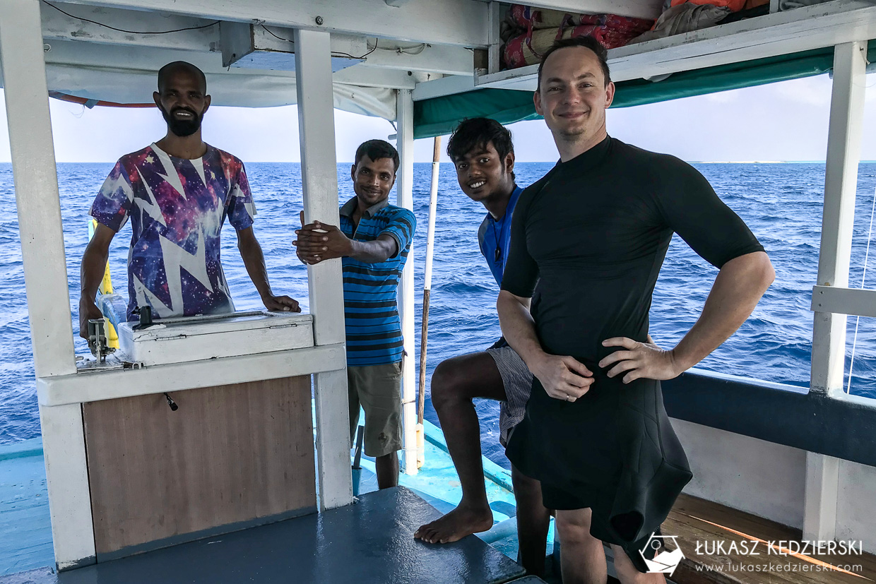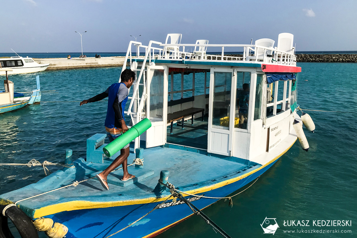 Wczesna pobudka i krótki spacer do bazy nurkowej. Cały sprzęt jest już załadowany na mały samochodzik, którym pojedziemy na przystań. Duża łódź ze swoim kapitanem czeka na nas. Choć przez chwilę mogłem poczuć się jak VIP. Jestem jedynym klientem, a obsługuje mnie kilka osób. Na samej łodzi to 4 osoby z obsługi, a dodatkowo kilka na lądzie. Nieźle prawda? Wypływamy z portu w stronę morskiej przygody. To będzie moje pierwsze nurkowanie na Malediwach. Byłem bardzo podekscytowany i ciekawy jak będzie.