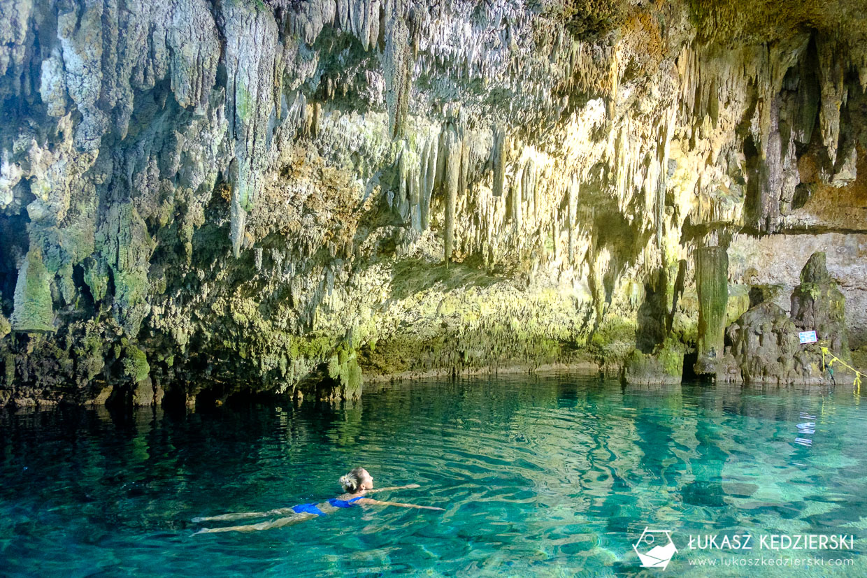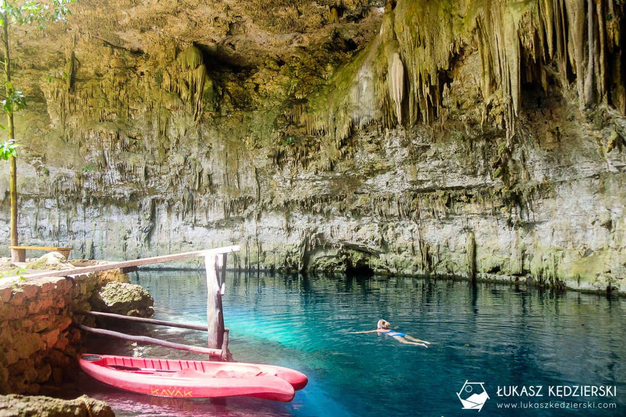 Jednym z najważniejszych punktów naszej podróży do Meksyku, było odwiedzenie cenot. Nie interesowały nas te bardzo zatłoczone i komercyjne cenoty w Tulum i okolicach. Chcieliśmy popływać w przepięknych cenotach. Oczywiście, ja podczas nurkowania już widziałem kilka, ale Nadia z Agą jeszcze nie. Pojechaliśmy do położonej niedaleko Coby, cenoty Choo-ha. Na zdjęciach prezentowała się przepięknie, a w rzeczywistości było jeszcze piękniej. Wczesna pora spowodowała, że mieliśmy ją, przez większość czasu, tylko dla siebie. Super co? Woda jest orzeźwiająca, nacieki piękne, a widoki zapierają dech w piersiach. Super móc popływać w takim miejscu i to całkowicie sami. Czy lubicie takie miejsca?