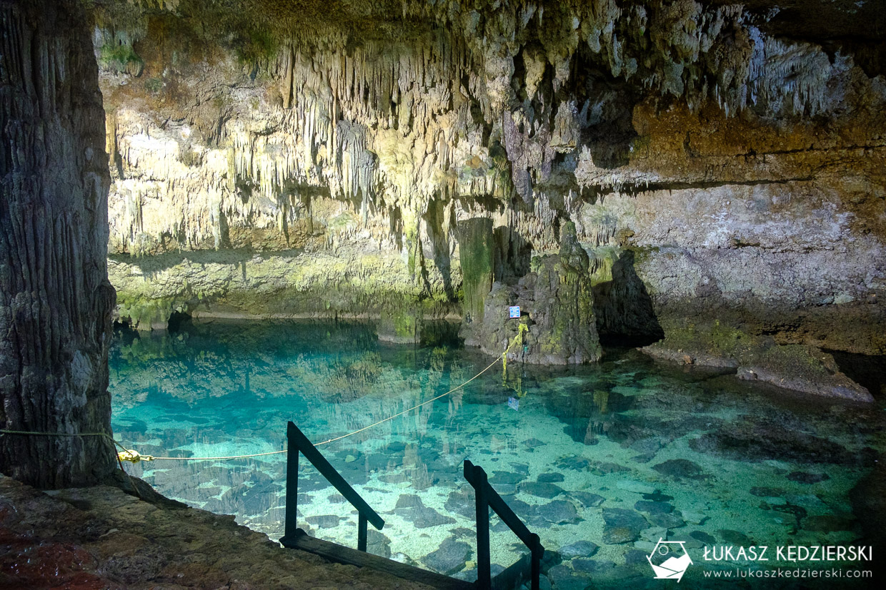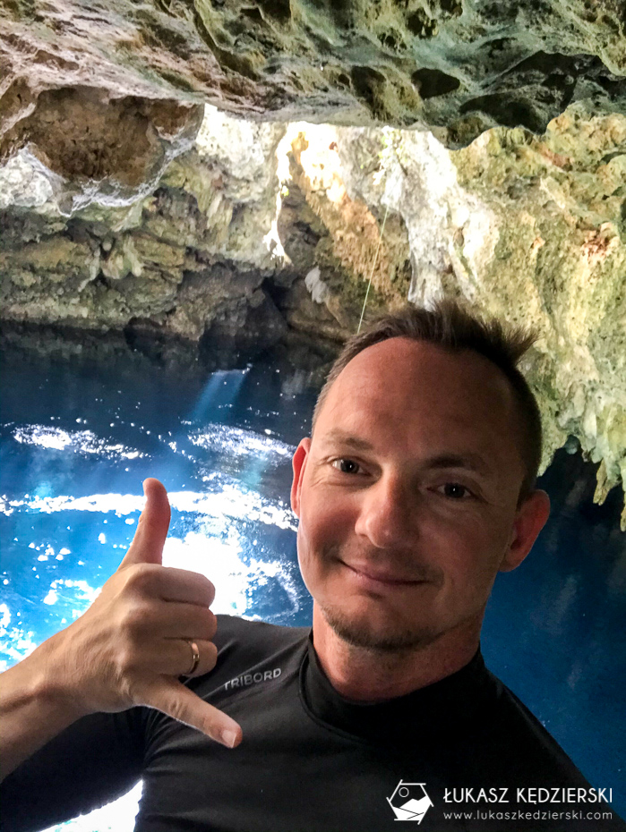 O cenocie Sac Aua słyszeliśmy wiele dobrego. Trochę trudno było tam dojechać, bo są roboty drogowe na autostradzie i źle nas pokierowała nawigacja. Koniec końców, nadrobiłem kilkadziesiąt kilometrów, bo jak wiecie, na autostradzie trudno się zawraca i straciliśmy ponad godzinę w samochodzie. Ostatecznie dotarliśmy do malutkiej wioski i udaliśmy się do cenoty. Sac Aua, to duża dziura w ziemi, do której schodzi się po drewnianych schodach. Na jej środku znajduje się usypana wyspa. Pływa się dookoła, a nad głową jest dużo nacieków, korzeni i drzew. Zupełnie inna od poprzednich i bardzo fajna. Na miejscu spotkaliśmy zaledwie kilka osób i tak było przez cały czas. Woda na początku wydaje się trochę chłodna, ale później już jest spoko.