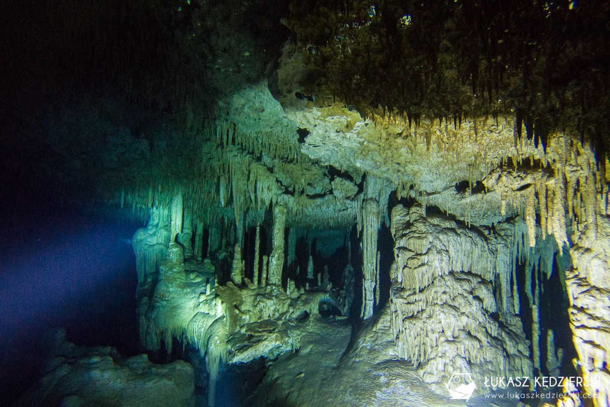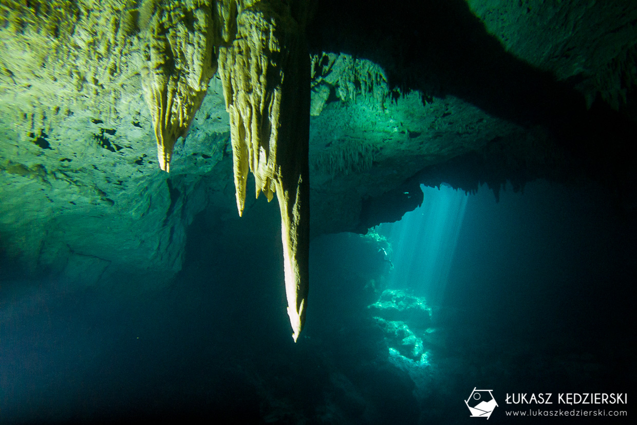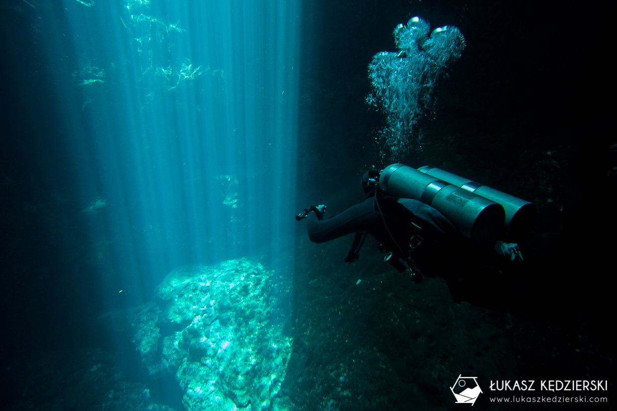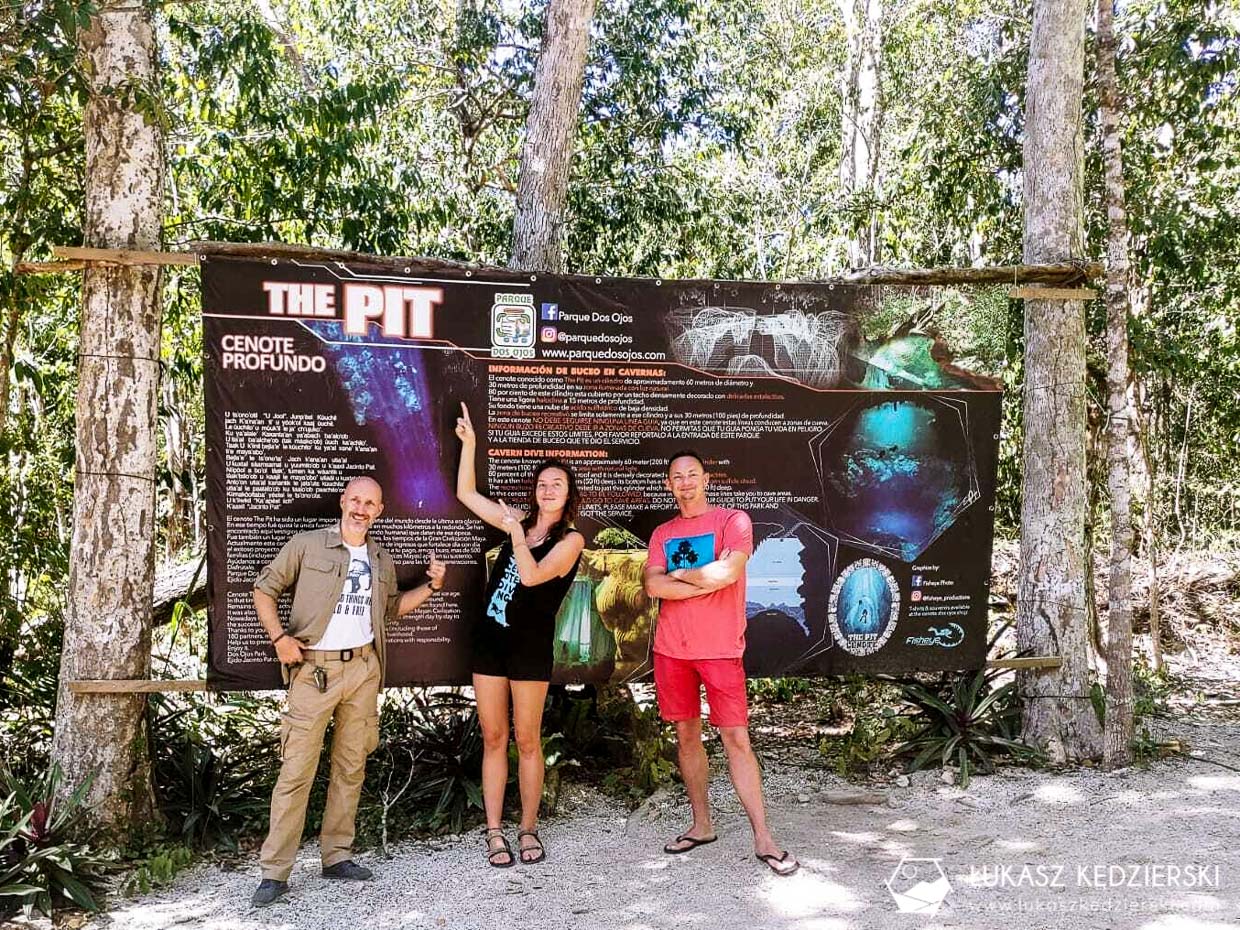 Wiadomo, że na jednego nurka się nie opłaca jechać więc od razu zahaczyliśmy o drugą bardzo znaną cenotę, czyli The PIT. To zupełnie inna bajka – głęboka, obszerna studnia z niesamowitymi promieniami świetlnymi. Najlepsze warunki panują tu w okolicach maja, gdy promienie słońca pionowo zaglądają do studni, ale dzisiaj też było ładnie. Na głębokości ok. 15-16 metrów pojawia się haloklina, czyli mieszanie się wody słodkiej ze słoną. Przez moment ma się wrażenie, jakby uszkodził nam się wzrok, bo wszystko jest rozmazane. Trochę głębiej jest zawalisko, gdzie unosiła się delikatna „mgiełka”, nadając trochę strasznego klimatu. A do tego wszystkiego w The PIT jest duży okap udekorowany licznymi stalaktytami.
