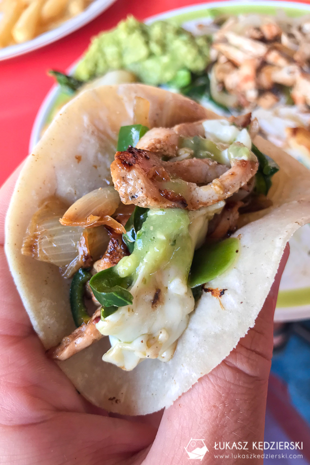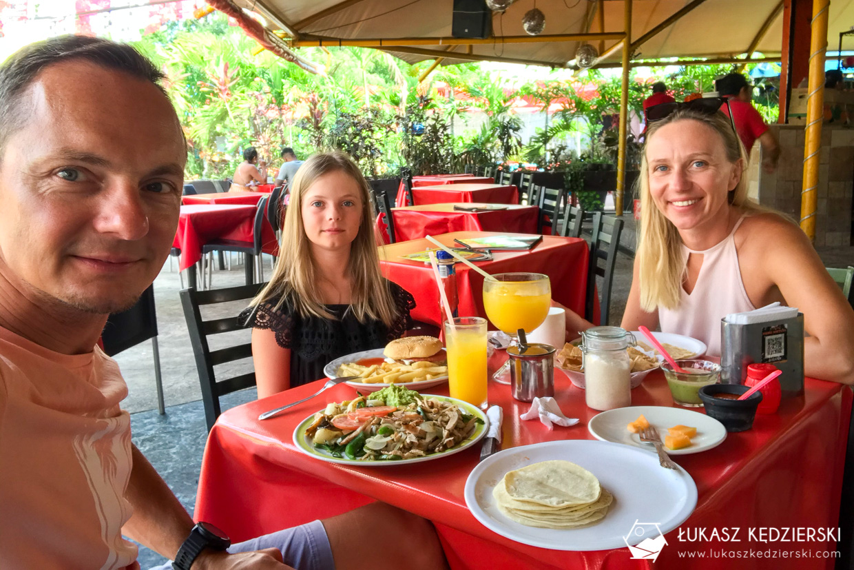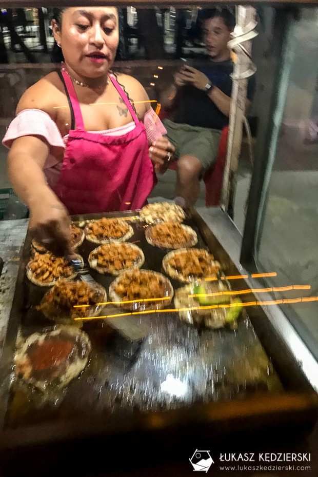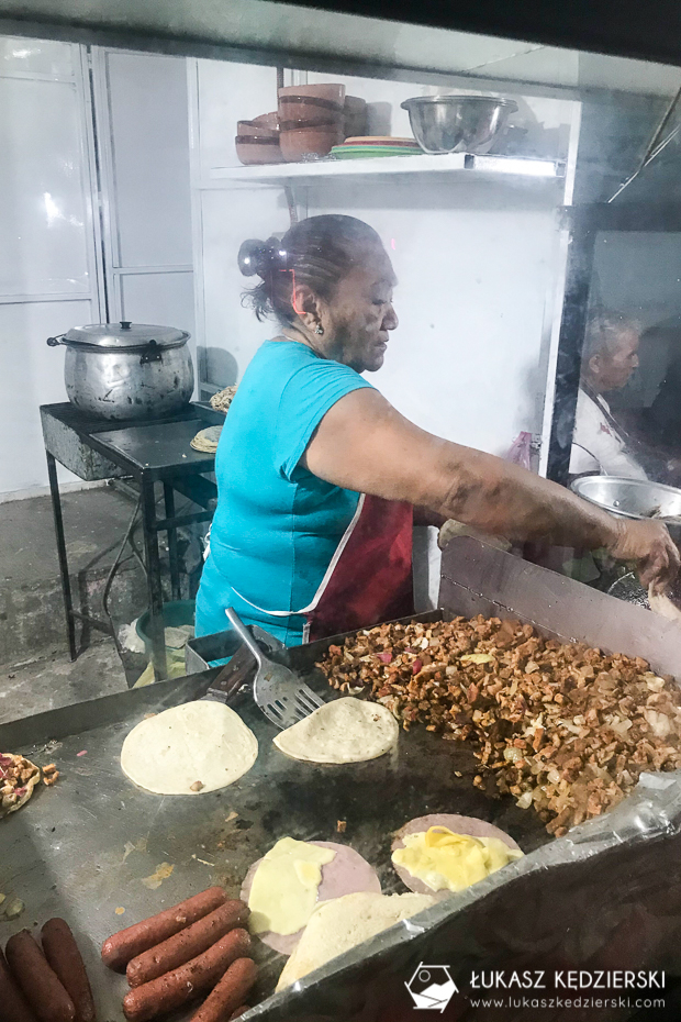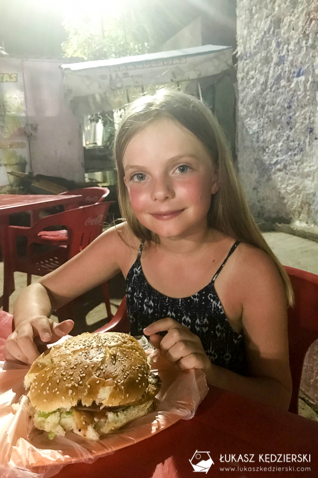 Chyba pisałem, że lubimy uliczne jedzenie? Najczęściej podglądamy, gdzie jedzą miejscowi, bo przecież oni to wiedzą, gdzie dają dobrze jeść prawda? Nie pamiętam, kiedy ostatnio jadłem hamburgera, ale taka lokalna, meksykańska wersja wymiata. Buła, sałata, jakieś mięso, szarpany kurczak, pomidor itd…. Wszystko robione prosto od serca i pomimo że wspólnie z Panią znaliśmy tylko słowa muchos gracias, to pokazała wszystko, co oferuje na swoim stoisku, i na migi wytłumaczyła gringo, aby wiedział, co zamówić. A do tego jeszcze soczek mango. Pychoooota. Nadia też wciągnęła wielkiego hamburgera sama i obniżała dokładnie wszystkie palce. Takie dobre było.