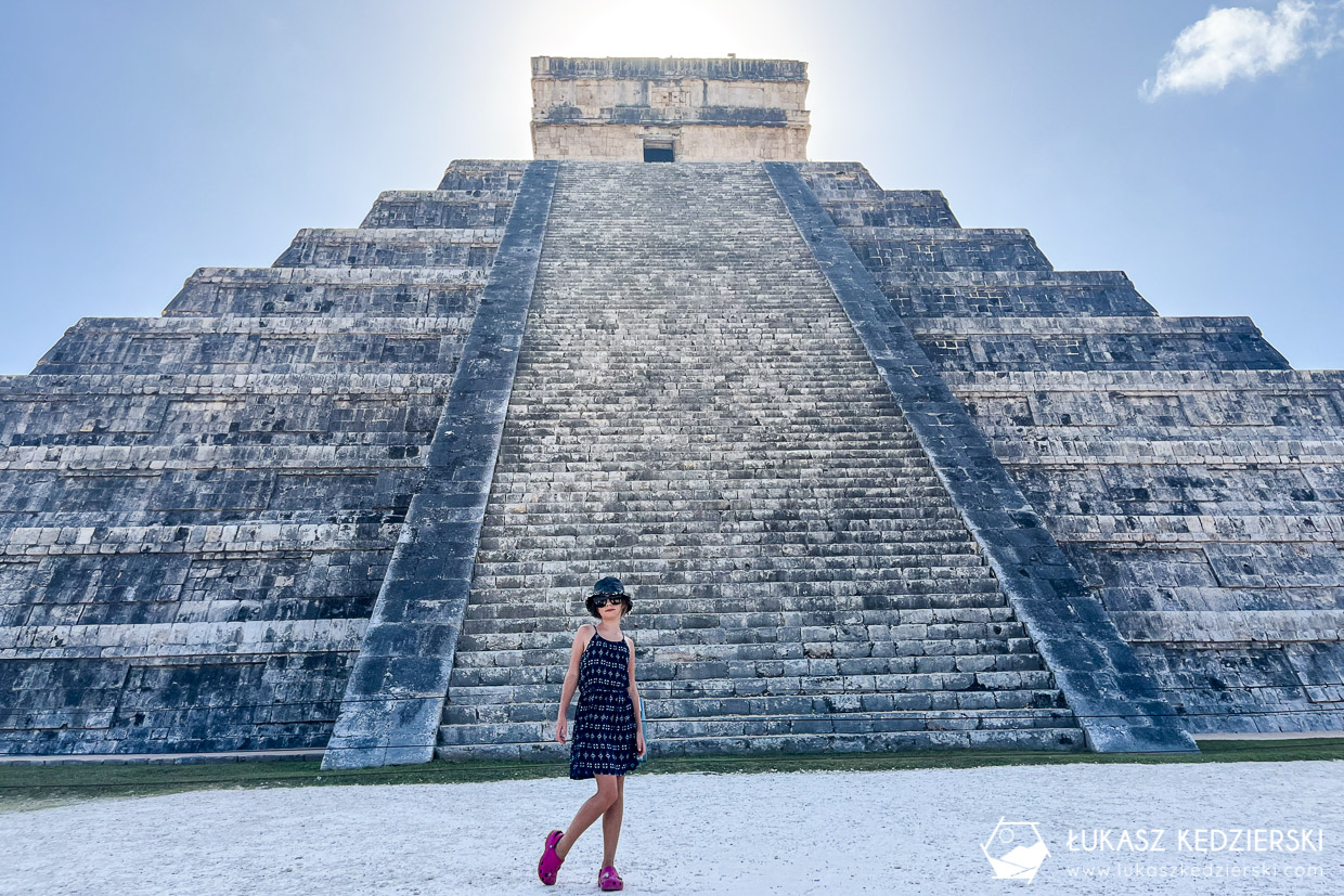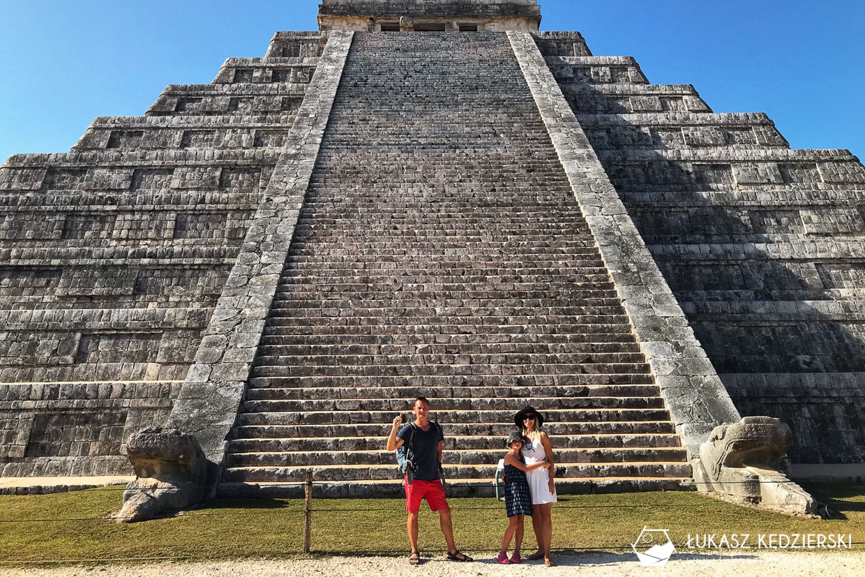 Każde, lub prawie każde, zwiedzanie Meksyku musi wziąć pod uwagę to miejsce. W sumie to nie wiedzieliśmy czego się spodziewać. Liczyliśmy na wielkie WOW, ale baliśmy się, że przez popularność tego miejsca i licznych turystów możemy się zawieść. Wstaliśmy wcześnie rano, aby być przed kasami biletowymi przed 8:00. Część odwiedzających miała podobny pomysł, bo spotkaliśmy już niezbyt dużą kolejkę turystów. W rezultacie okazało się, że nie jest tak źle. Kilkanaście minut podeszliśmy pod najważniejszą budowlę, czyli Piramidę Kukulkana. Muszę przyznać, że robi olbrzymie wrażenie. Jest niesamowita. Wszyscy klaskaliśmy, aby usłyszeć odbijające się dźwięki i podziwialiśmy ją z każdej strony, a to tylko jedna z budowli. Obeszliśmy wszystko, co było do oglądania m.in. Świątynia Wojowników, Grobowiec Kapłana, Kolumnady, obserwatorium, cenoty itd. Bez pośpiechu zajęło nam to ponad 3,5 godziny, bo chcieliśmy zaglądnąć do każdego zakątka. W tym czasie turystów było bardzo mało, ale czym bliżej 11., tym pojawiało się coraz więcej wycieczkowych grup i zaczynało być gwarnie, ale też bez przesady. To duży teren.