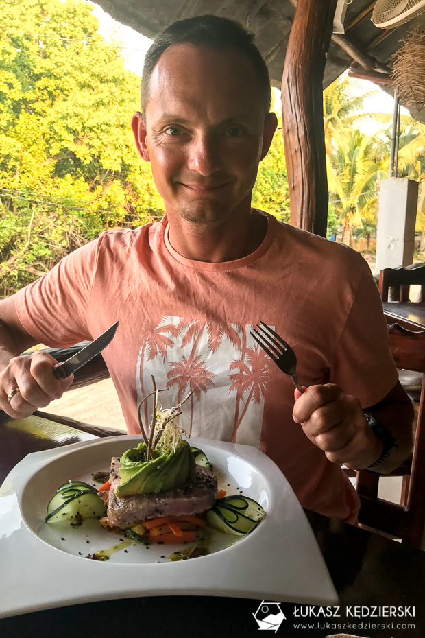 Wieczorem znów będzie o jedzeniu. Zwiedzanie Meksyku to nie tylko plaże, ruiny, cenoty, czy ludzie. To także przepyszne jedzenie, którego trzeba wszędzie próbować. Aga doskonale wybrała knajpę. Miejsce trochę oddalone od centrum, koło boiska piłkarskiego. Dosyć niepozorne, ale dają dobrze zjeść. Oboje mieliśmy ochotę na steka z tuńczyka, a Nadia standardowo na kalmary. Wszystko przepyszne, a tuńczyk medium rare był w punkt! Ależ to było dobre. Warto zapamiętać to miejsce, na wypadek jakbyście byli na wyspie.