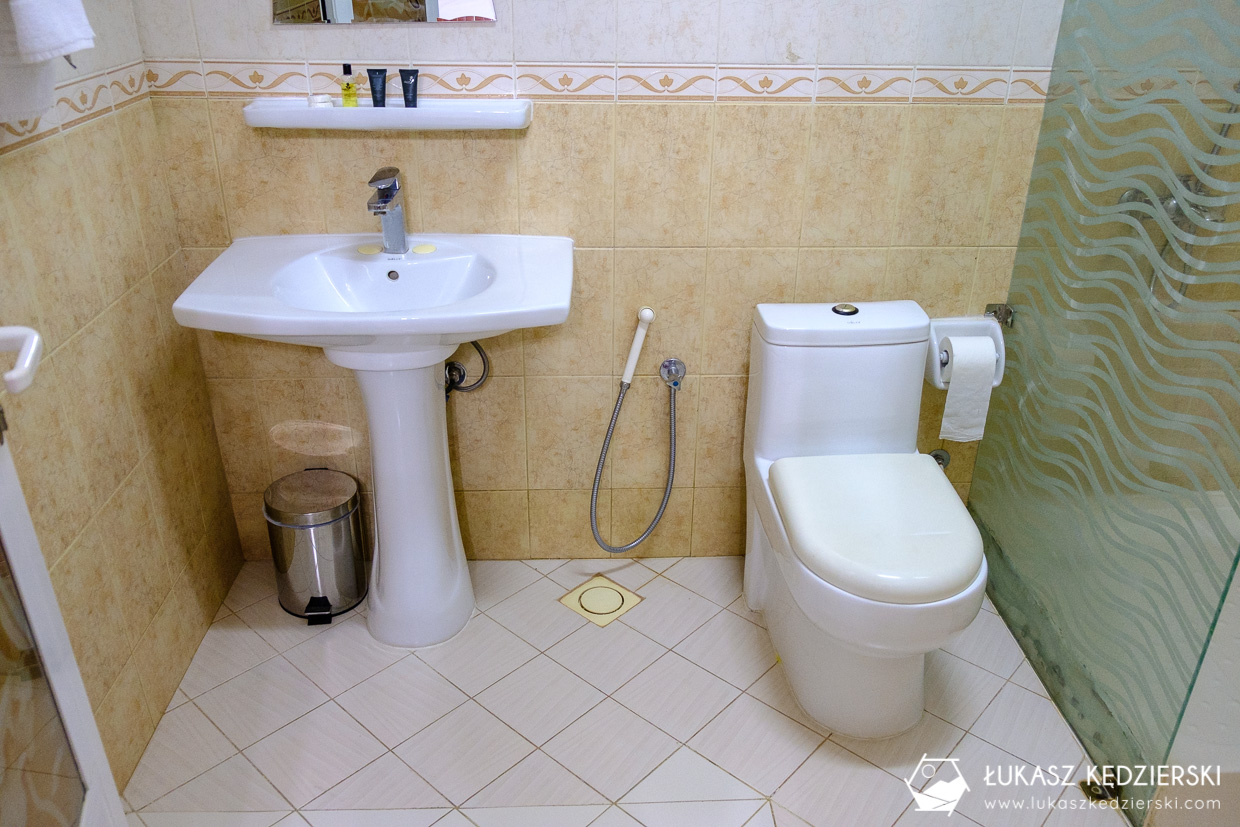 Duży pokój z wielkim, podwójnym łóżkiem oraz łazienką ze śniadaniem. W łazience znajdował się prysznic, ręczniki oraz pełen zestaw kosmetyków. W pokoju był telewizor, szafy oraz dodatkowy stoliczek i krzesła do wypoczynku. Wszędzie bardzo czysto i pachnąco. Obsługa bardzo mila i pomocna. W hotelu jest możliwość płatności kartą. Niestety nie było nam dane spróbować śniadania (serwowane w godz. 7:30-10:30) ze względu, że wcześnie rano jechaliśmy do Nizwy na poranny, piątkowy targ. Zdecydowanie polecamy to miejsce