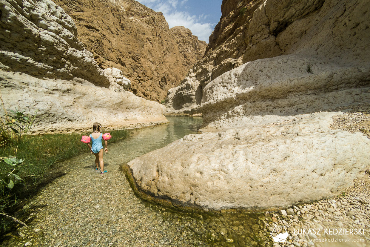 Wadi Shab to jedna z najsłynniejszych atrakcji Omanu. Na początku wsiadamy do małej łódeczki, aby dostać się na drugi brzeg. Później spacer przez wadi do miejsca, gdzie są baseniki z wodą. Dalej nie da się iść. Miejscowi, widząc Nadie jak dzielnie idzie po kamieniach, mówili z podziwem „Little Champ”.