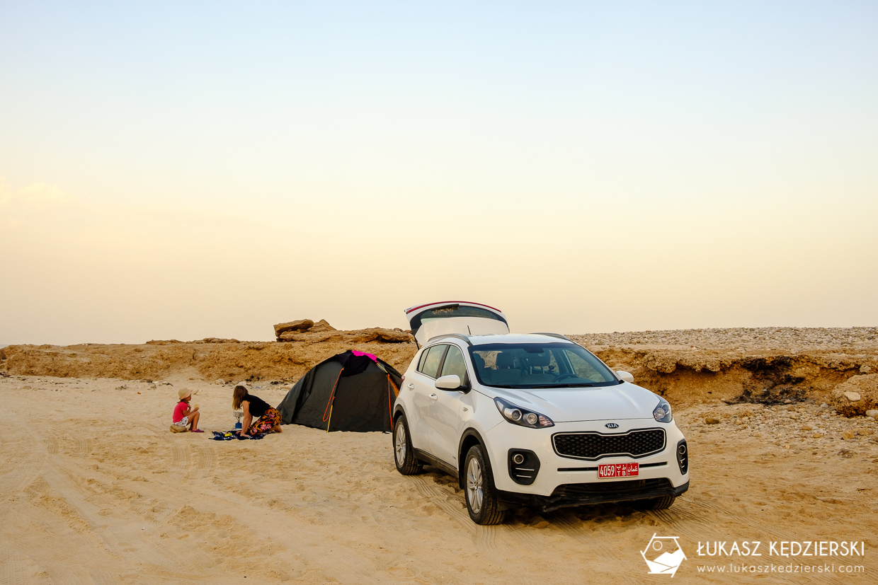 Rozbiliśmy się na okolicznej plaży przy samej drodze. Nad ranem troszkę wiało, ale było tak przyjemne słońce, że poszliśmy z Nadią na spacer wzdłuż morza. Aga przebierała się w samochodzie. Nagle przyszedł duży podmuch wiatru, który porwał nasz namiot, który koziołkował po plaży, wyrzucając z siebie zawartość. Później zbieraliśmy karimaty, poduszki i śpiwory z plaży 😊. Nieźle przywitaliśmy kolejny dzień w Omanie