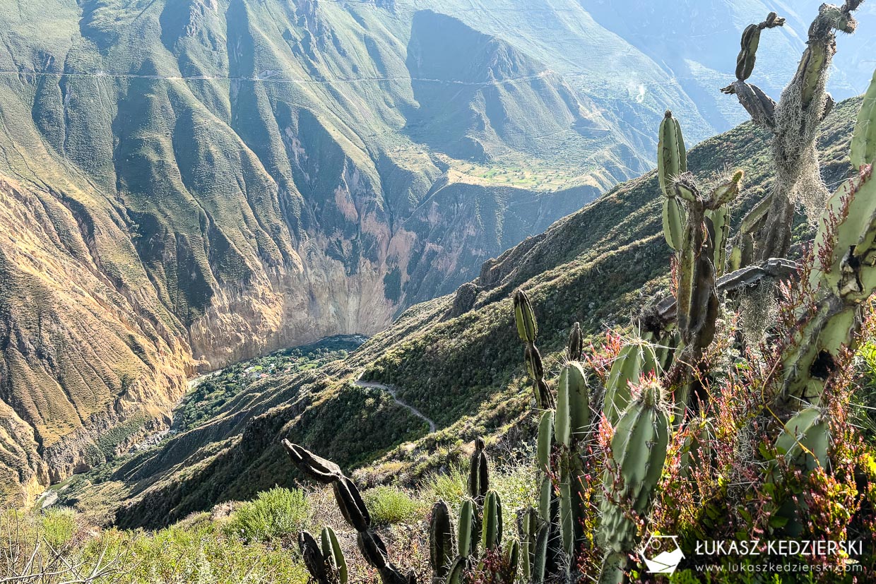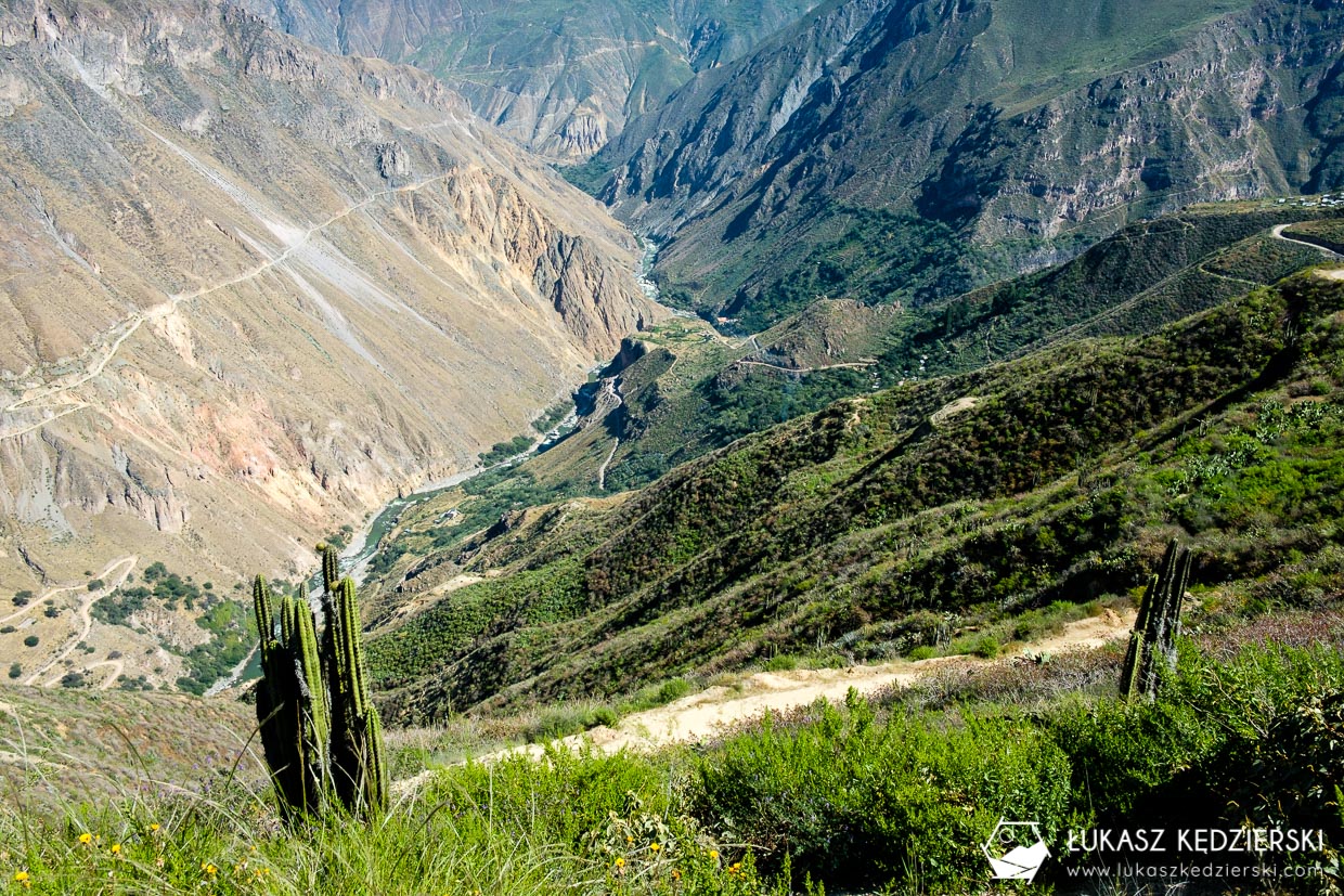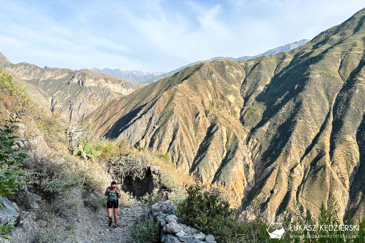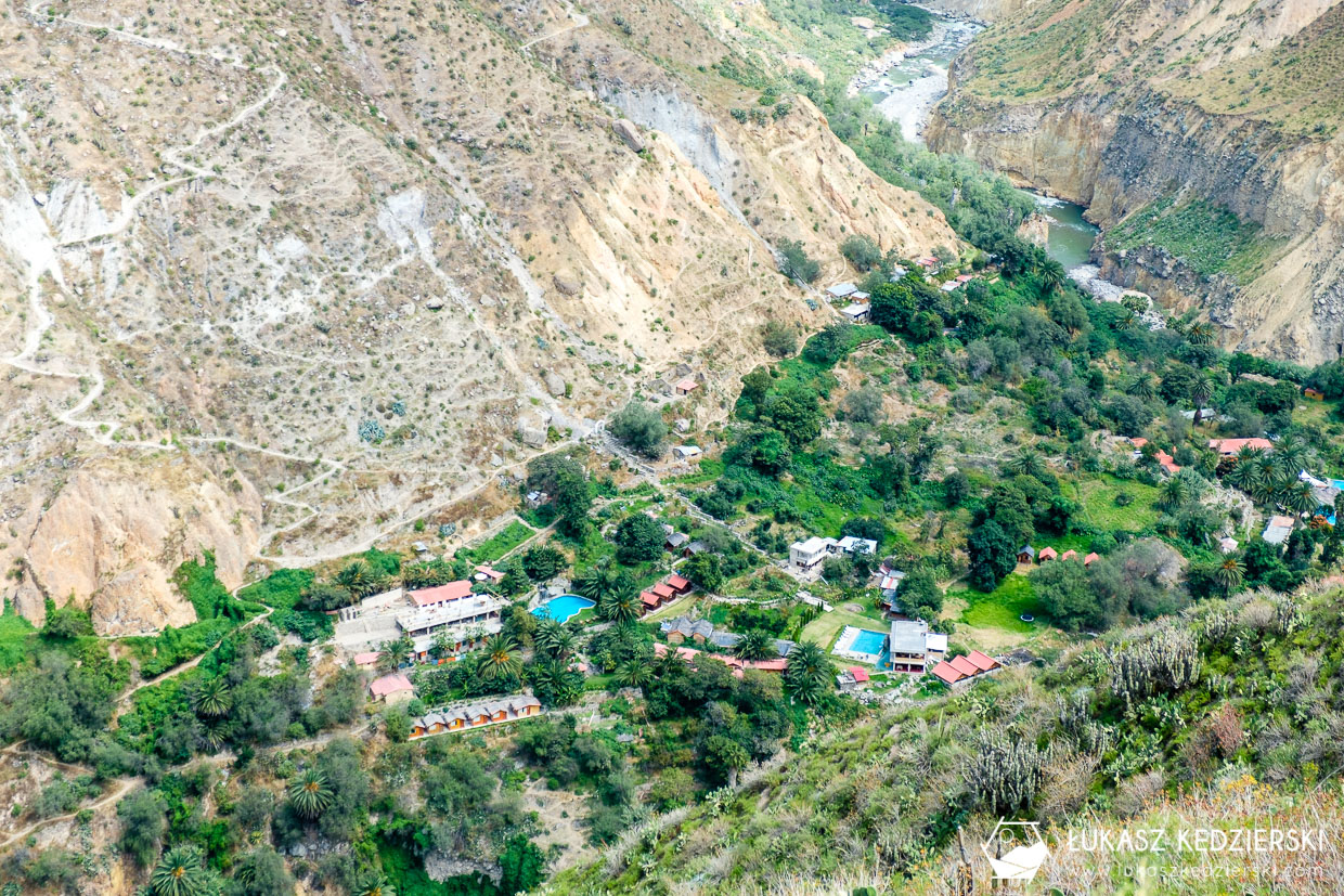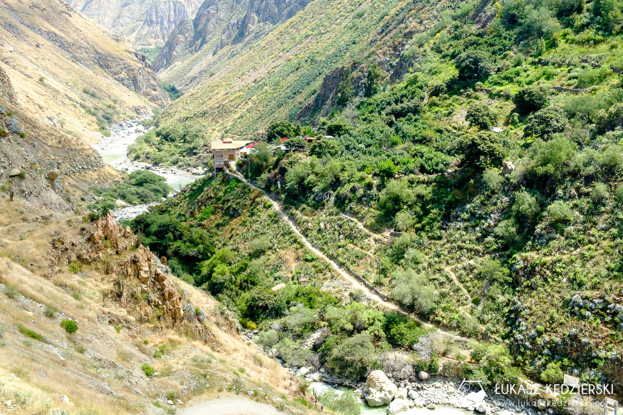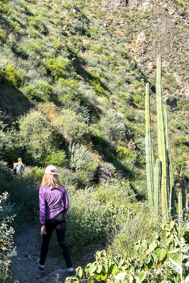 Widoki dookoła powalają na kolana. Wszystko wygląda tu niesamowicie. Im dalej idziemy, tym słońce coraz mocniej smaży, ale i tak idzie się w miarę przyjemnie. Dzisiejszy cel to wioska Llahuar, gdzie spędzimy pierwszą noc na dnie najgłębszego kanionu na świecie. Cała trasa zajęła nam niecałe 5 godzin. Pokonaliśmy ponad 1200 metrów w pionie i znajdujemy się na dnie kanionu Colca na wysokości 2150 m n.p.m.