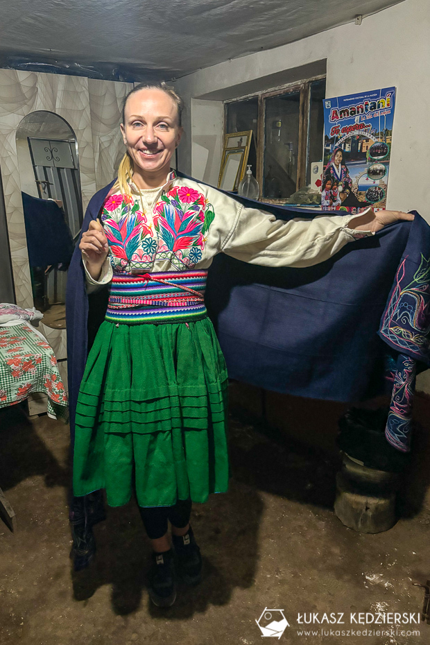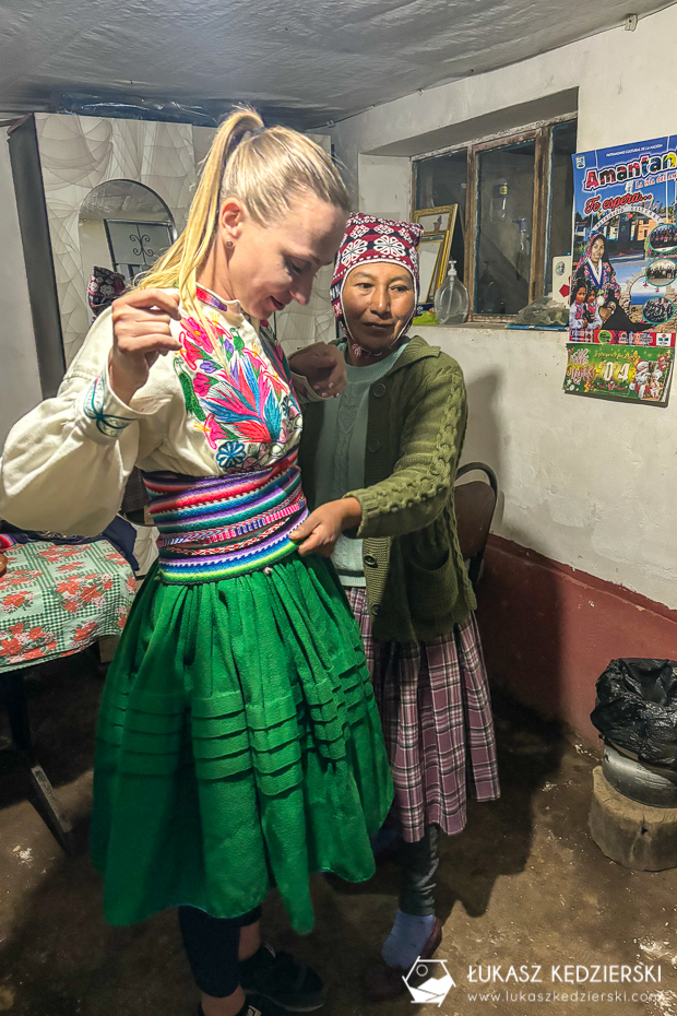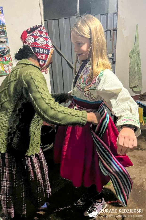 Jednak to nie był koniec tego dnia na wyspie Amantani. Późnym wieczorem zostaliśmy zaproszeni do lokalnego centrum na imprezkę. Jednak po kolacji u naszej rodziny, jak już mieliśmy wychodzić, to okazało się, że nie możemy być zwyczajnie ubrani.