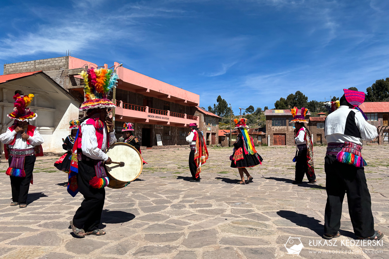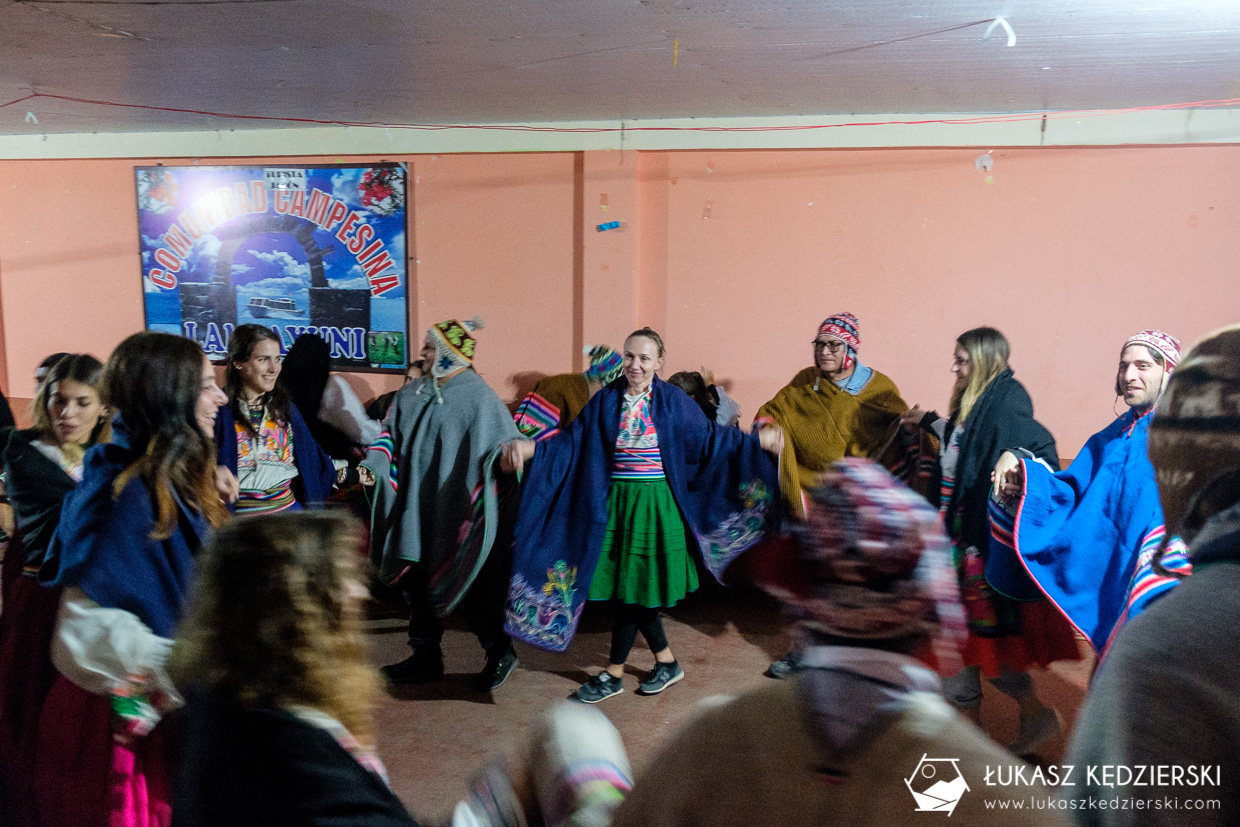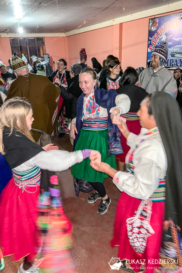 Pani domu wyciągnęła kilka rzeczy ze swojej i męża szafy i zaczęła nas ubierać. Każdy z nas został ubrany w lokalne, tradycyjne stroje, które normalnie noszą od święta nasi gospodarze. Dopiero tak ubrani mogliśmy pójść na dyskotekę. Impreza była przy muzyce na żywo, wszyscy pięknie ubrani wspólnie tańczyli jakieś kółka, wężyki i tuptanie. Zaskakujący był to koniec naszego pierwszego dnia na jeziorze Titicaca.