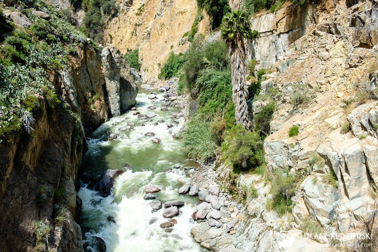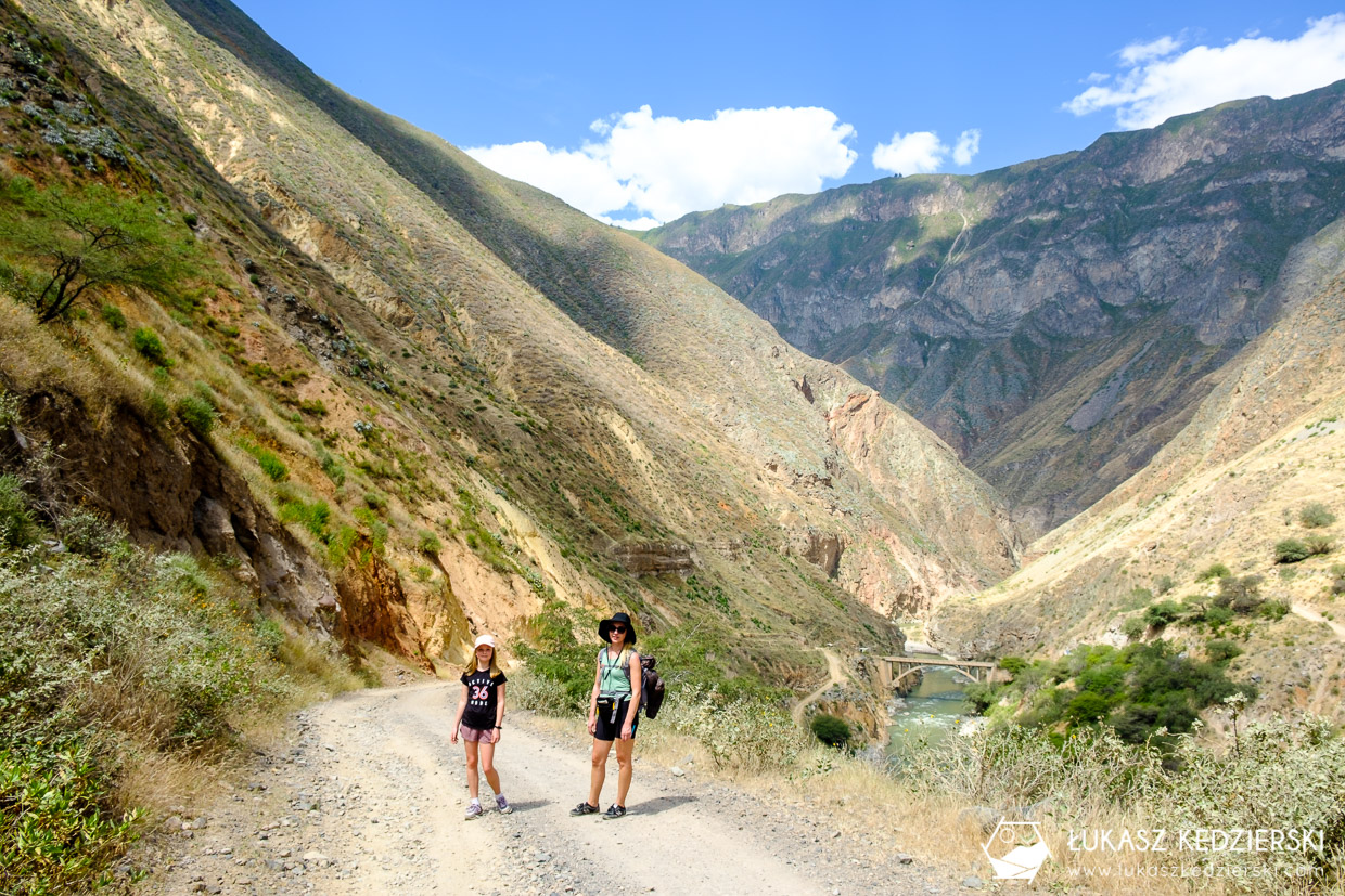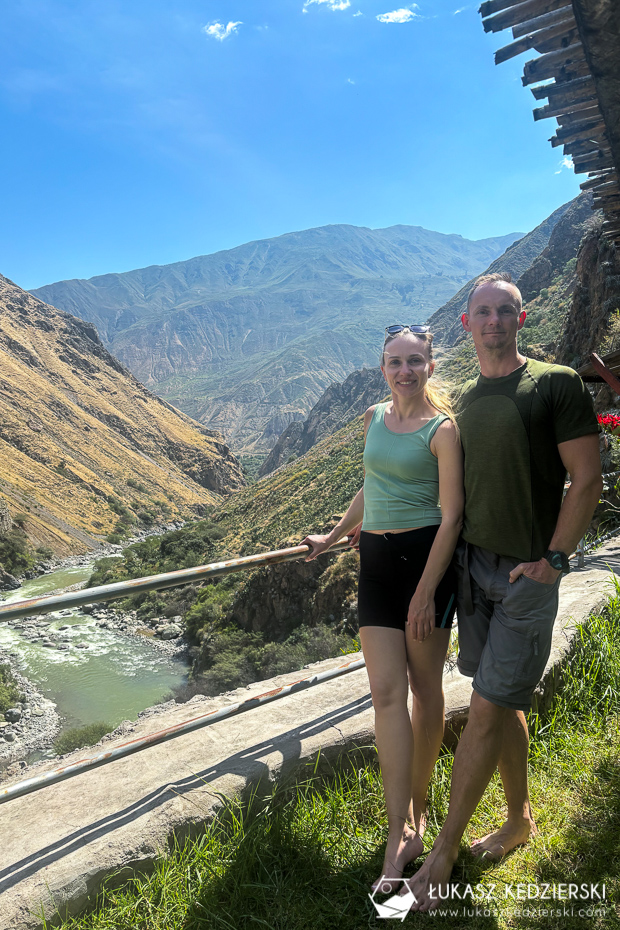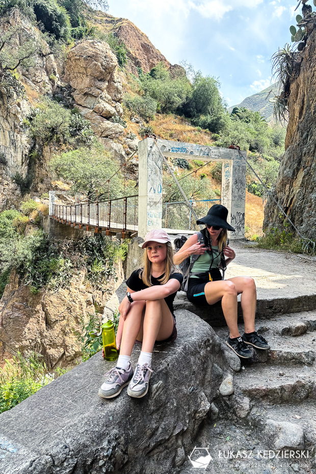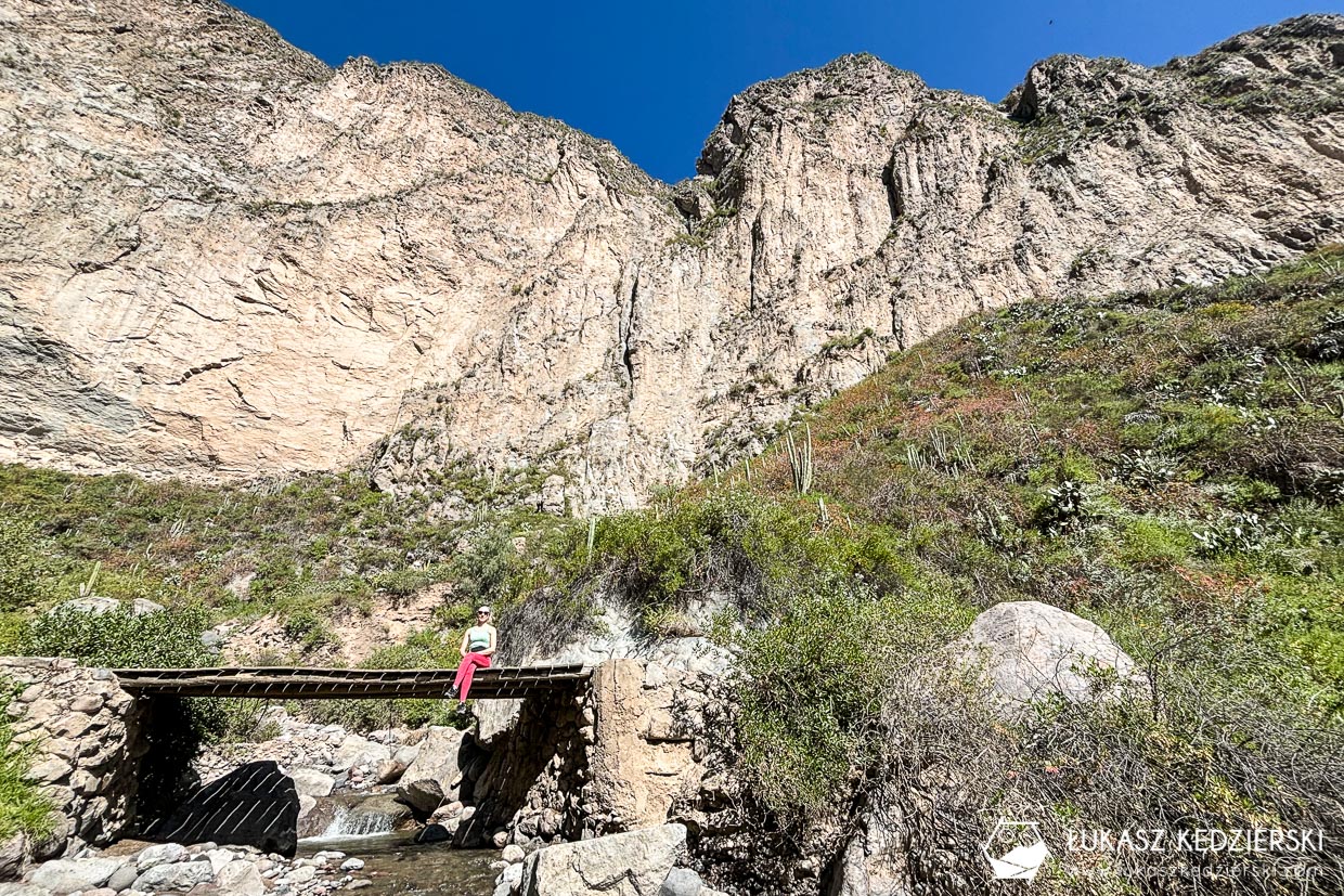 Od kilkunastu lat tak się składa, że moje urodziny spędzamy w podróży. W tym roku nie wyszło, ale dzisiaj są moje imieniny i zejście do kanionu Colca to doskonały pomysł na prezent prawda? Po dosyć dużym śniadaniu w hostelu, wystartowaliśmy koło 7:00 z Cabanadonde kierując się w stronę punktu widokowego Mirador Achachihua. Sprawdzenie biletów przez Panią z parku i ruszamy w dół. Rano było jeszcze mało słońca, więc szło się bardzo przyjemnie. Ścieżka jest ewidentna i nie sposób się tu zgubić. Dochodzimy do pierwszego mostku nad rzeką i robimy odpoczynek.