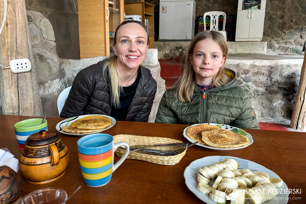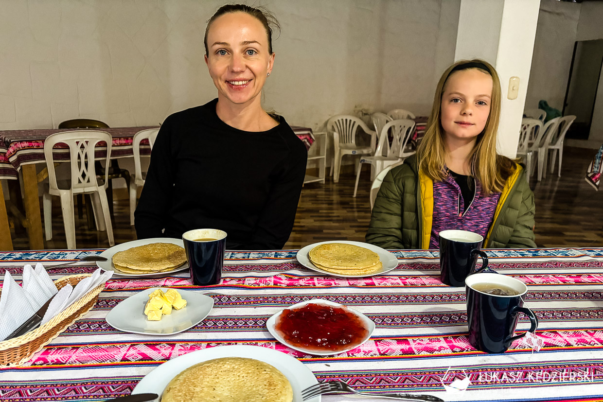 Tradycyjnie wczesna pobudka. Przed nami dzisiaj kilkugodzinna wędrówka w kanionie Colca. Zaczynamy od przepysznego śniadanie w postaci naleśników z marmoladą i bananami. Ten hostel jest rewelacyjny pod każdym względem: widoków, roślinności, jedzenia, kameralności i z super obsługą, a do tego prawie nikogo tu nie ma. Lubimy takie klimaty.
