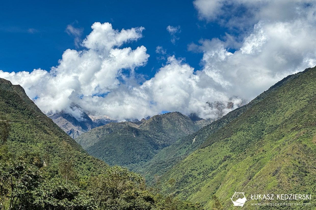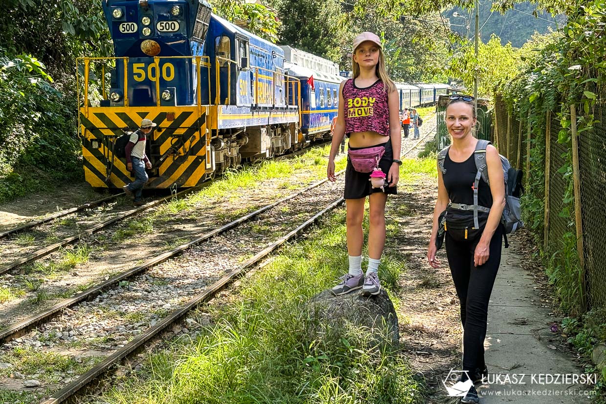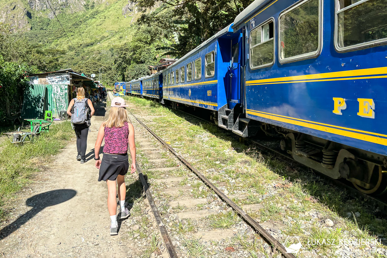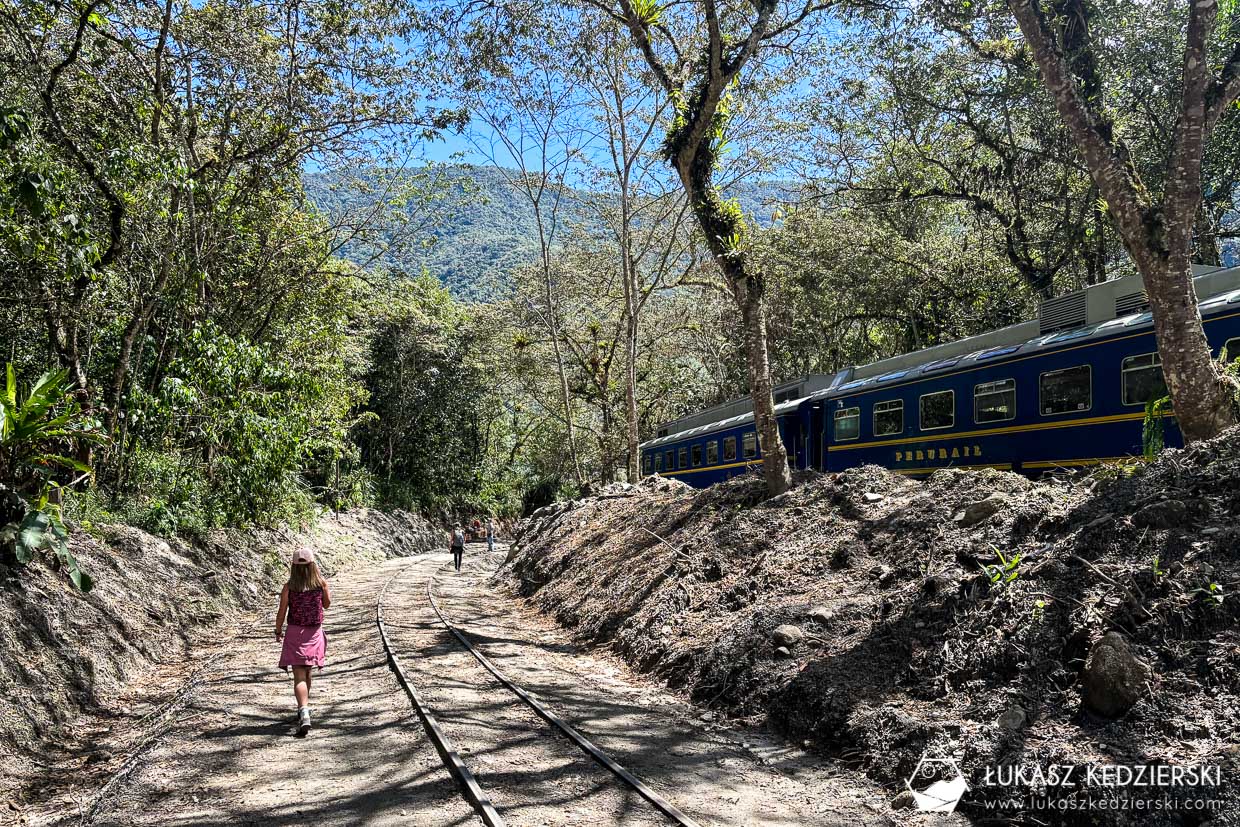 Ze stacji kolejki Hydroelectrica czekała nas 11 km wędrówka wzdłuż torów. Dookoła można było podziwiać widoki na nasz jutrzejszy główny cel. W kilku miejscach można było dostrzec ruiny Machu Picchu oraz okoliczne szczyty Machu Picchu, oraz Montaña Huayna Picchu. Wędrówka jest bardzo prosta i przyjemna, praktycznie cały czas w cieniu. Dzisiejszym celem jest dotarcie do Aguas Calientes położonego zdecydowanie niżej, bo na 2040 m n.p.m. Jest to brama do słynnego Machu Picchu, skąd startuje się, aby wejść lub wjechać do ruin.