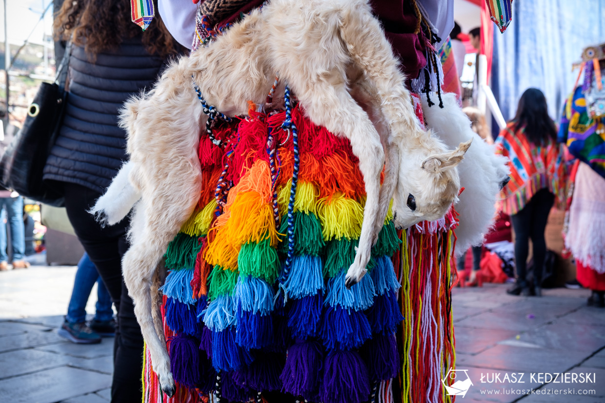 [ERRATA] Rozmawiałem z kilkoma przewodnikami. Każdy z nich powiedział, że martwe, małe lamy to zwierzęta, które naturalnie zmarły, a nie zostały zabite specjalnie na fiestę. Od bardzo dawna Inkowie mieli doskonałą wiedzę dotyczącą mumifikowania zwierząt, dlatego jak zwierzę padło, wypatroszyli je i teraz służy jako symbol i oddanie części lamom. Młodzi chłopcy nosili te lamy, aby uczcić ich cześć. Dużym honorem jest posiadania prawdziwej, wypchanej lamy, a nie chińskiej, sztucznej podróbki.