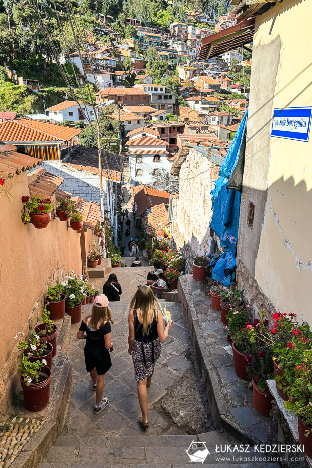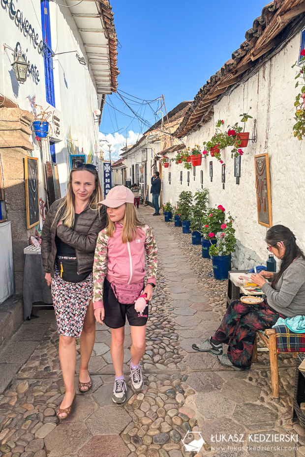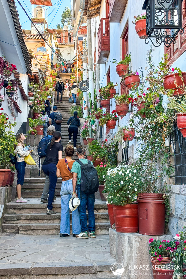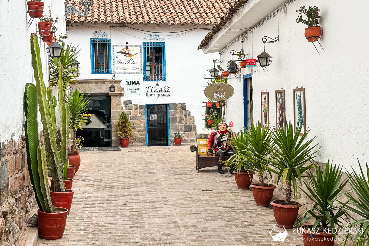 Każdy, kto, choć na chwilę odwiedza Cuzco, powinien przespacerować się po dzielnicy San Blas. To bardzo urokliwa i dosyć spokojna część gwarnego Cuzco. Mówią, że to dzielnica artystów. Na ulicach znajdziecie dużo ręcznie robionej biżuterii i ciekawych pamiątek. Do tego klimatyczne wąskie uliczki, gustownie urządzone knajpki i kawiarnie oraz duży porządek. Kolorowe ściany, dużo kwiatów i zieleni. Bardzo nam się tu podobało.