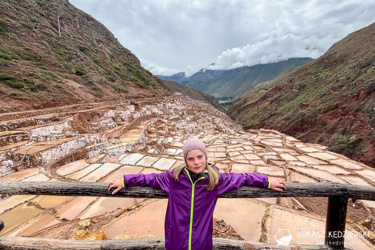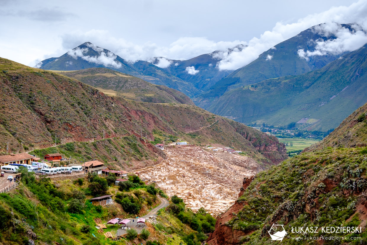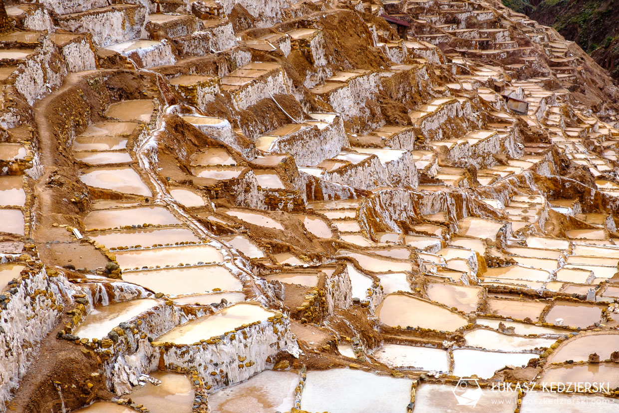 Nie obyło się bez przygód, gdy dojeżdżaliśmy po dosyć mocno rozmytej przez deszcz drodze prowadzącej do panwi solnych w Salinera de Maras, nagle zrobił się korek. Powodem był inny bus, który lekko osunął się z drogi i zatarasował cały przejazd. Wysiedliśmy i ostatnią część drogi pokonaliśmy pieszo. Salinera de Maras to kolejne ciekawe miejsce położone pośród urokliwych szczytów. Liczne panwie solne, z których pozyskuje się sól, wyglądają przepięknie.