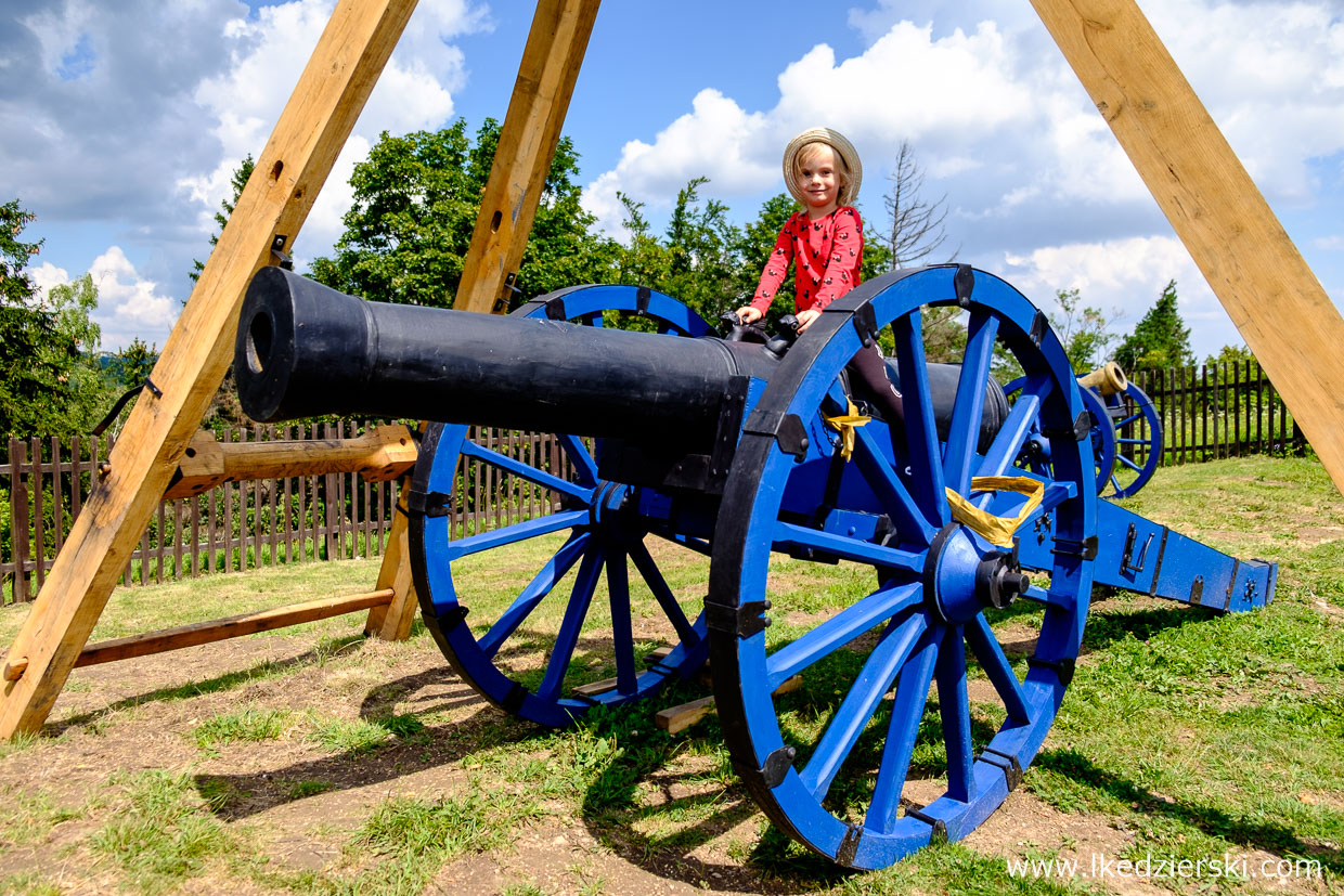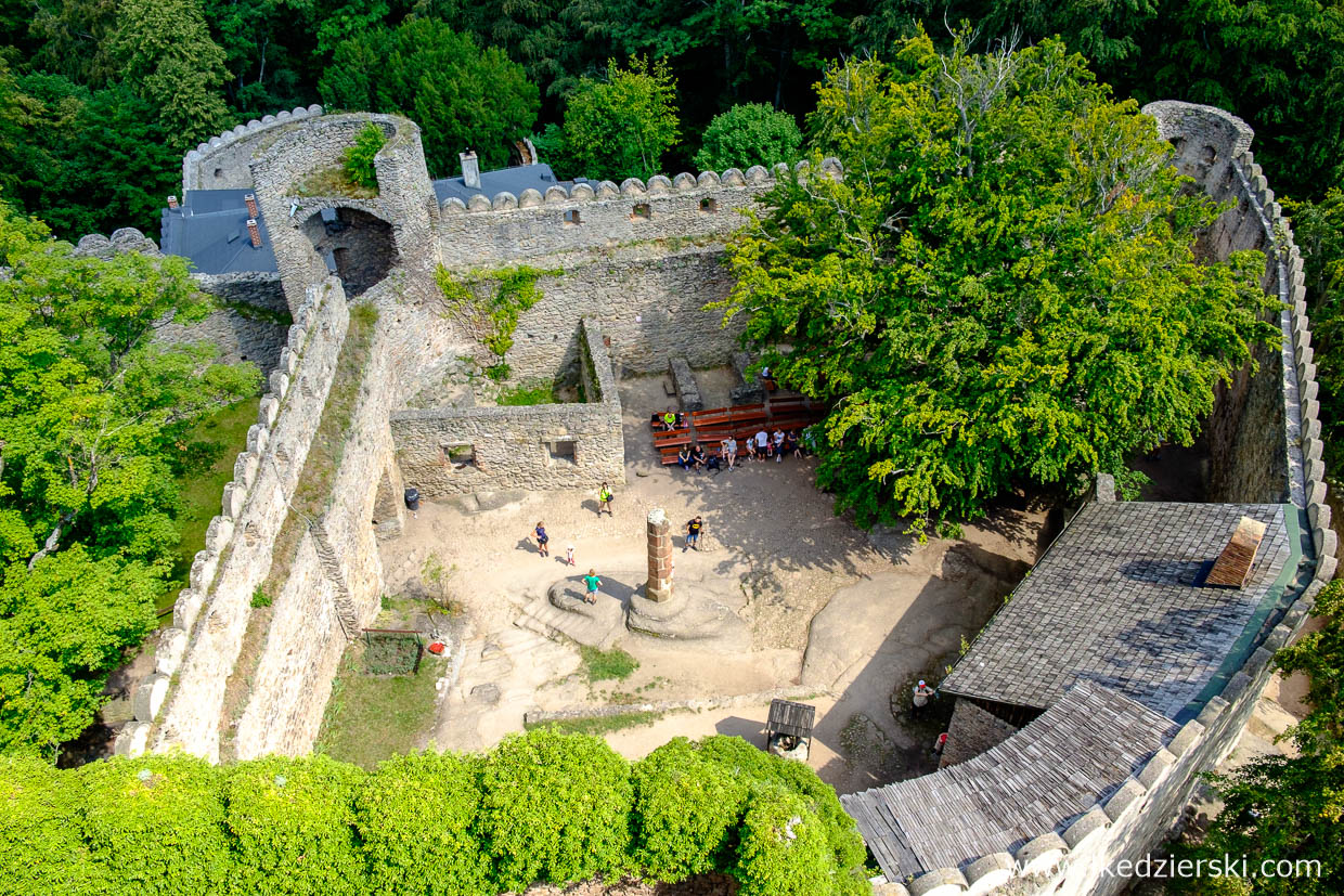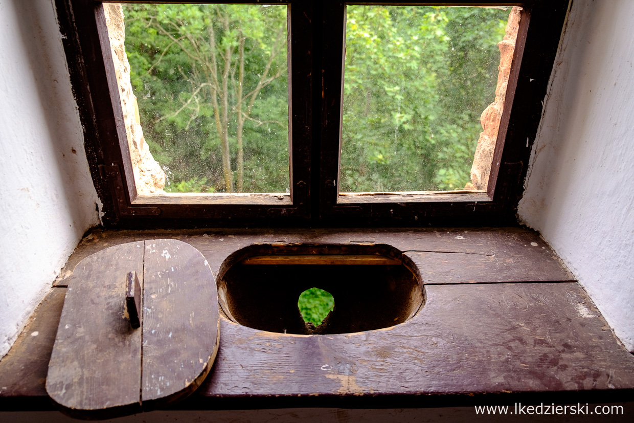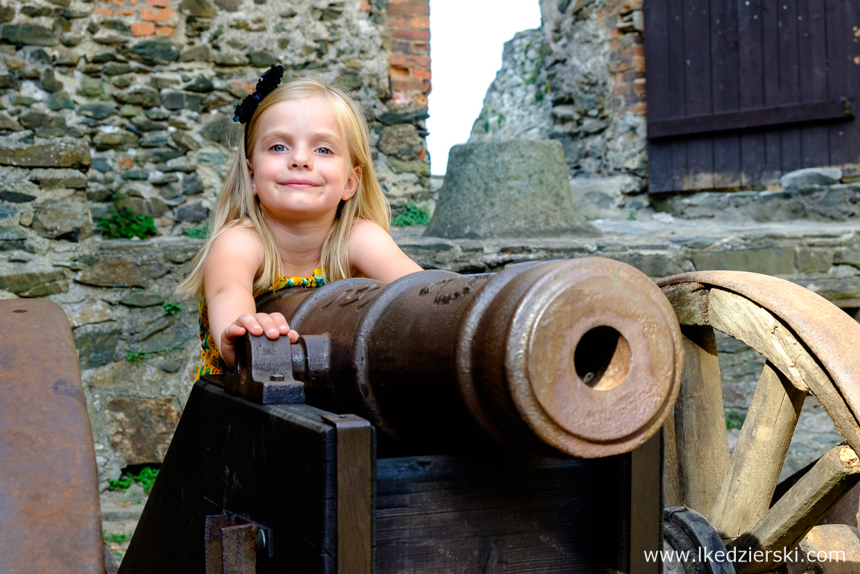 Po kilkuminutowym spacerze docieramy na szczyt wzgórza Choina, gdzie stoją pozostałości zamku Grodno. Co godzinę odbywa się zwiedzanie z przewodnikiem, który z wielkim zaangażowaniem i olbrzymią wiedzą oprowadzi nas po poszczególnych komnatach. Dzieciom (i nie tylko) w pamięć zapadnie Sala Mokra. Znajduje się w niej ściana, która przed burzą robi się wilgotna. Jednak najważniejsze jest to, że gdy dotknie się ścianę lewą ręką i pomyśli życzenie, to w najbliższej przyszłości, spełni się – przynajmniej tak twierdzi przewodnik 😊. Dodatkowo pamiętajcie, aby odnaleźć wychodek – bardzo ciekawe i oryginalnie położone miejsce. W poszczególnych salach znajdują się eksponaty, malowidła i zbroje. Zwieńczeniem wycieczki jest wejście na szczyt wieży (po około 100 schodach), aby móc podziwiać piękne widoki.