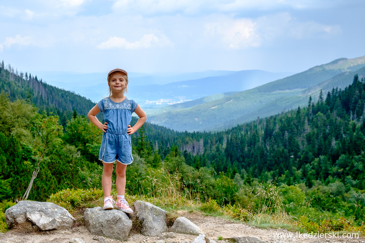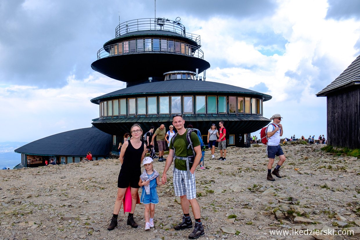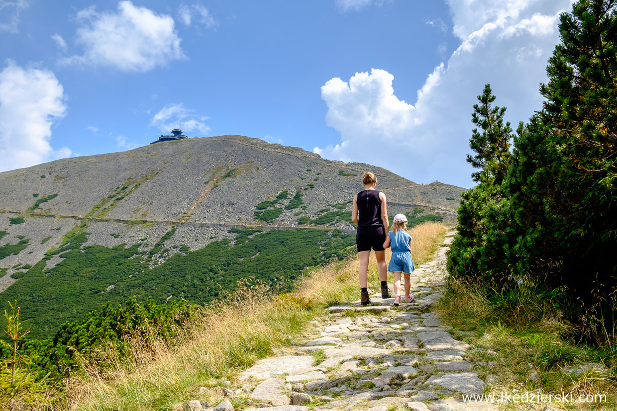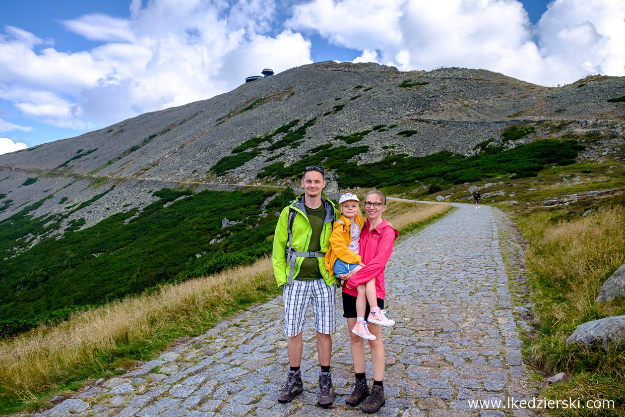 Wybraliśmy według nas najciekawszą opcję, czyli przepięknie położony czerwony szlak (Główny Szlak Sudecki) poprowadzony przez Dolinę Łomniczki. Przepiękne widoki i okoliczne panoramy przypominają trochę Dolinę Pięciu Stawów Polskich w Tatrach. Dla osób, które uważają, że jest to zbyt trudne, aby wejść na szczyt Śnieżki z samego Karpacza, napiszemy tylko, że cały szlak pokonaliśmy z 5,5-letnią Nadią, która całą trasę pokonała na własnych nóżkach. Wejście, włącznie z przerwami i długim postojem na pyszne naleśniki z jagodami w Schronisku nad Łomniczką (nie można ominąć tego miejsca) zajęło nam trochę mniej niż 4 godziny (dokładnie 3h50min). Nie było żadnego marudzenia, bo sceneria podczas drogi zapiera dech w piersiach. Piękne widoki na majestatyczną Śnieżkę z kosmiczną budowlą na szczycie, idealnie błękitne niebo z ogromnymi śnieżnobiałymi chmurami. Czego chcieć więcej?