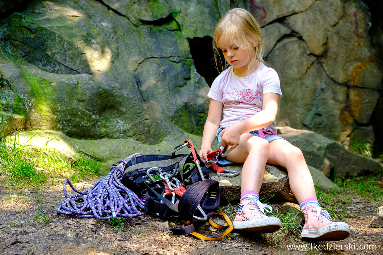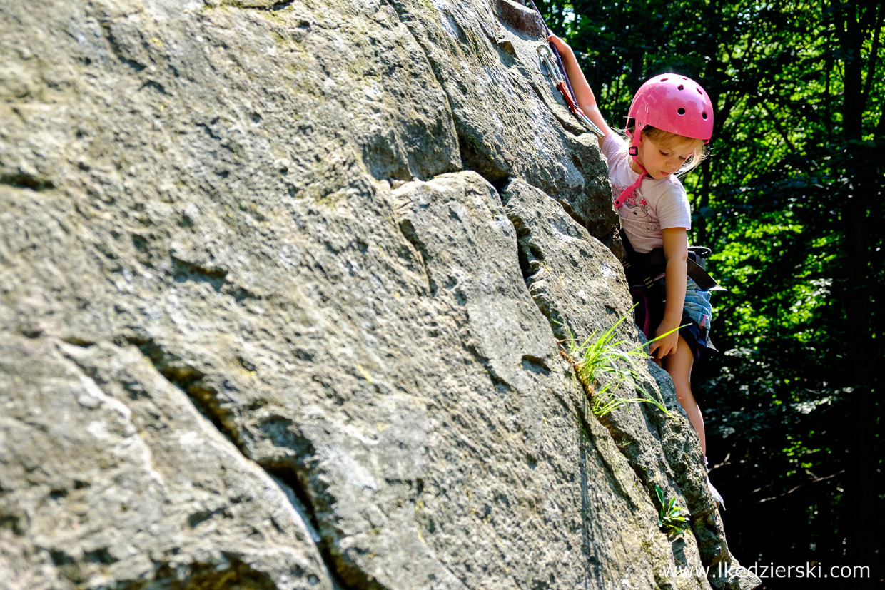 Krótki spacer ścieżką i jesteśmy pod skałą. Ubieramy się w sprzęt, zawieszam linę i nasza mała, dzielna Nadia zaczyna swoją przygodę ze wspinaniem w naturalnej skale. To zupełnie coś innego niż „panel”. Dookoła piękna przyroda, świeże powietrze i super atmosfera. Nie chodzi o cyferki czy trudności drogi wspinaczkowej, a o przyjemność obcowania w aktywny sposób w naturalnym środowisku. Kolejne przechwyty i pokonywanie swoich słabości i olbrzymia satysfakcja na końcu, że wspięło się na skałę, która z dołu wyglądała, zupełnie nie do zdobycia. Często jest tak, że na jednej skale jest droga bardzo trudna, a zaraz obok, dosłownie metr dalej, jest droga o kilka klas łatwiejsza. Mam nadzieję, że namówiliśmy Was do spróbowania swoich sił.