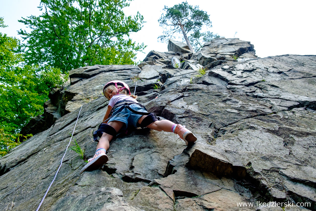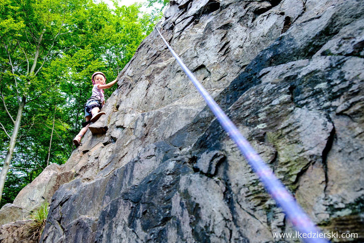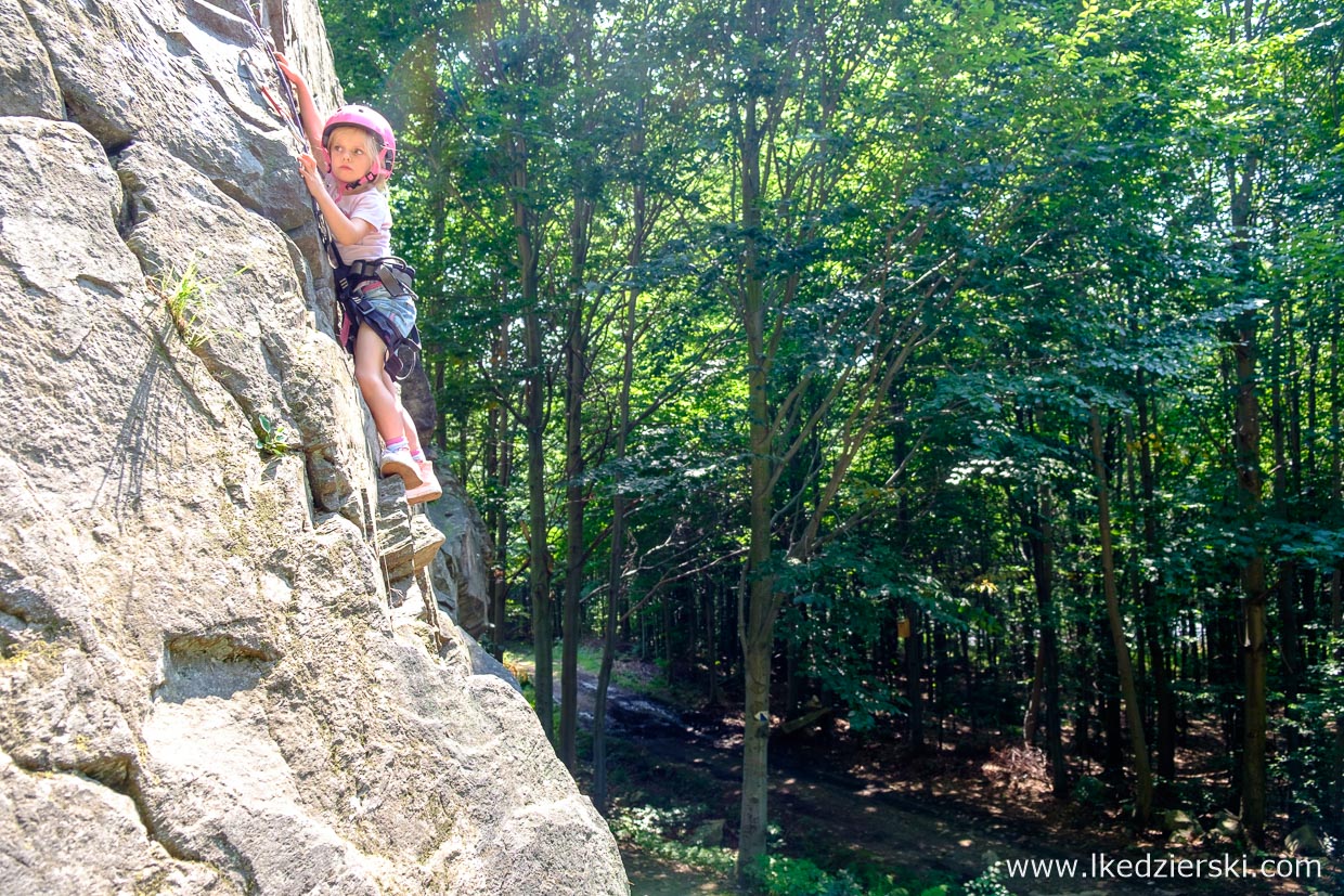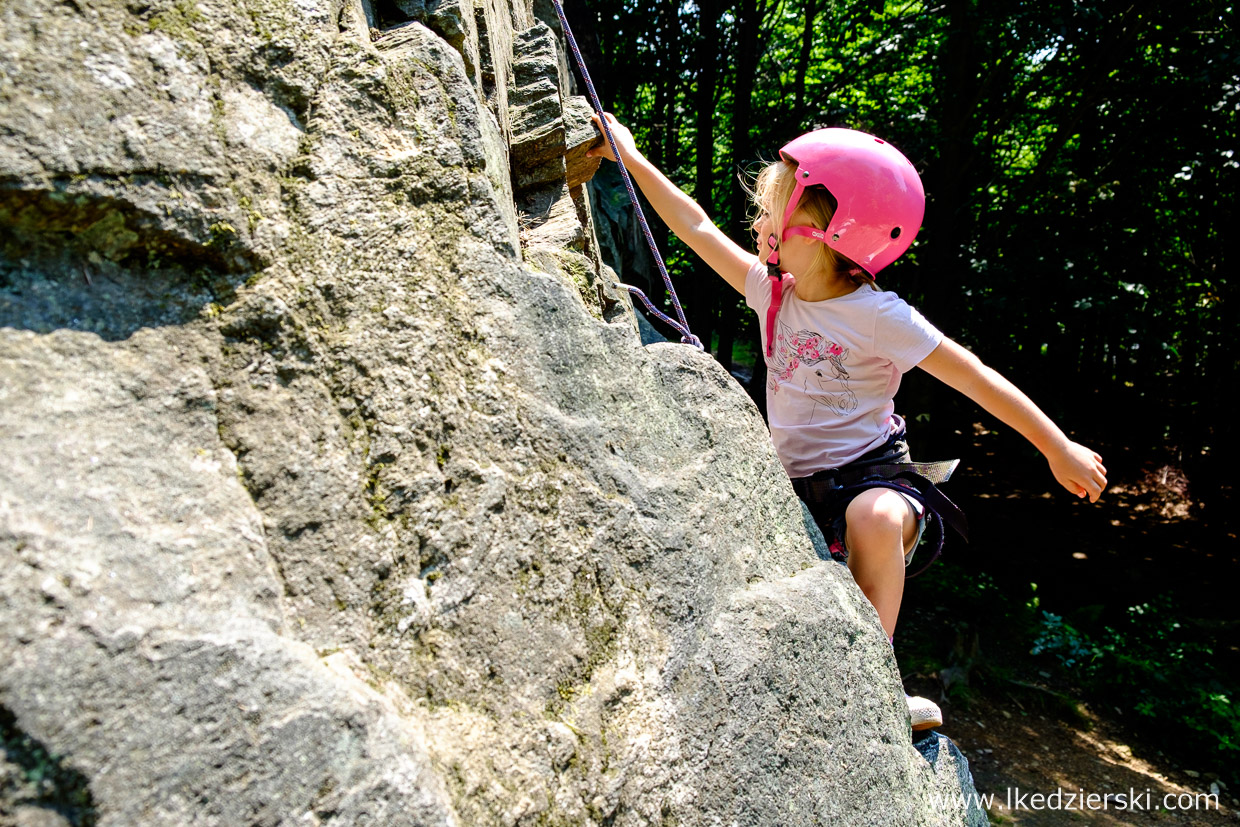 Macie ochotę na coś ekstremalnego? Próbowaliście kiedyś wspinaczki? Nie mówię o pójściu na popularne w miastach Dolnego Śląska sztuczne ścianki wspinaczkowe, lecz o prawdziwej skale? Dla wielu wspinaczy Sokoliki (przepiękny teren położony w Rudawach Janowickich, gdzie uprawia się wspinaczkę skalną na granitowych turniach) to w sezonie drugi dom. My jednak wybraliśmy się na „rodzinne wspinanie”. Będąc w Kotlinie Kłodzkiej w Jaskini Radochowskiej, mieliśmy tzw. rzut beretem do Skałek Lądeckich. Teren w okolicach Lądka-Zdrój to kilka różnych gnejsowych skał, które pokrywa kilkadziesiąt tras wspinaczkowych o różnych stopniach trudności.