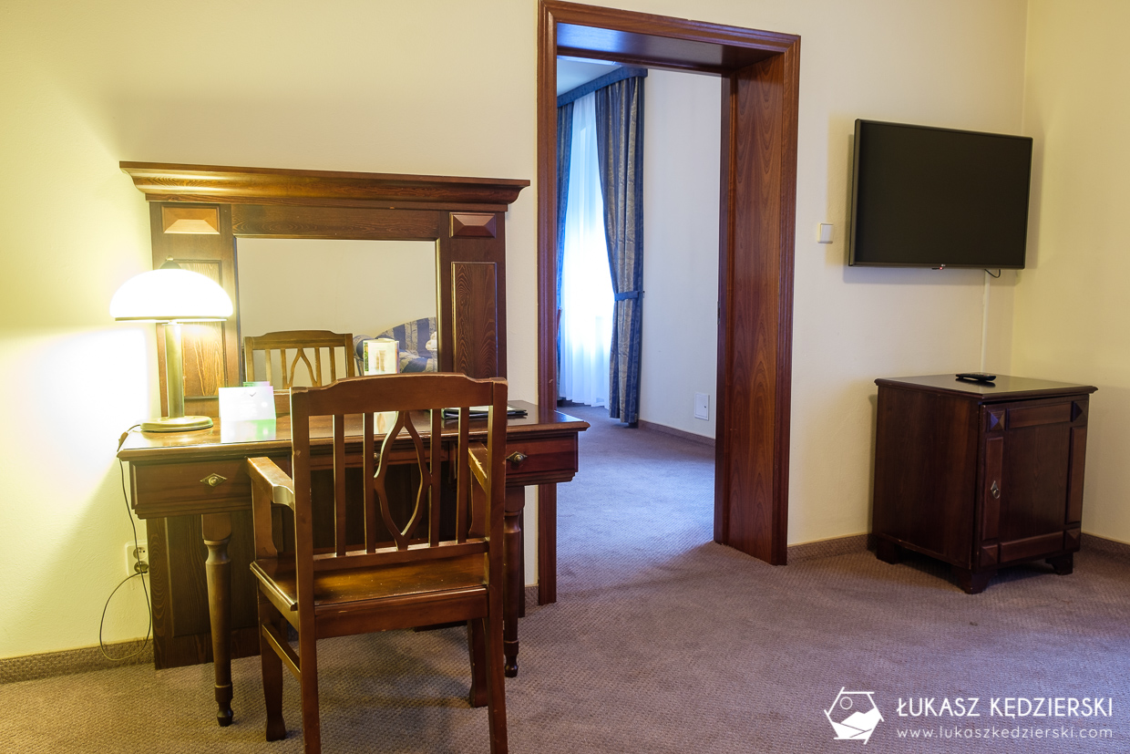 My, do dyspozycji mieliśmy apartament hotelowy, który składał się z dwóch pomieszczeń oraz łazienki. W pokoju dziennym znajduje się rozkładana sofa, na której spała Nadia, biurko, fotele i stolik oraz telewizor i lodówka, a w sypialni duże podwójne łóżko oraz szafa. W łazience do dyspozycji mieliśmy prysznic. Apartament był przestronny i bardzo wygodny.