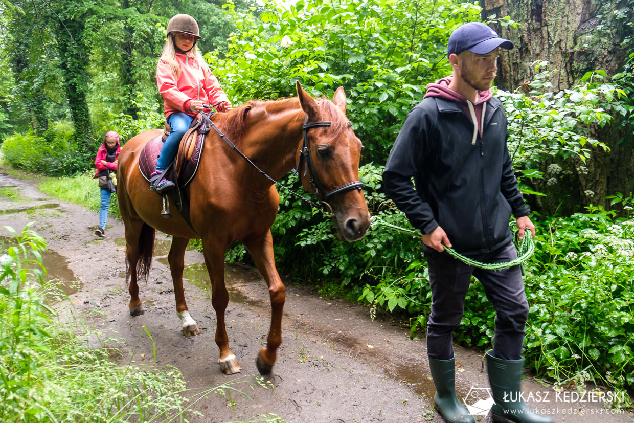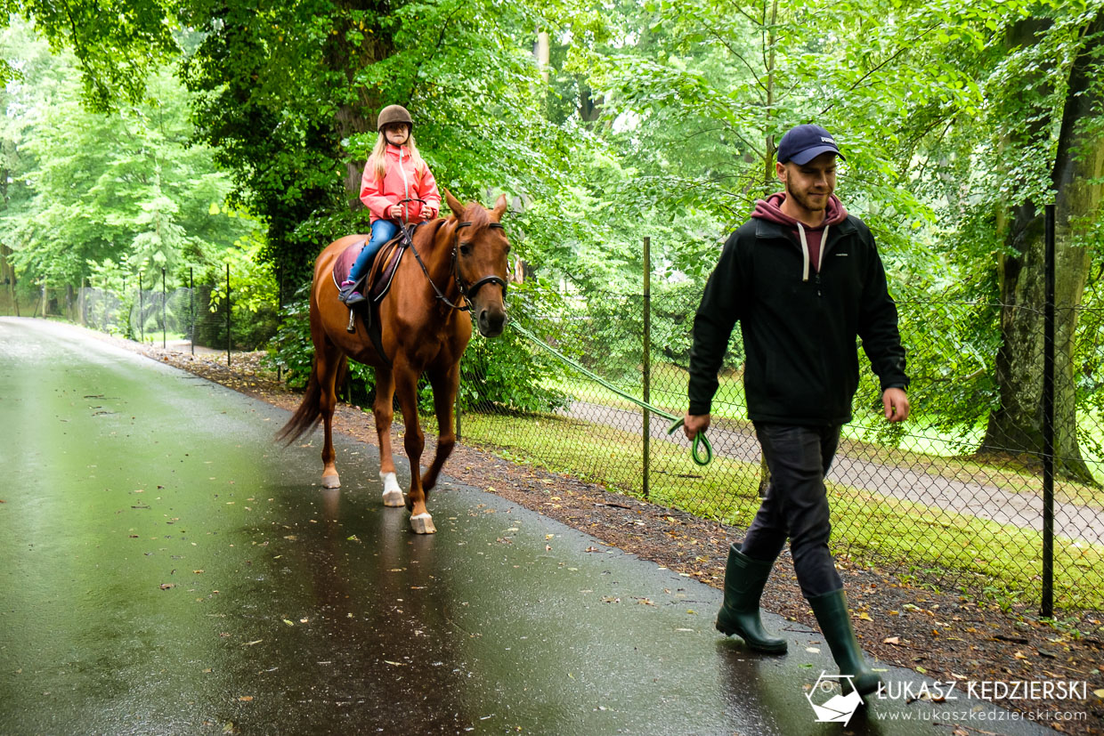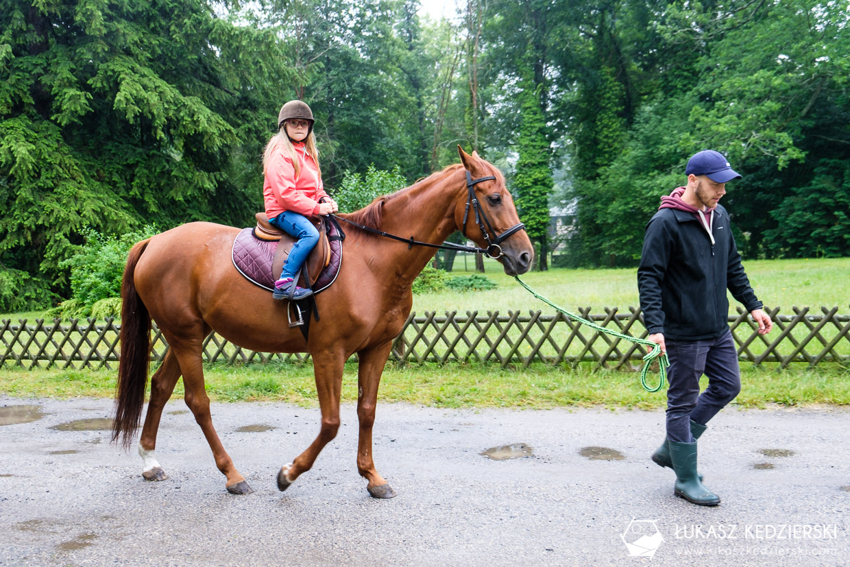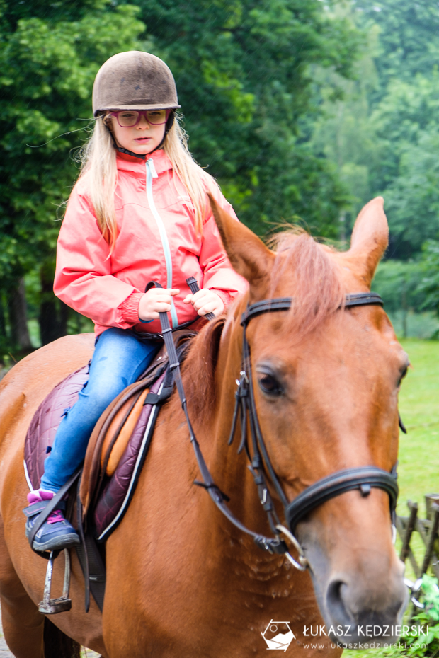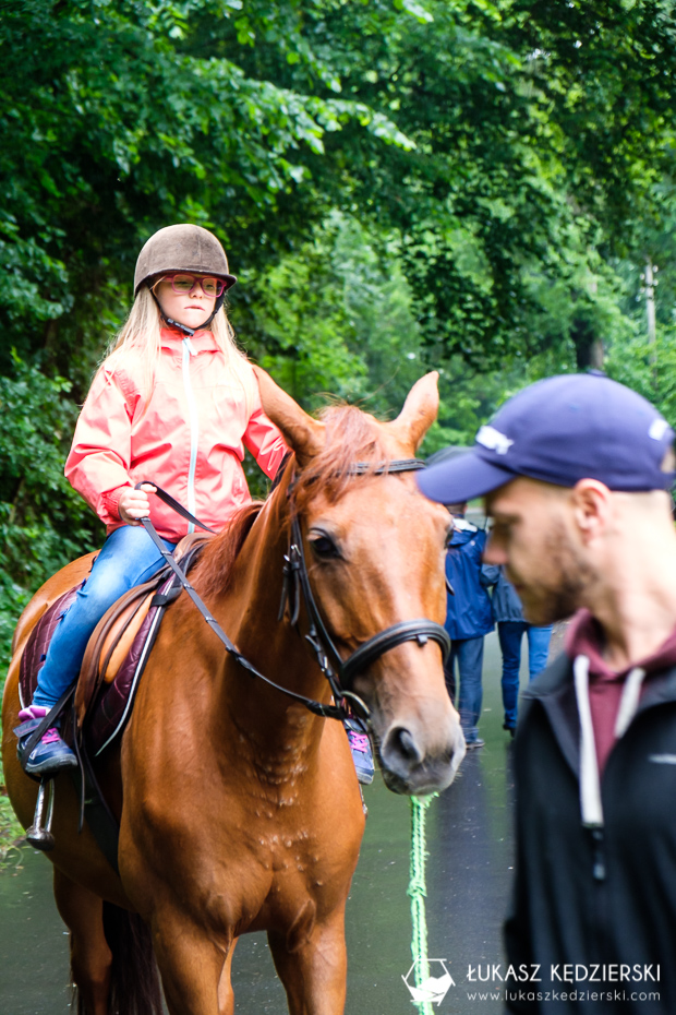 Spokojny spacer w okolicach zamku, po leśnych ścieżkach, wśród pięknej zieleni to doskonały sposób na zaznajomieniu się z końmi. Dumna Nadia cieszyła się, że po krótkiej przejażdżce, Sara ją słucha i umie już skręcać, zatrzymywać się i startować. Taka godzinna przejażdżka dla dziecka to doskonała zabawa i nauka współpracy z koniem.