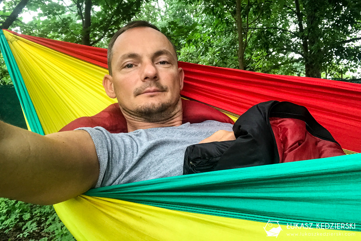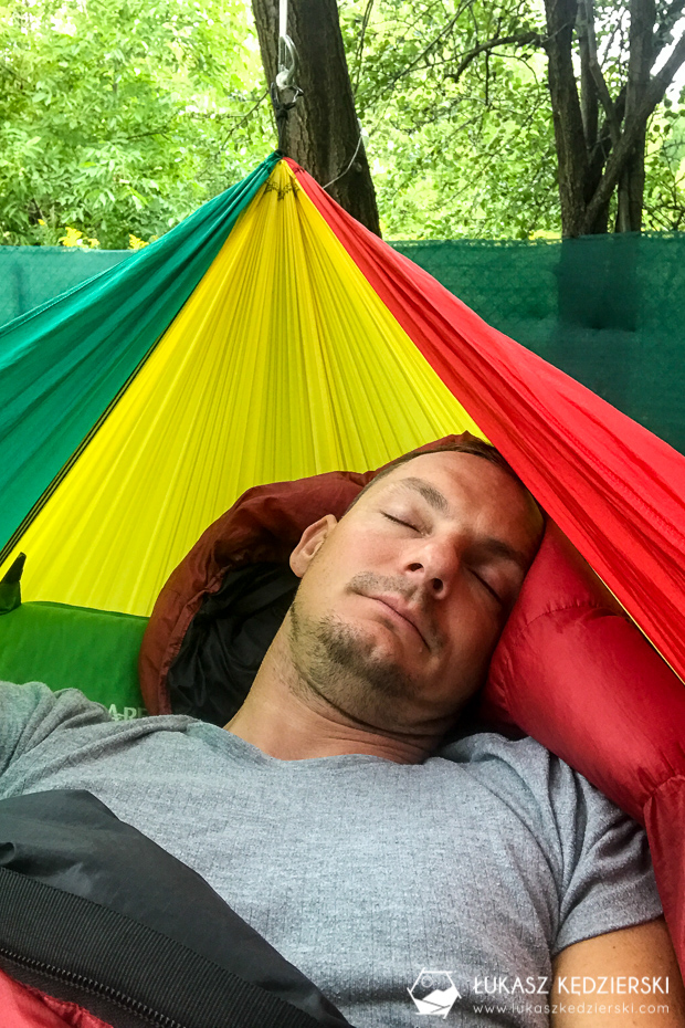 Jeżeli chodzi o spanie w hamaku, to jest całkiem wygodnie. Wiadomo, że kluczowe jest prawidłowe rozwieszenie. Producent zaleca, aby kąt punktu mocowania linek hamaka wynosił ok. 30 stopni i obie strony powinny być zawieszone na tej samej wysokości, aby w nocy się nie zsuwać. Najpierw pompuję matę, która wkładam pod plecy (aby nie było zimno), śpiwór i wskakuję do środka. Podobno najlepiej przyjąć pozycję w poprzek hamaka, co daje największy komfort, lecz jestem początkującym i na razie spałem wzdłuż. Nocleg był komfortowy i przyjemny. Na pewno przede mną jeszcze wiele nocy w hamaku i nowych doświadczeń. Na pewno muszę poszukać jakiś fajny tarp, aby być uniezależnionym od opadów podczas nocowaniu w hamaku.