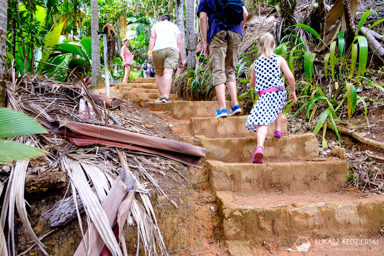 Dojechaliśmy do bram parku lokalnym autobusem, kupiliśmy bilet i międzynarodowa grupa z przewodnikiem tuszyła na spacer po „lesie”. Przewodnik opowiadał wiele o samej palmie, jej owocach (ich waga dochodzi do ok. 30 kg i rosną ok. 7 lat), a także o innych roślinach jak cynamon, wanilia itd… Bardzo fajna wycieczka – polecamy każdemu.