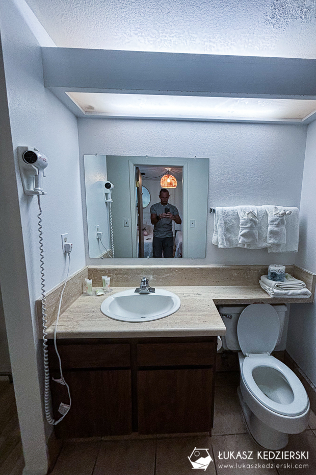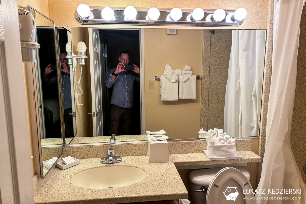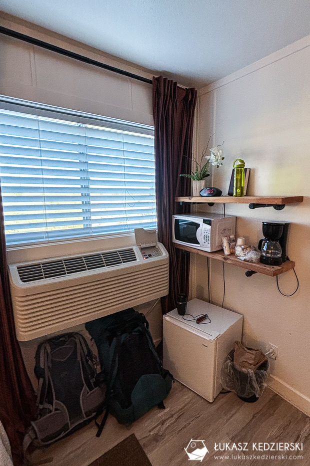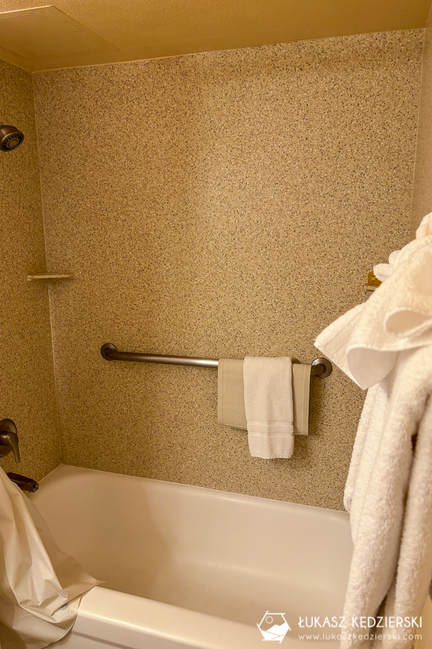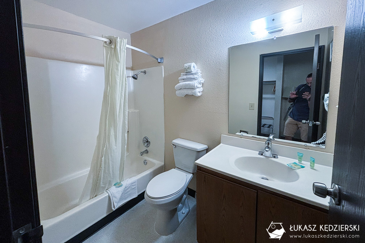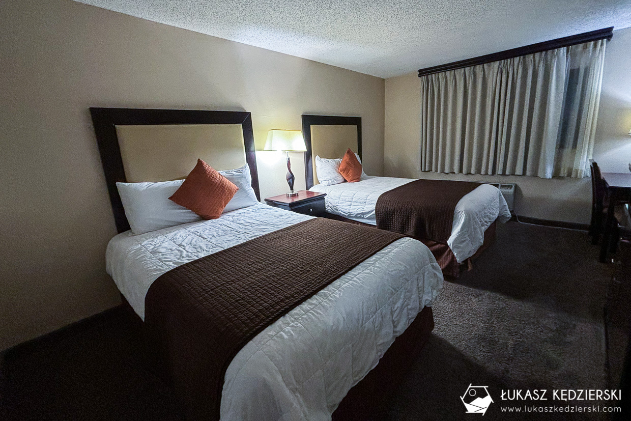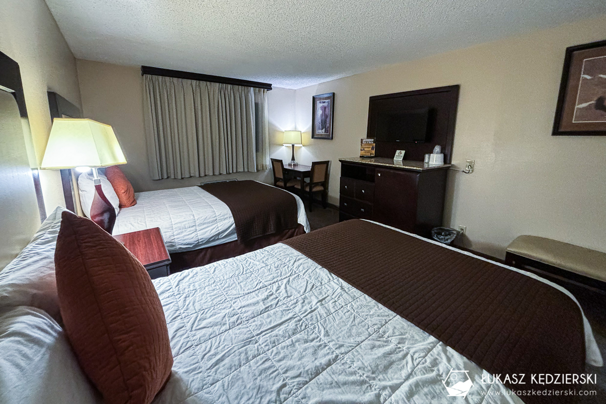 Nocleg położony w stosunkowo niedużej odległości od bram Bryce Canyon NP. Dojazd do bram parku zajmuje zaledwie 10 min, więc uważamy, że lokalizacja jest super. Do dyspozycji mieliśmy jasny pokój z dwoma wielkimi łóżkami, szafą oraz łazienką z prysznicem. Do tego był mały kącik z mikrofalówką, ekspresem do kawy i małą lodówką. Przy recepcji przez całą dobę była dostępna darmowa kawa i herbata. Przy samym obiekcie znajduje się restauracja, lecz nie mieliśmy okazji z niej skorzystać.