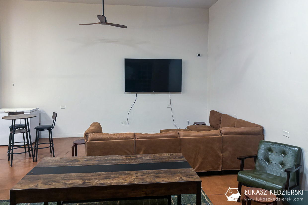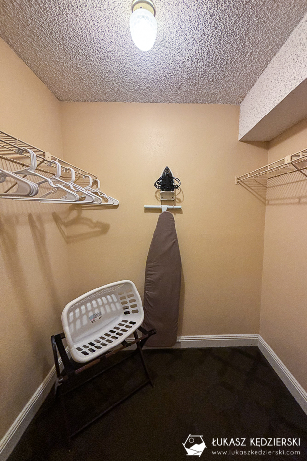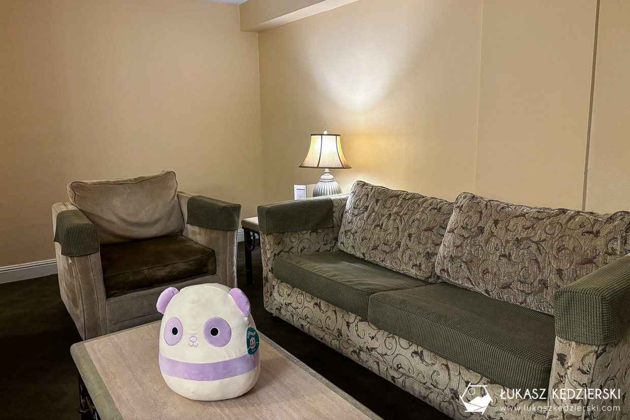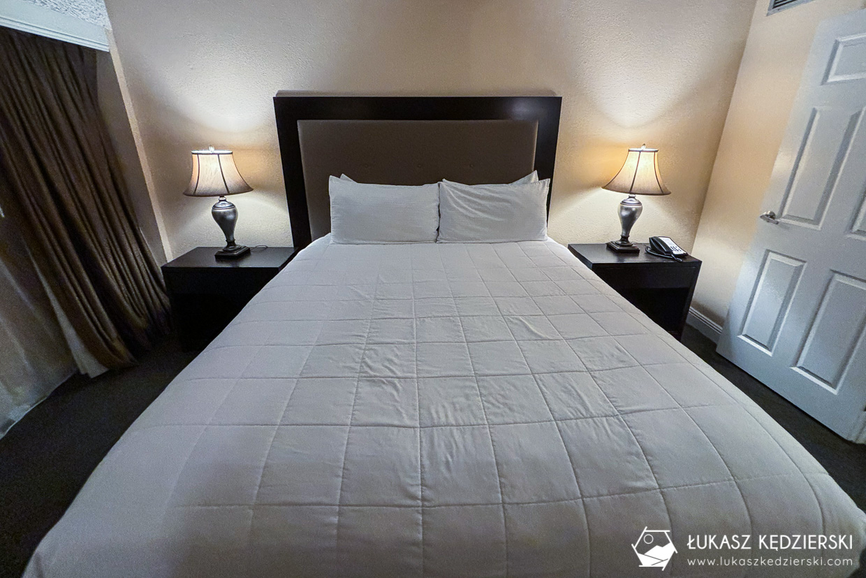 Do dyspozycji mamy spory salon z w pełni wyposażonym aneksem kuchennym, duża sypialnia z wielkim łóżkiem, dwie obszerne szafy oraz łazienkę z wanną z prysznicem (taki amerykański standard). W obiekcie znajduje się także basen, z którego nie zdążyliśmy skorzystać. Wszędzie jest bardzo czysto, cicho i przyjemnie, choć wystrój nie jest zbyt nowoczesny i kojarzy nam się z serialowym salonem „Świat według Bundych”. W obiekcie jest całkiem nieźle działające WiFi. Nocleg zdecydowanie polecamy ze względu na cenę, lokalizację i darmowy parking.