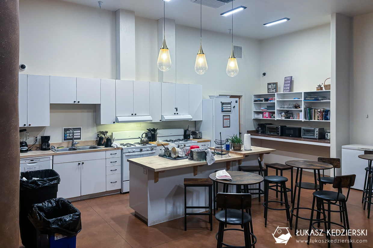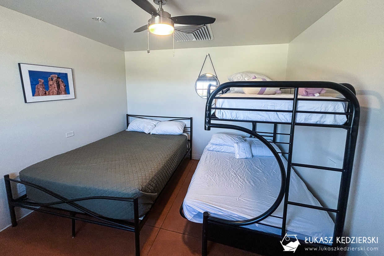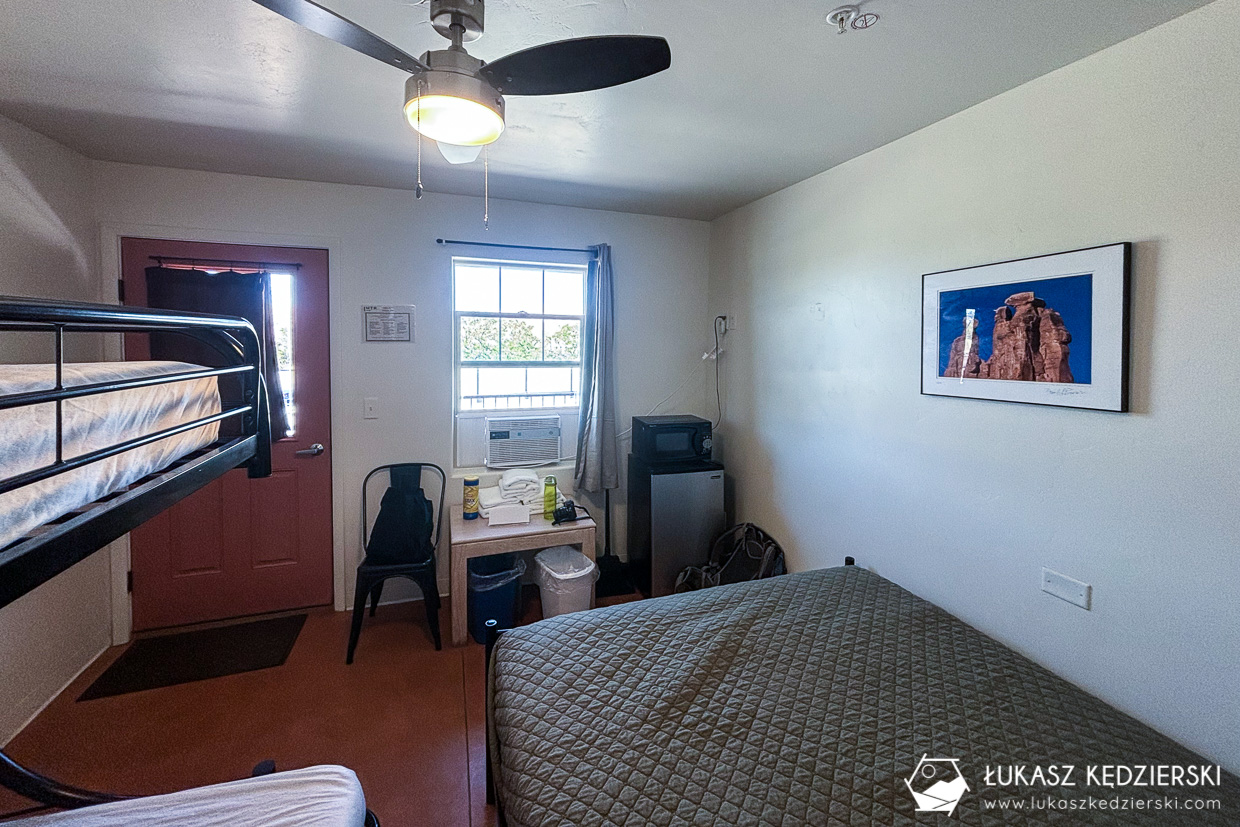 Nocleg w Moab to klasyczny motel położony przy głównej drodze. Stąd do bram parku dzieli nas zaledwie 15 min jazdy samochodem. Pokój nie był zbyt duży, ale znajduje się w nim duże małżeńskie i piętrowe łóżko. Łazienki są wspólne. Jest tam kilka pryszniców dla pań i panów. Znajdziemy tam także kosmetyki: żel pod prysznic, szampon, a także balsam do ciała. Do dyspozycji gości jest duża wspólna kuchnia i salon wypoczynkowy oraz miejsca na grilla. W obiekcie oczywiście jest działające WiFi. Niedaleko znajdują się knajpki, sklepy i supermarkety.
