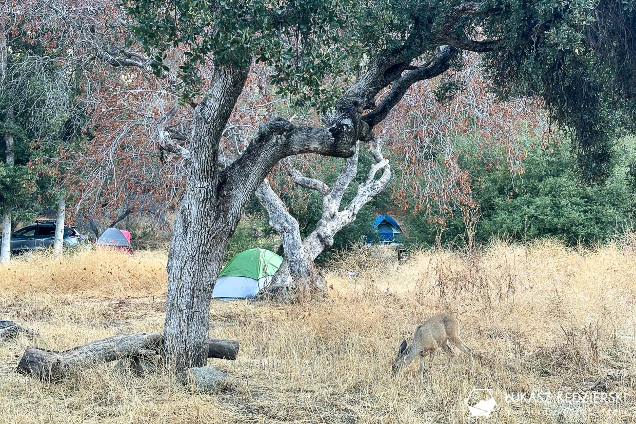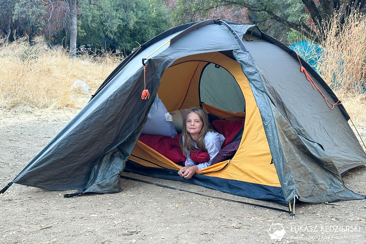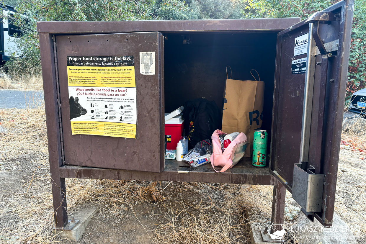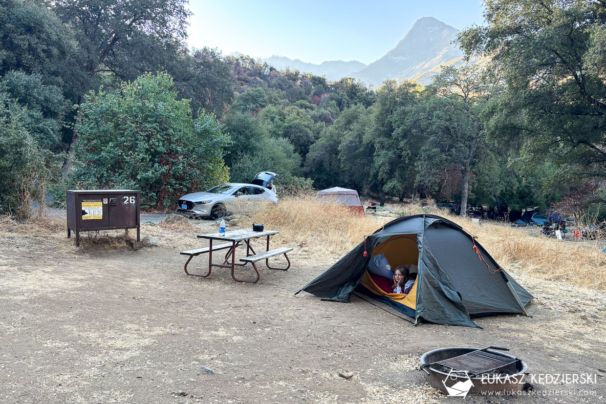 Na terenie parku Sequoia & Kings Canyon National Parks jest kilka różnych pól namiotowych. Zdecydowaliśmy się na ten, gdyż był położony blisko interesujących nas atrakcji i przede wszystkim był najbliżej naszej drogi powrotnej w stronę Las Vegas. Zarezerwowane przez nas miejsce było standardowo wyposażone w stolik piknikowy, miejsce na ognisko z kratką grillową, miejsce pod namiot i zaparkowanie samochodu oraz obowiązkowo metalową skrzynkę, tzw. bearbox, gdzie należy przechowywać całe jedzenie, kosmetyki i generalnie wszystko, co „pachnie”. Należy pamiętać, że to teren występowania niedźwiedzi. Większość miejsc jest zacieniona, gdyż dookoła rosną piękne drzewa. Wspólne toalety były dosyć czyste, a woda pitna nie posiadała niedobrego smaku.