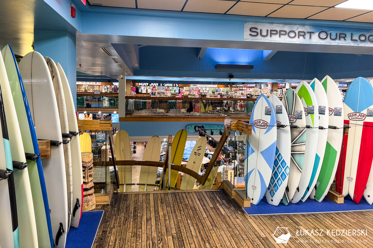 W Cocoa Beach znajduje się podobno najbardziej kultowy sklep surferski Ron Jon’a. Ten sklep prowadzony jest od 1961 roku i powstał jako „jedyny w swoim rodzaju”. To olbrzymia powierzchnia, na której kupimy oczywiście deski surfingowe i wszelkie możliwe elementy wyposażenia potrzebnego na plaży. Są markowe rzeczy, kolaboracje z wielkimi markami. Jest tu po prostu wszystko. Weszliśmy, tu w drodze z kolacji, aby zobaczyć wnętrze tego kultowego miejsca.